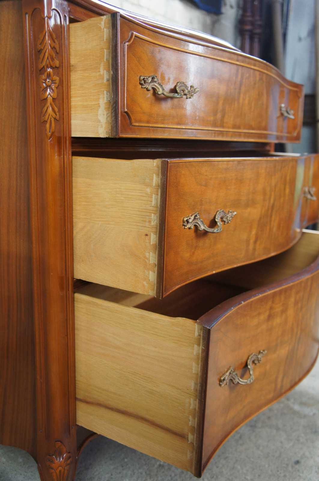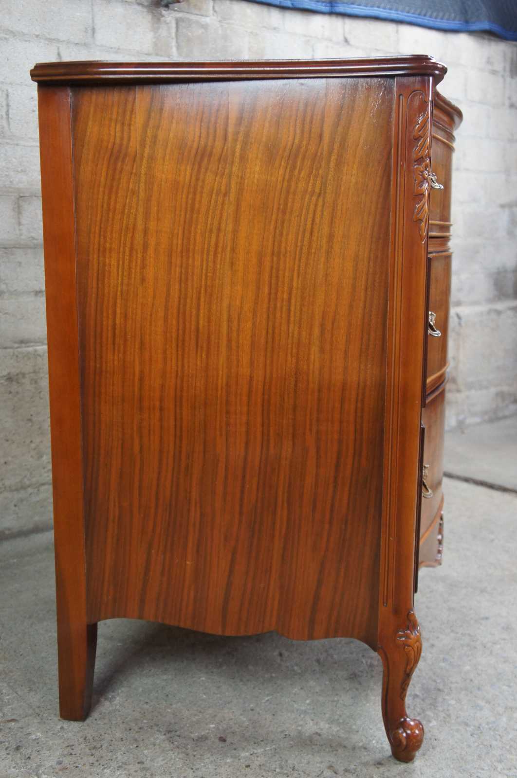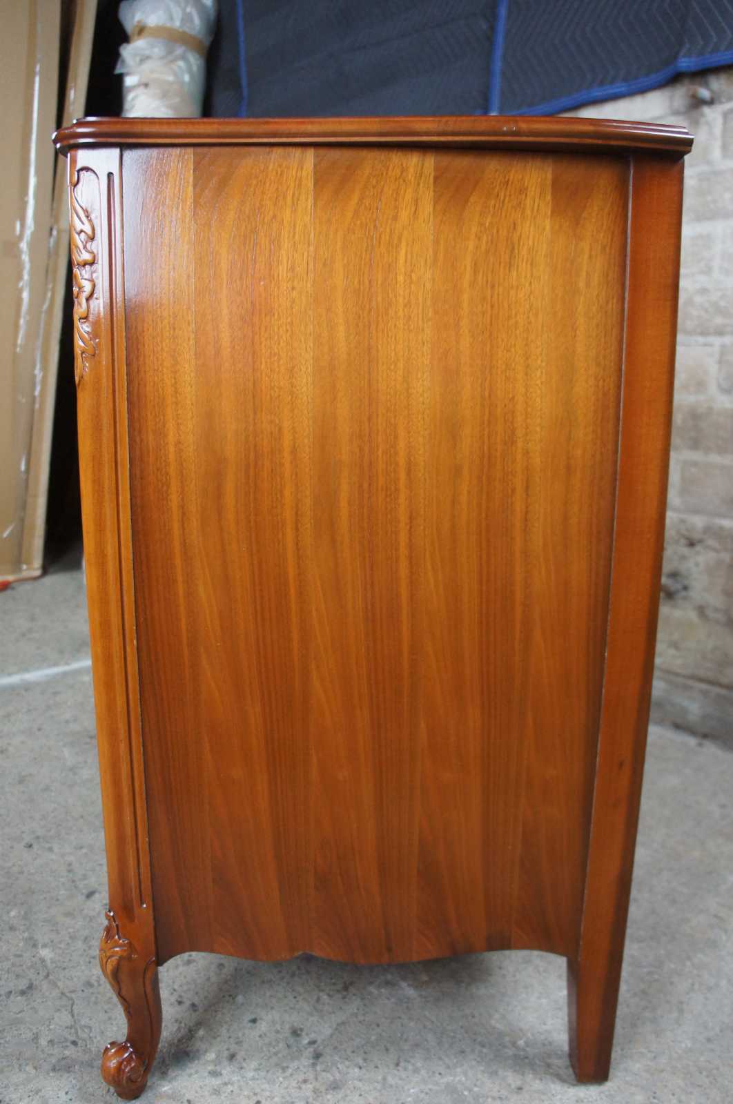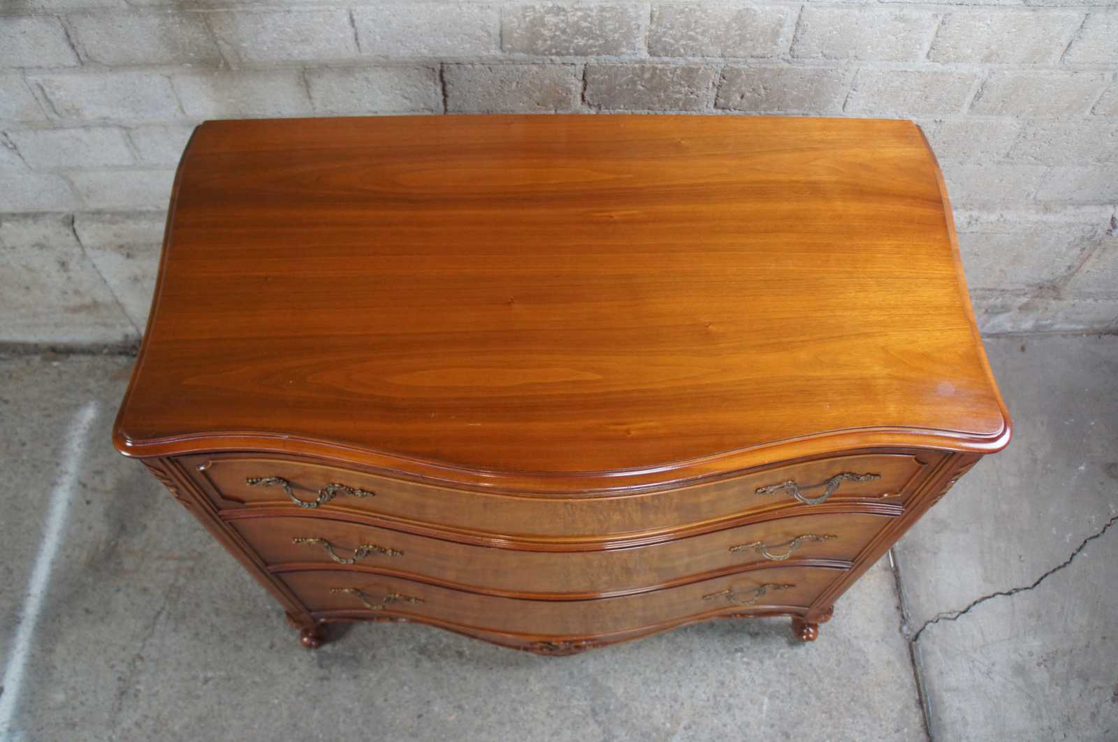 Circa 1940s Mount Airy buffet, server or chest. Made from walnut with a serpentine front and crotch veneered drawers. Features carved accents, scalloped brass hardware, cabriole legs and glass top.