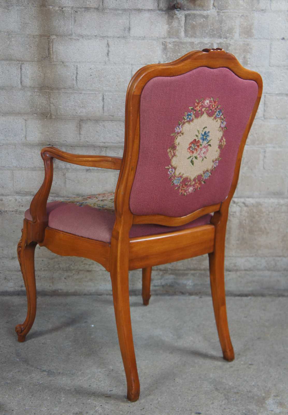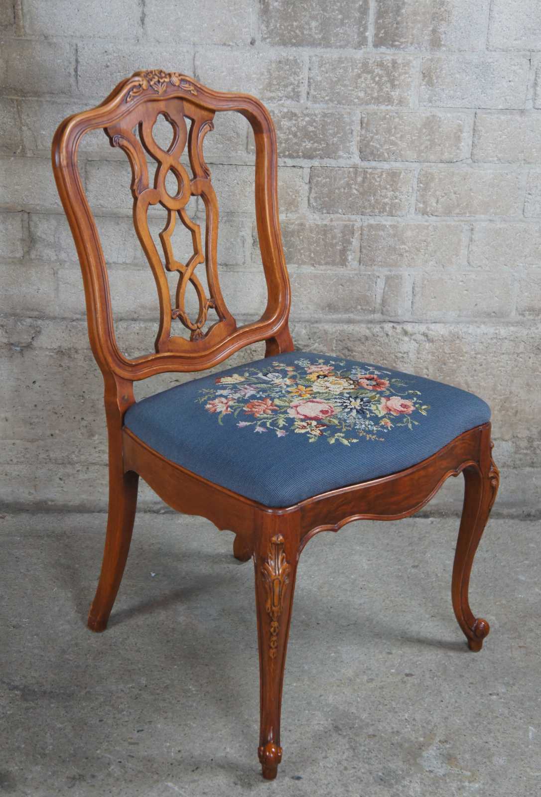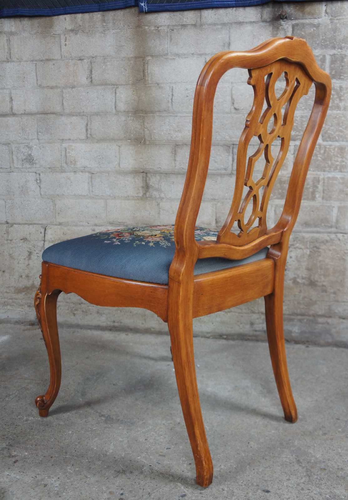 Circa 1940s Mount Airy needlepoint dining chairs. Made from walnut with open pierced splat, carved accents, cabriole legs and needlepoint seats. Mount Airy of North Carolina's roots go back to 1888 when the lumber and woodworking industry was booming. They had three large factories and quickly evolved into specialized furniture suites. They enjoyed a successful run until 1997 when a fire completely destroyed their facilities.