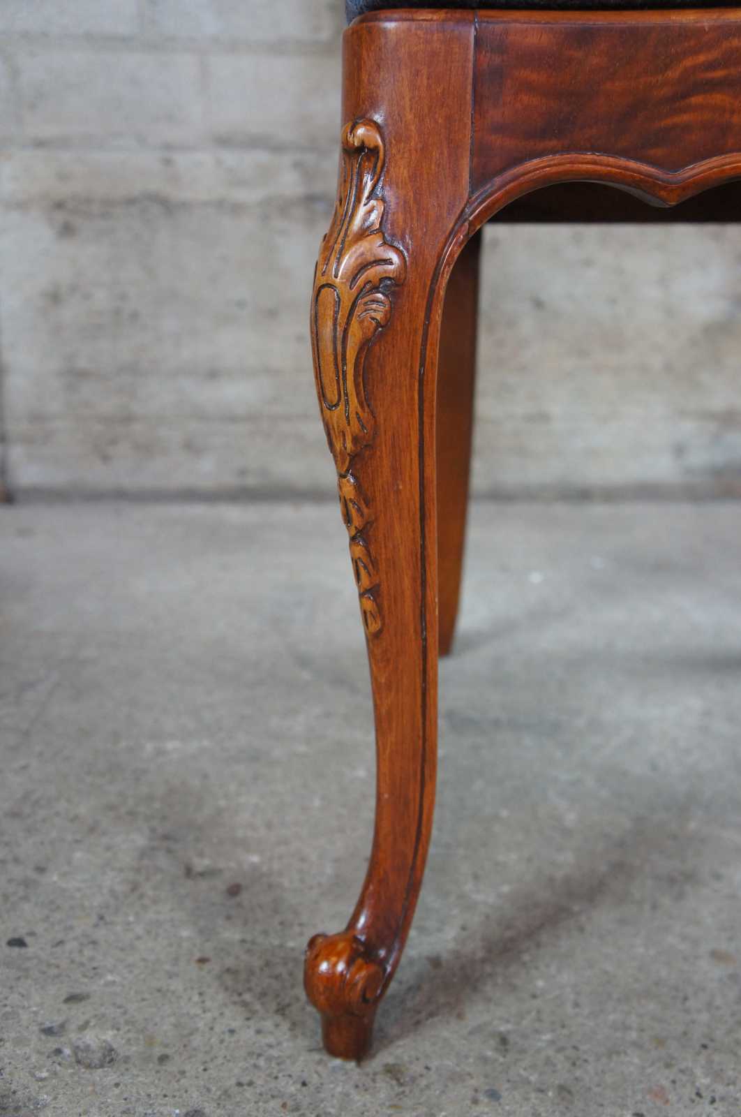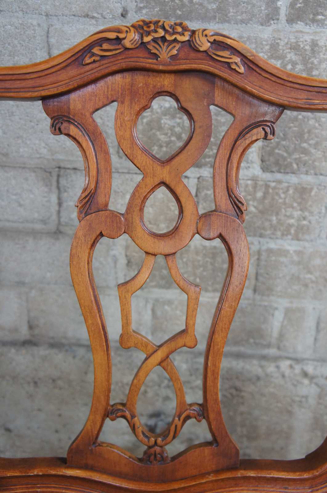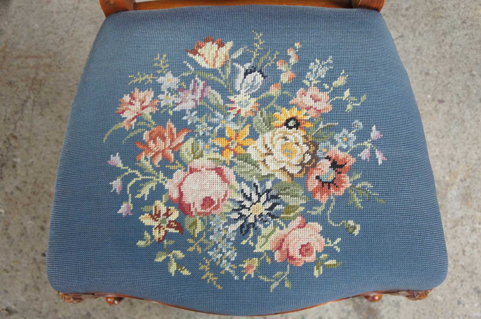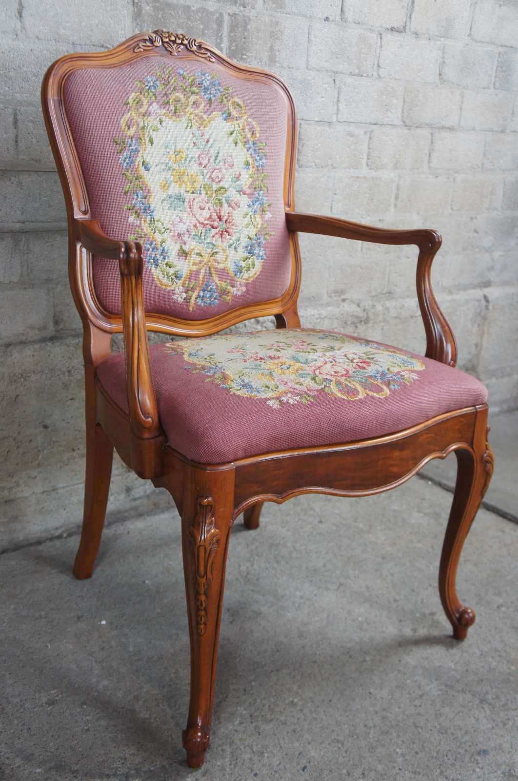 Circa 1940s Mount Airy needlepoint dining chairs. Made from walnut with open pierced splat, carved accents, cabriole legs and needlepoint seats. Mount Airy of North Carolina's roots go back to 1888 when the lumber and woodworking industry was booming. They had three large factories and quickly evolved into specialized furniture suites. They enjoyed a successful run until 1997 when a fire completely destroyed their facilities.
