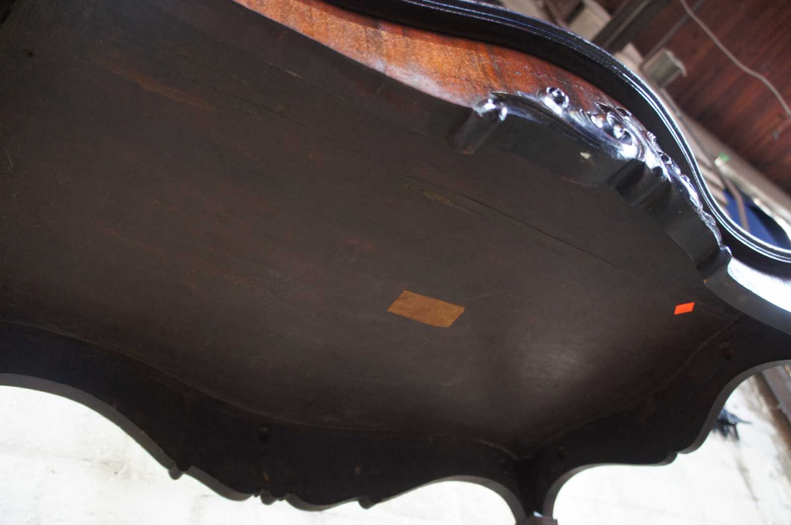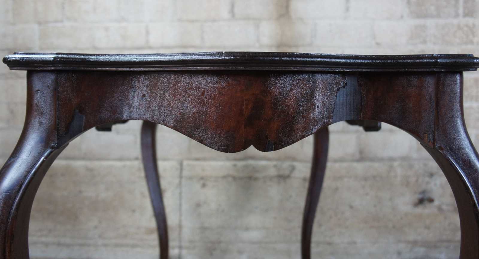 Circa 1940s French Provincial side table or desk. Features a serpentine top over a scalloped apron and long swooping cabriole legs.