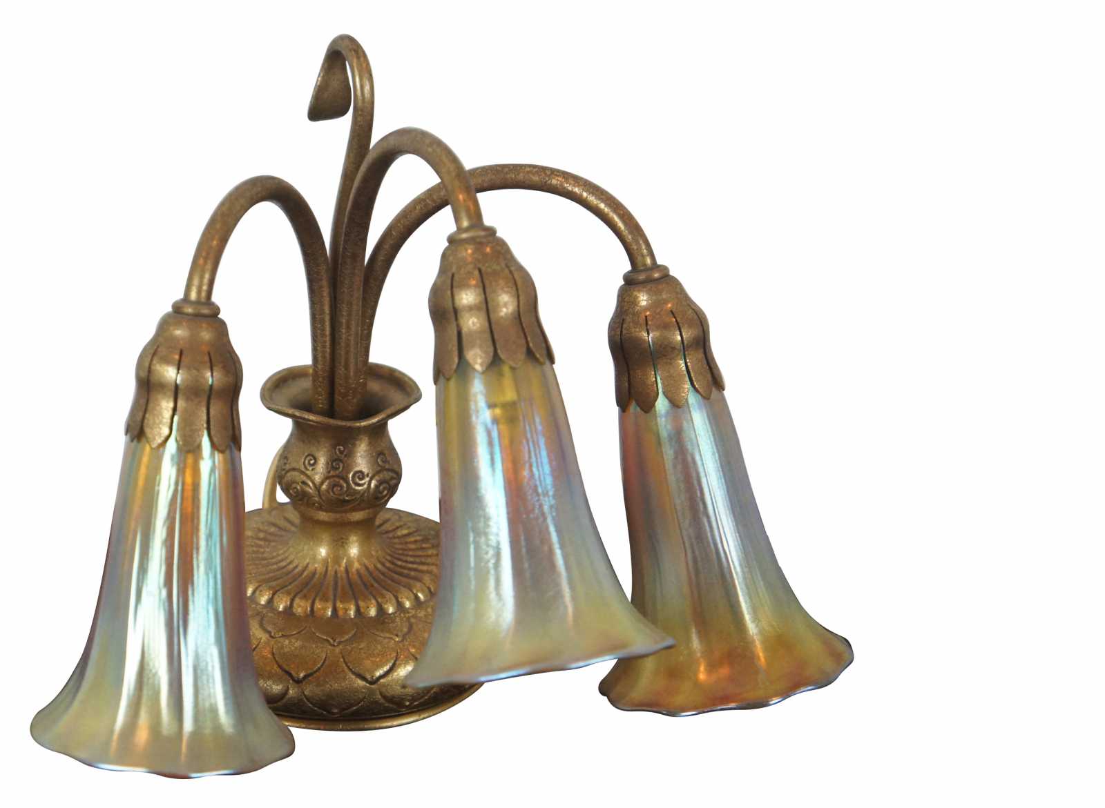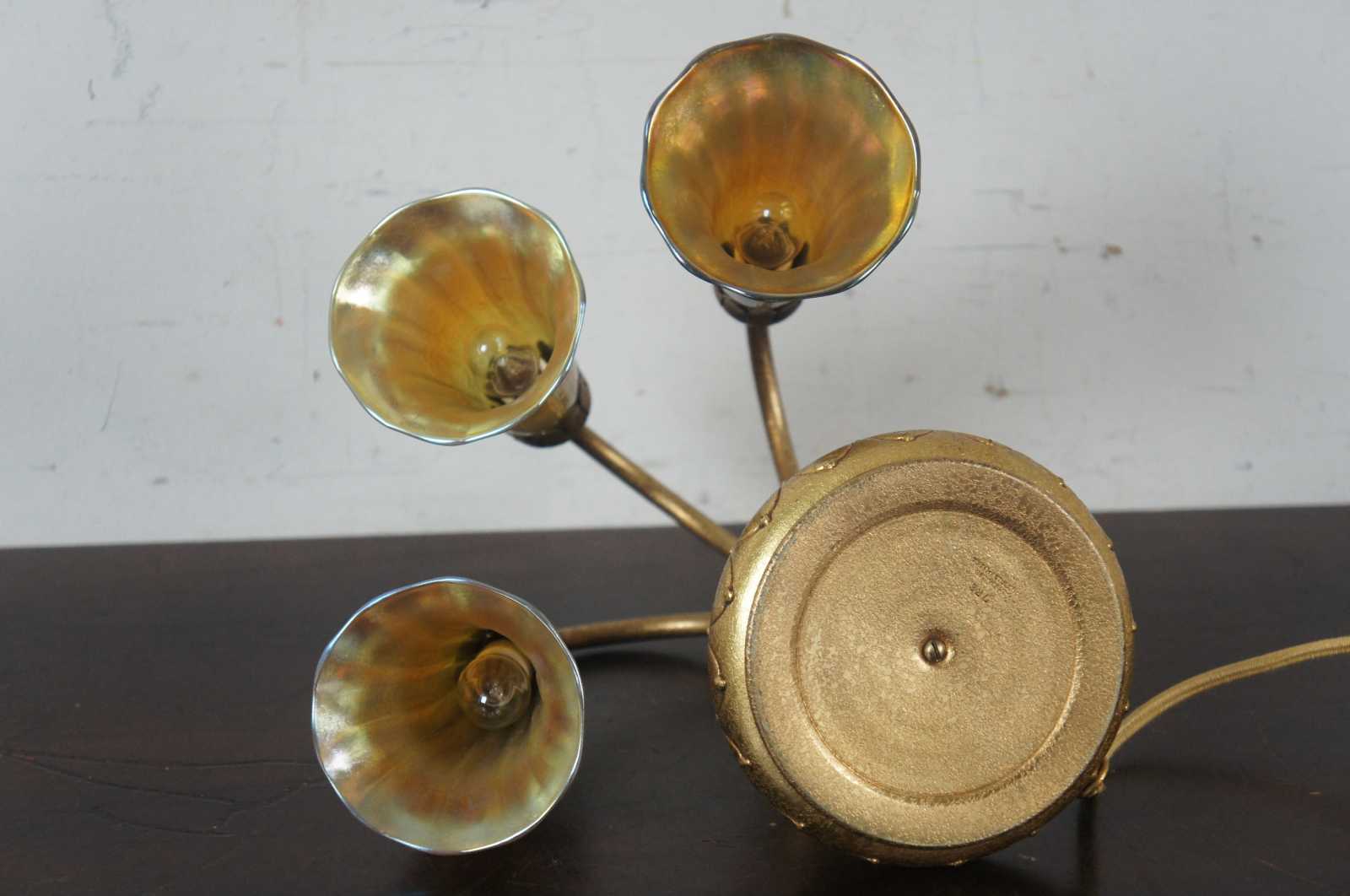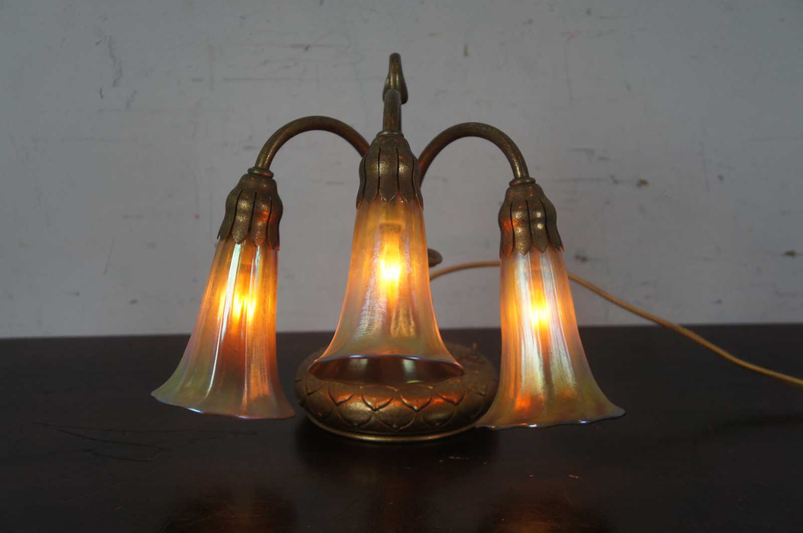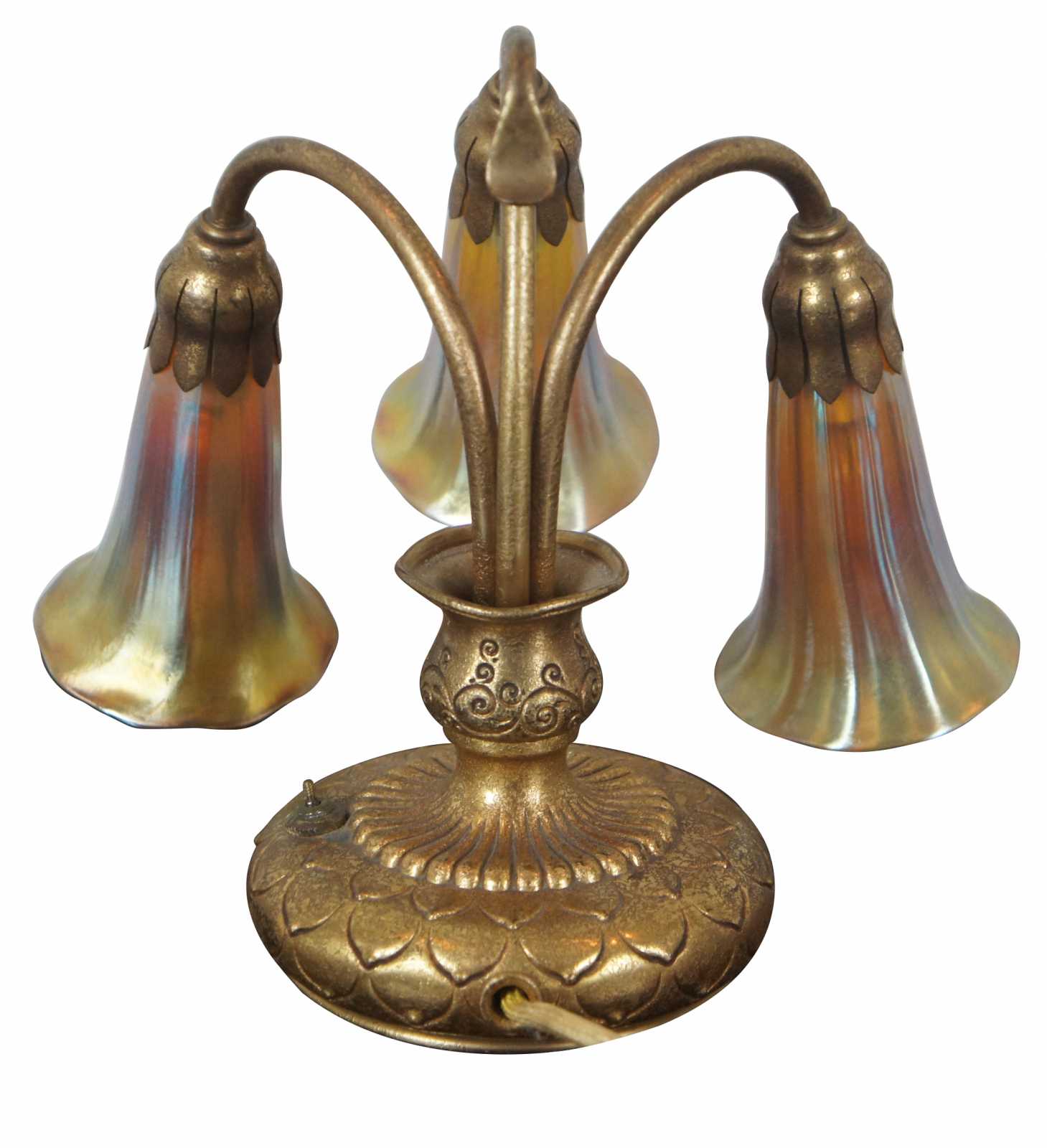 Circa 1910 Tiffany Studios three light lily piano lamp. Patinated bronze with artichoke base and three iridescent gold favrile lily shades, signed lct along one of the shades and marked Tiffany Studios New York 320 along the base.