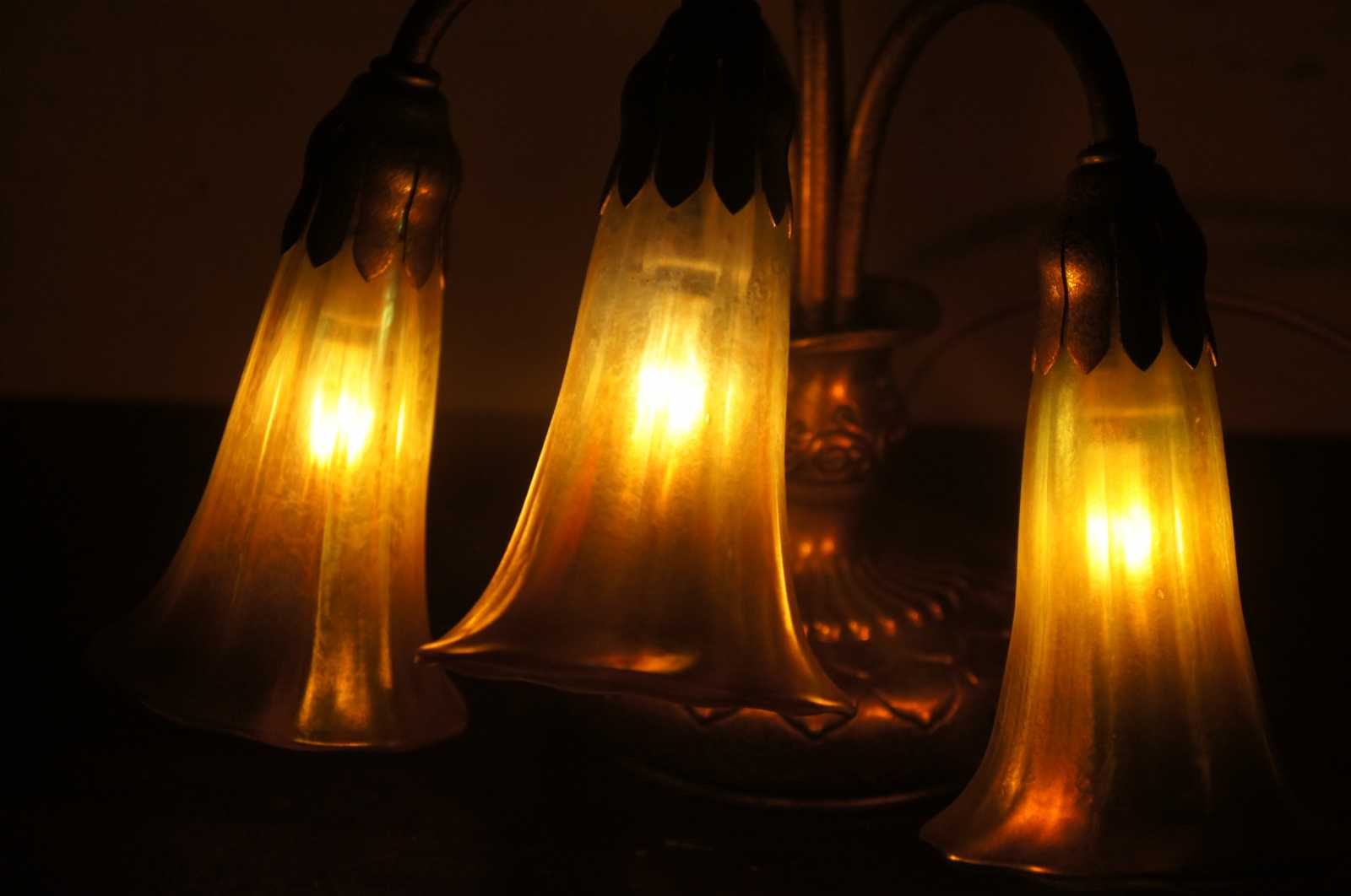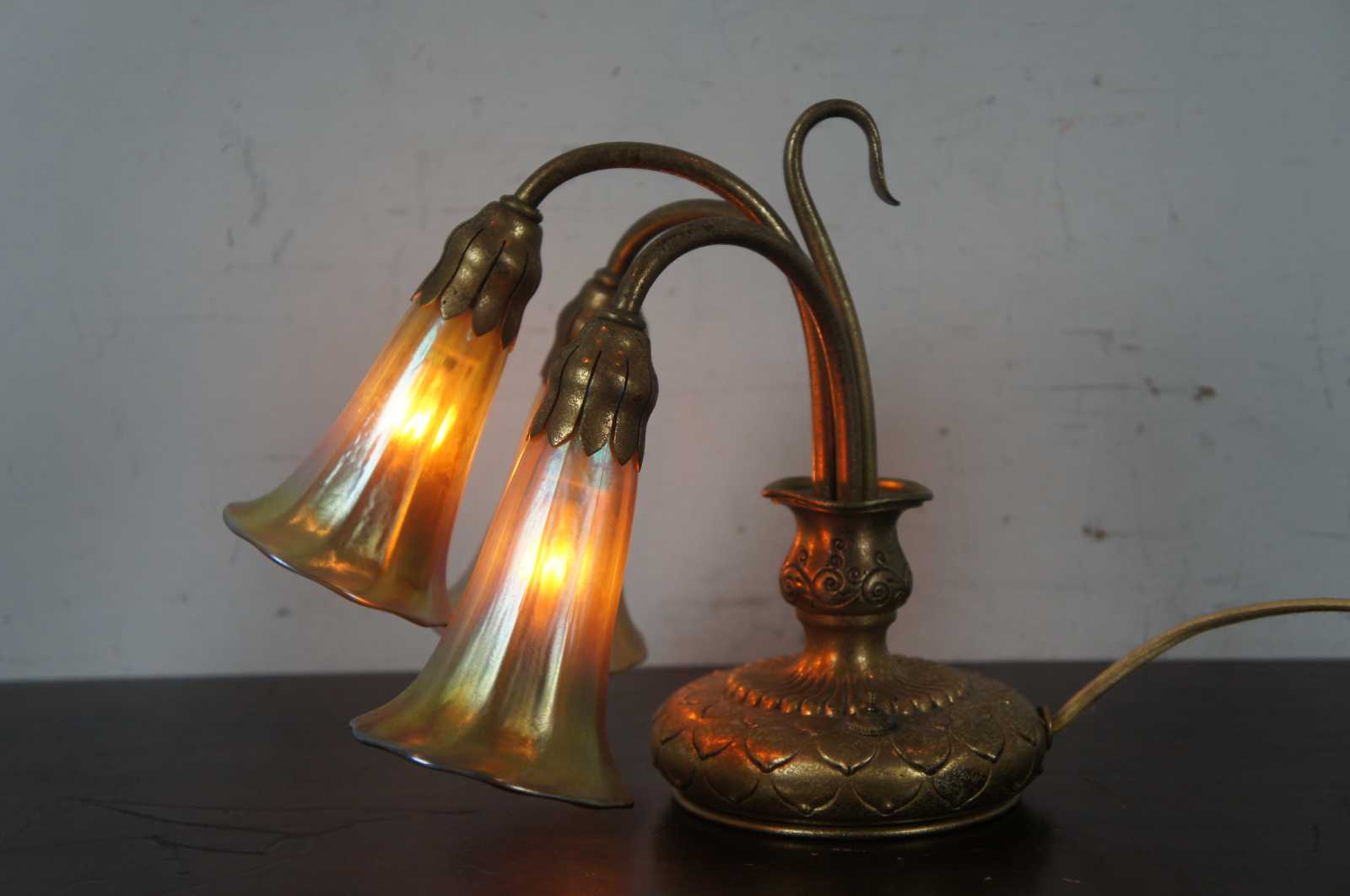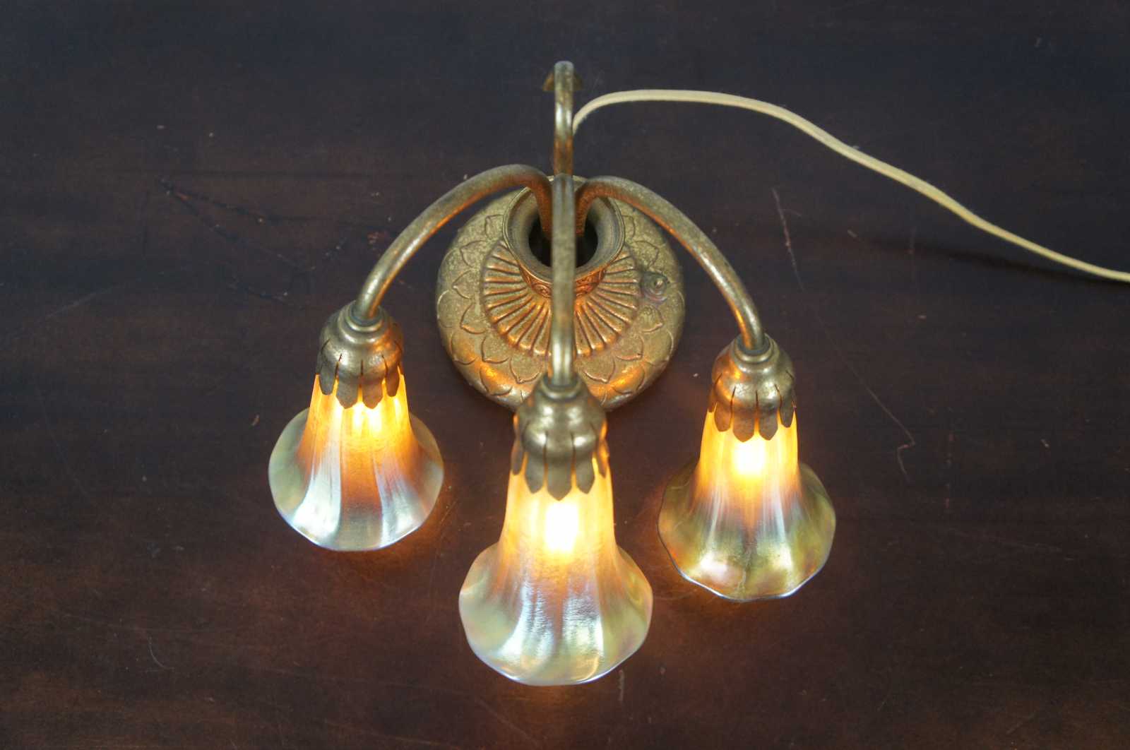 Circa 1910 Tiffany Studios three light lily piano lamp. Patinated bronze with artichoke base and three iridescent gold favrile lily shades, signed lct along one of the shades and marked Tiffany Studios New York 320 along the base.