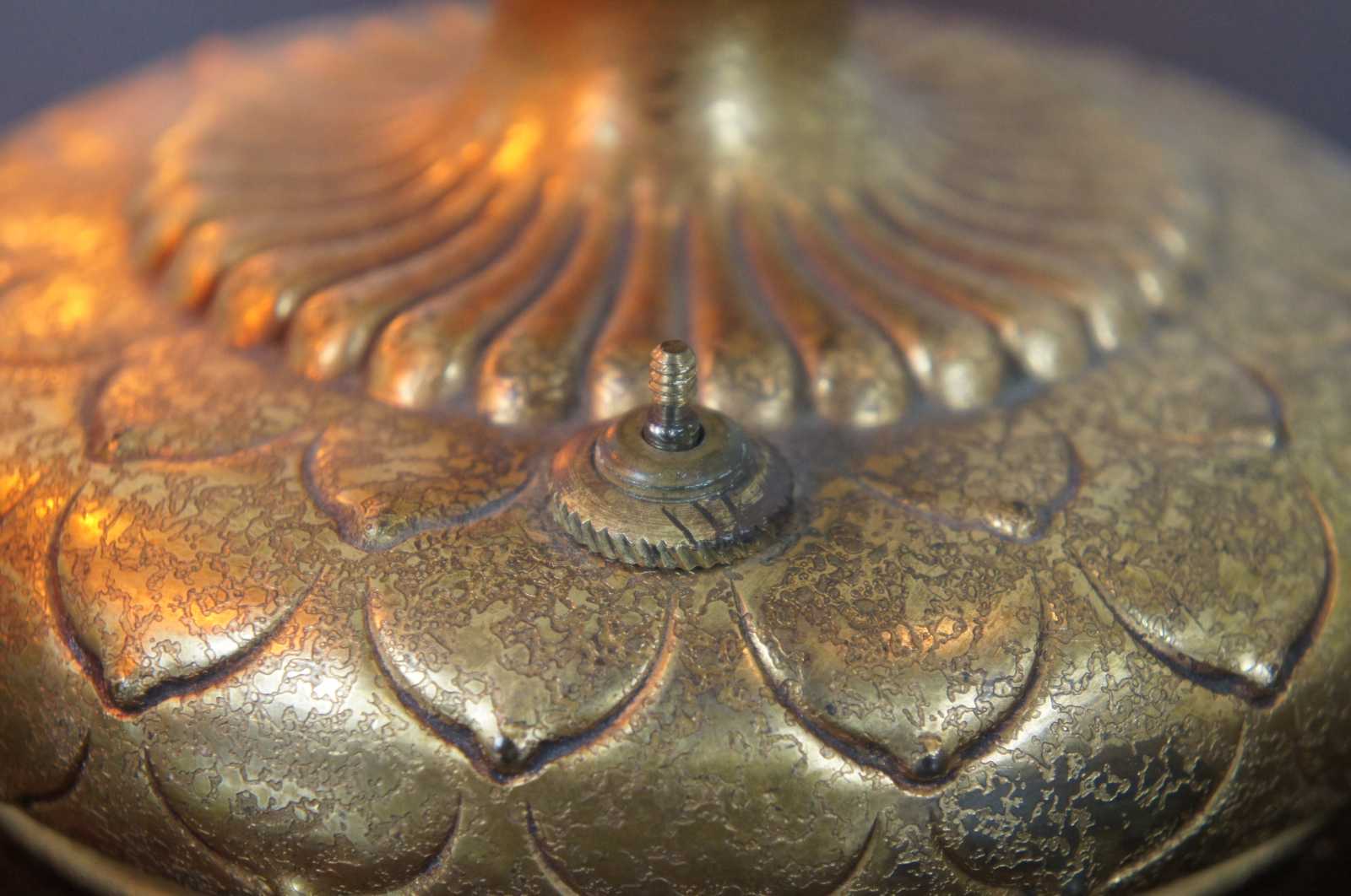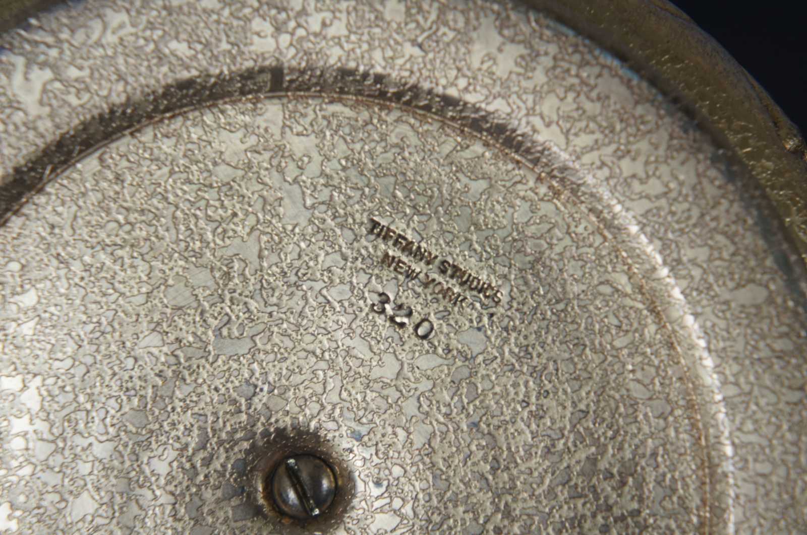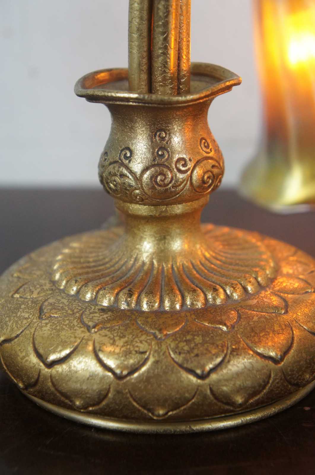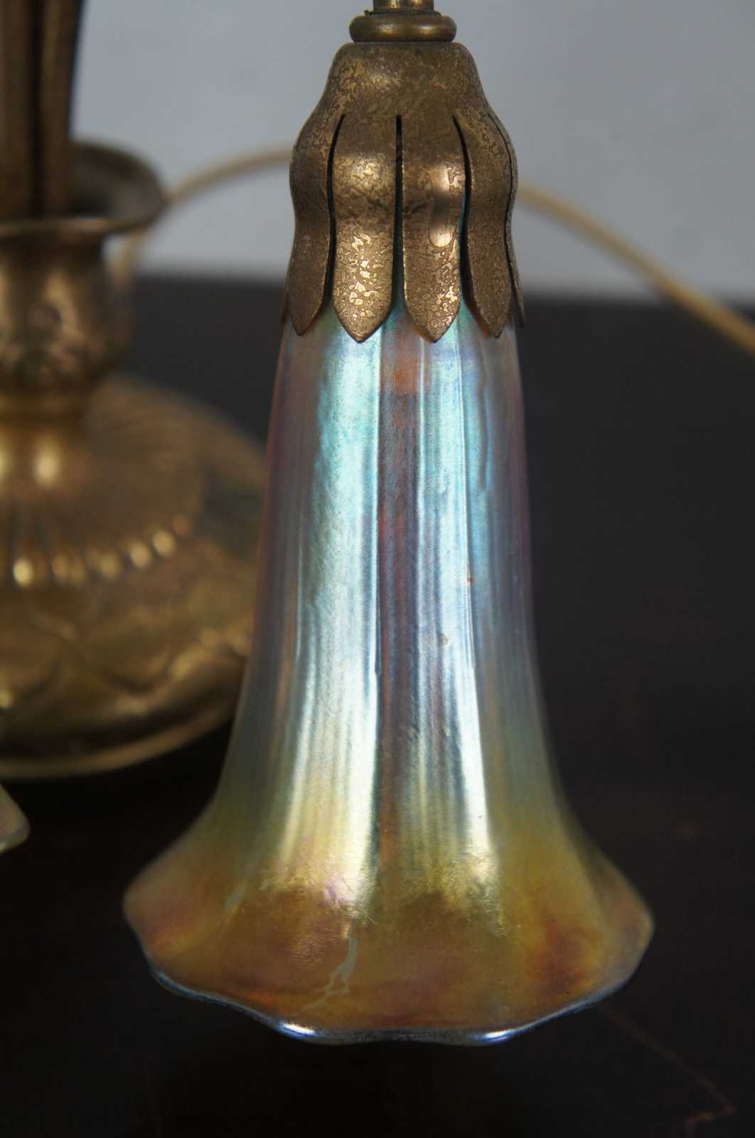 Circa 1910 Tiffany Studios three light lily piano lamp. Patinated bronze with artichoke base and three iridescent gold favrile lily shades, signed lct along one of the shades and marked Tiffany Studios New York 320 along the base.