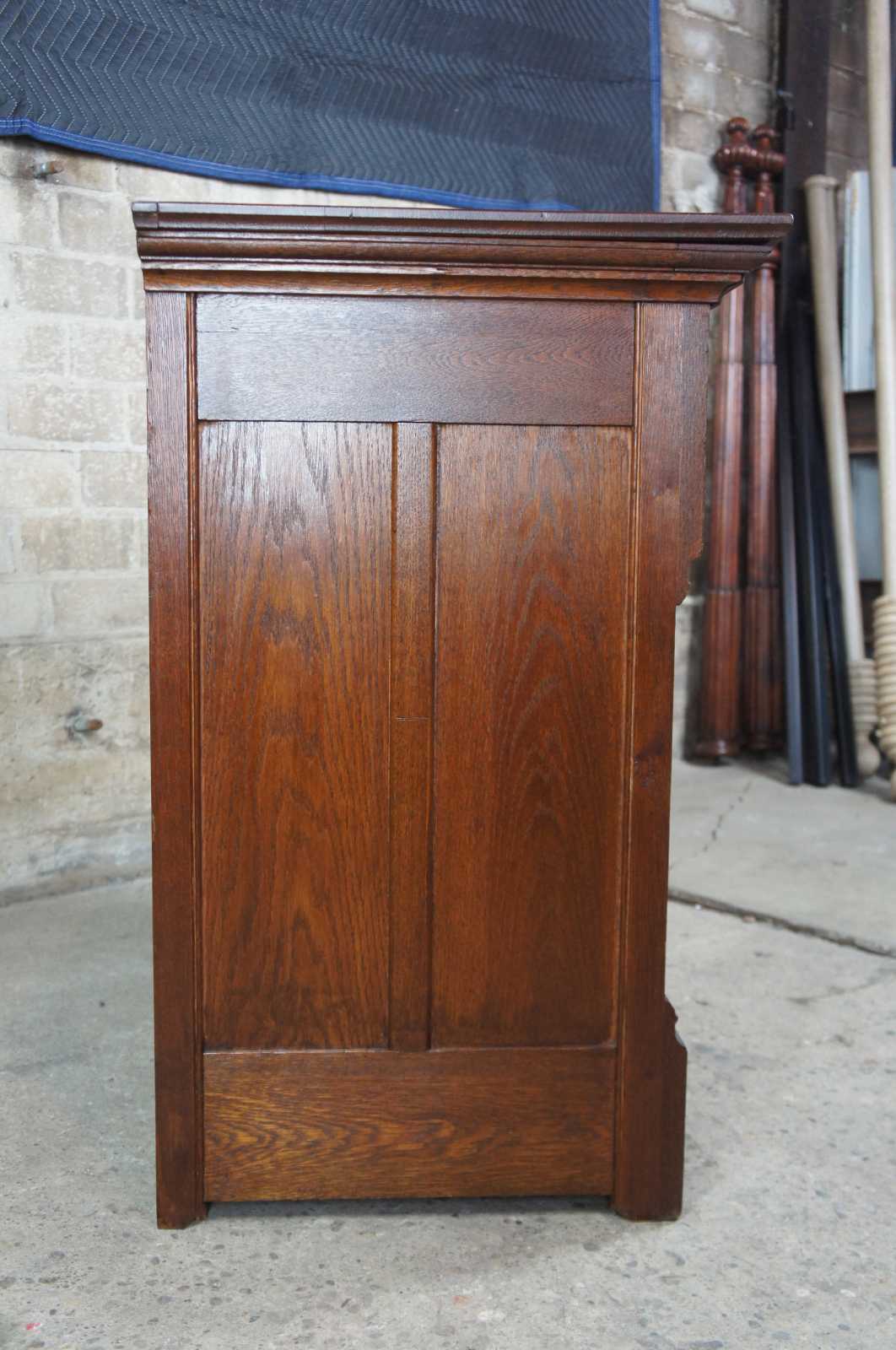 Circa 1880s Aesthetic period three drawer dresser. Made from oak with ornate brass hardware. The drawers are constructed using the Knapp Joint. The Knapp joint was developed during the late Victoria Era in post-Civil War United States. It was patented by Charles Knapp of Waterloo, WI in 1867. The Knapp Joint is particularly unique to furniture as it was only used from 1870 until 1900.