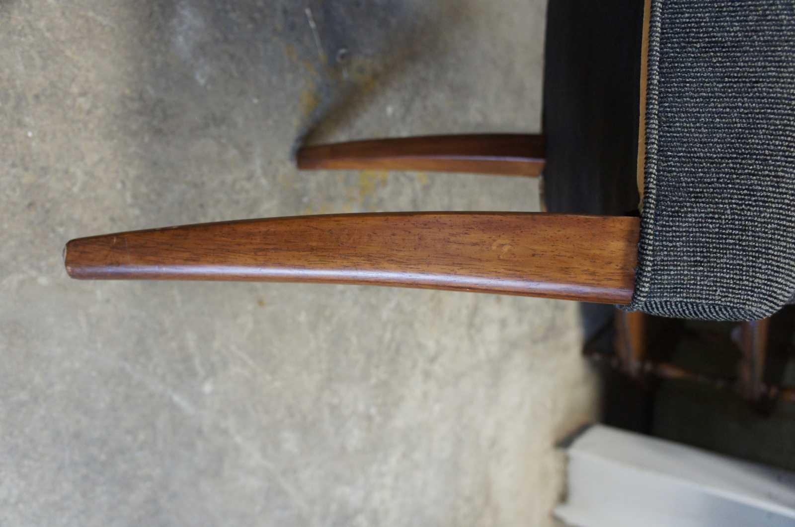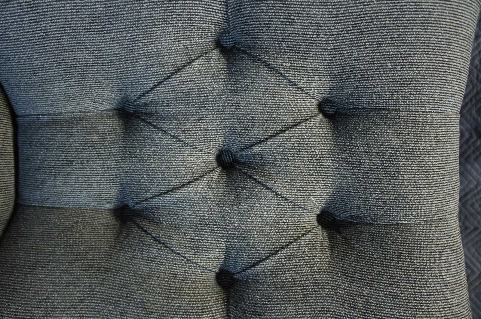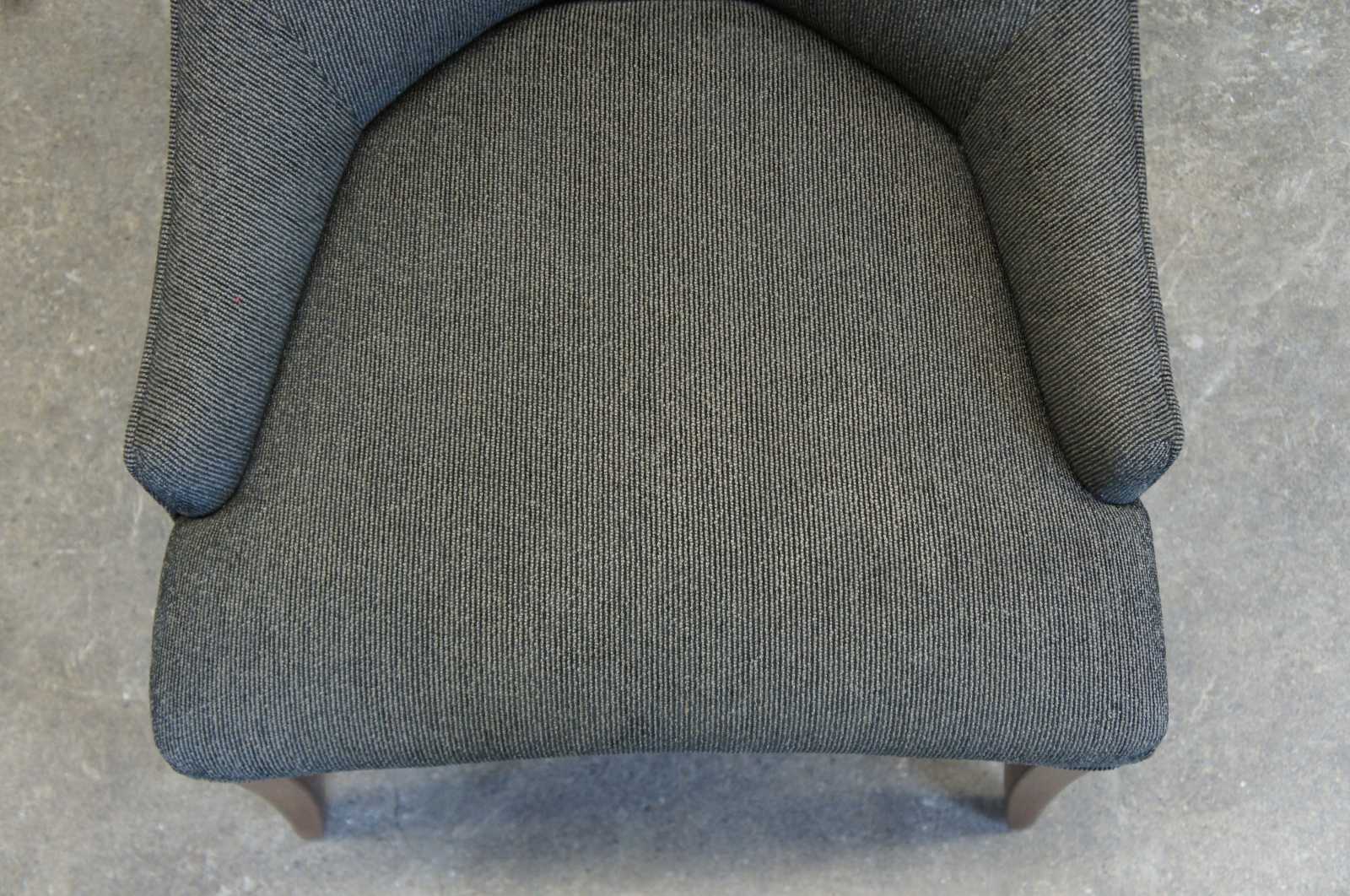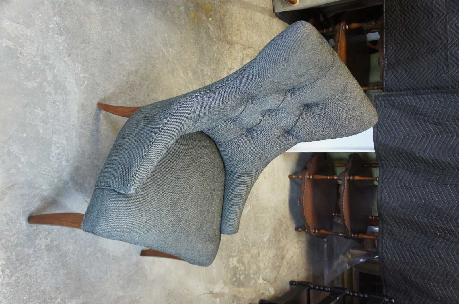 Set of eight Bernhardt Deco Tufted Back dining chairs. Features low arms, gray tufted upholstery and coco finish. The Deco Tufted Back Chair, sized as a host or hostess chair, is updated for today's traditional customer. The tufted back and small sloped arms rest near the seat back creating a sleek look. Exposed wood legs in a saber shape complete the updated styling of this chair. Established in 1889 by John Mathias Bernhardt, the company is a family-owned manufacturer of luxury furniture that is based in North Carolina. Product #319-452