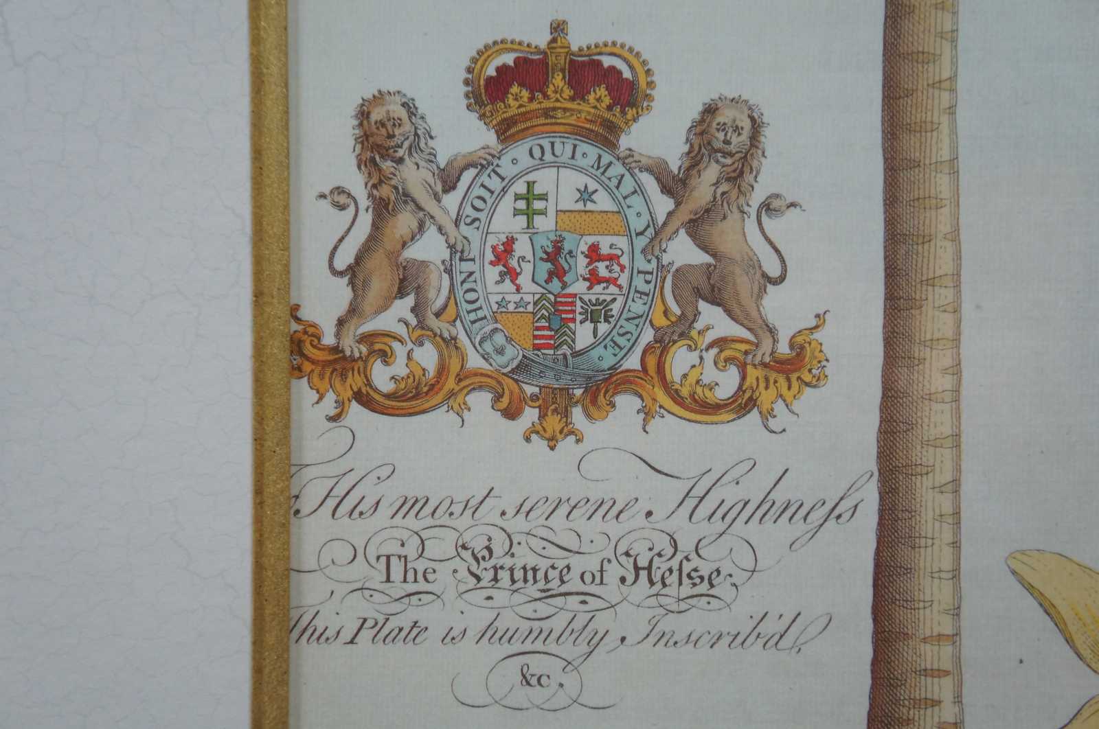 Two fantastic framed botanical prints stemming from Welsh botanist Griffith Hughes' [1707–1758) research publication "The Natural History of Barbados [pub. 1750]. The book captures Hughes' recorded observations of the natural botanical features of the island over a period of of several years. The illustrative prints are taken from illustrations done by famed German botanist, botanical illustrator and entomologist, George Dionysius Ehret (G.D. Ehret) and sculpted to plate by J. Mynde [1740-1770], sculptor. These are vintage (mid-20th century) lithographs derived from the plate printing process.