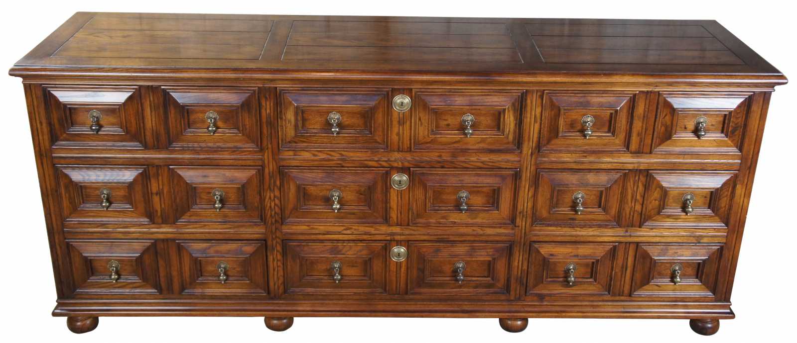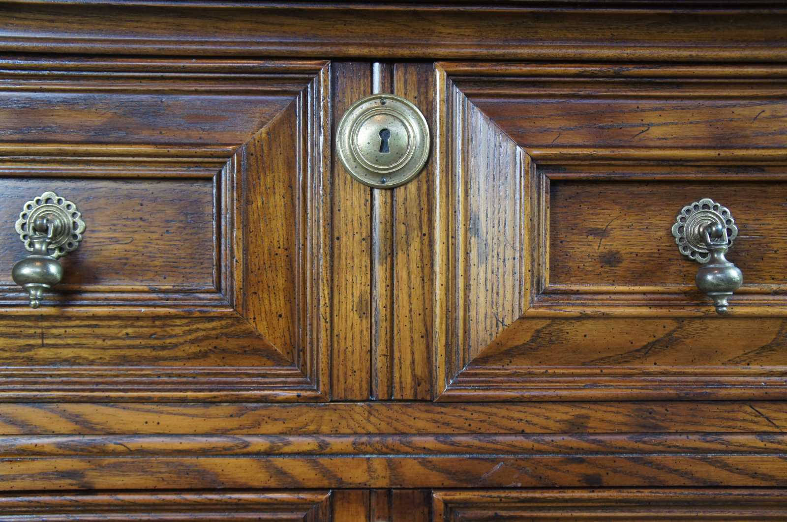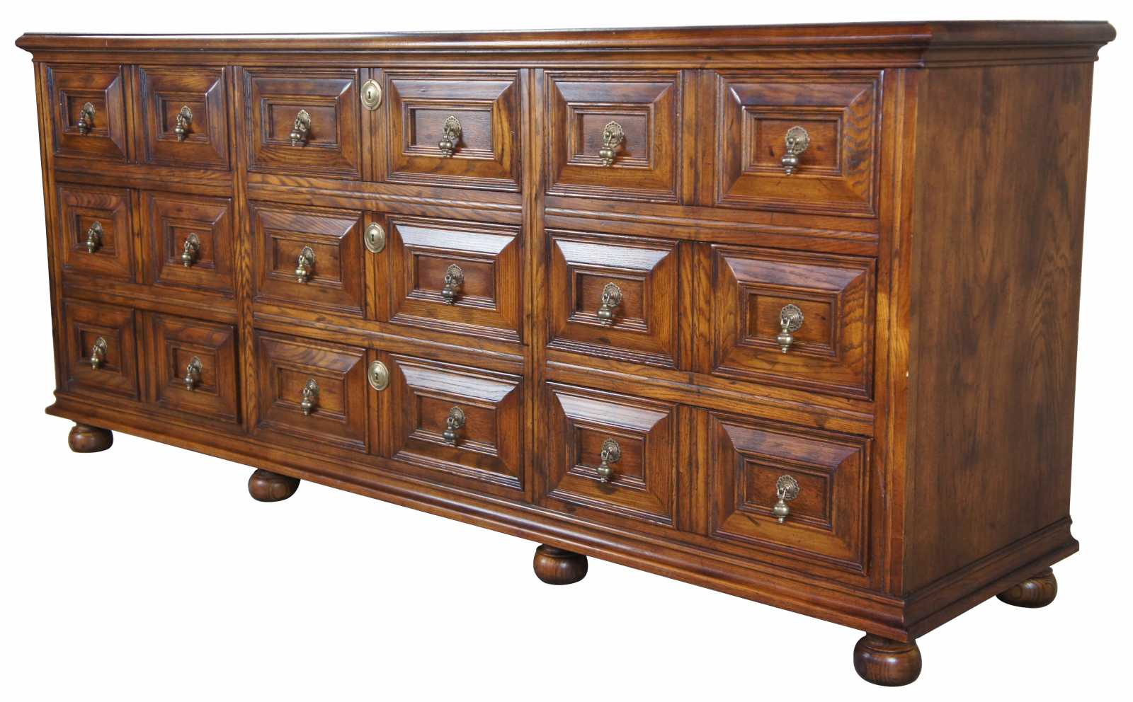 1979 Henredon nine drawer dresser. Made from oak with classic 18th century English styling. Includes robust paneled drawer fronts with victorian inspired knockers, brass key plates and bun feet.