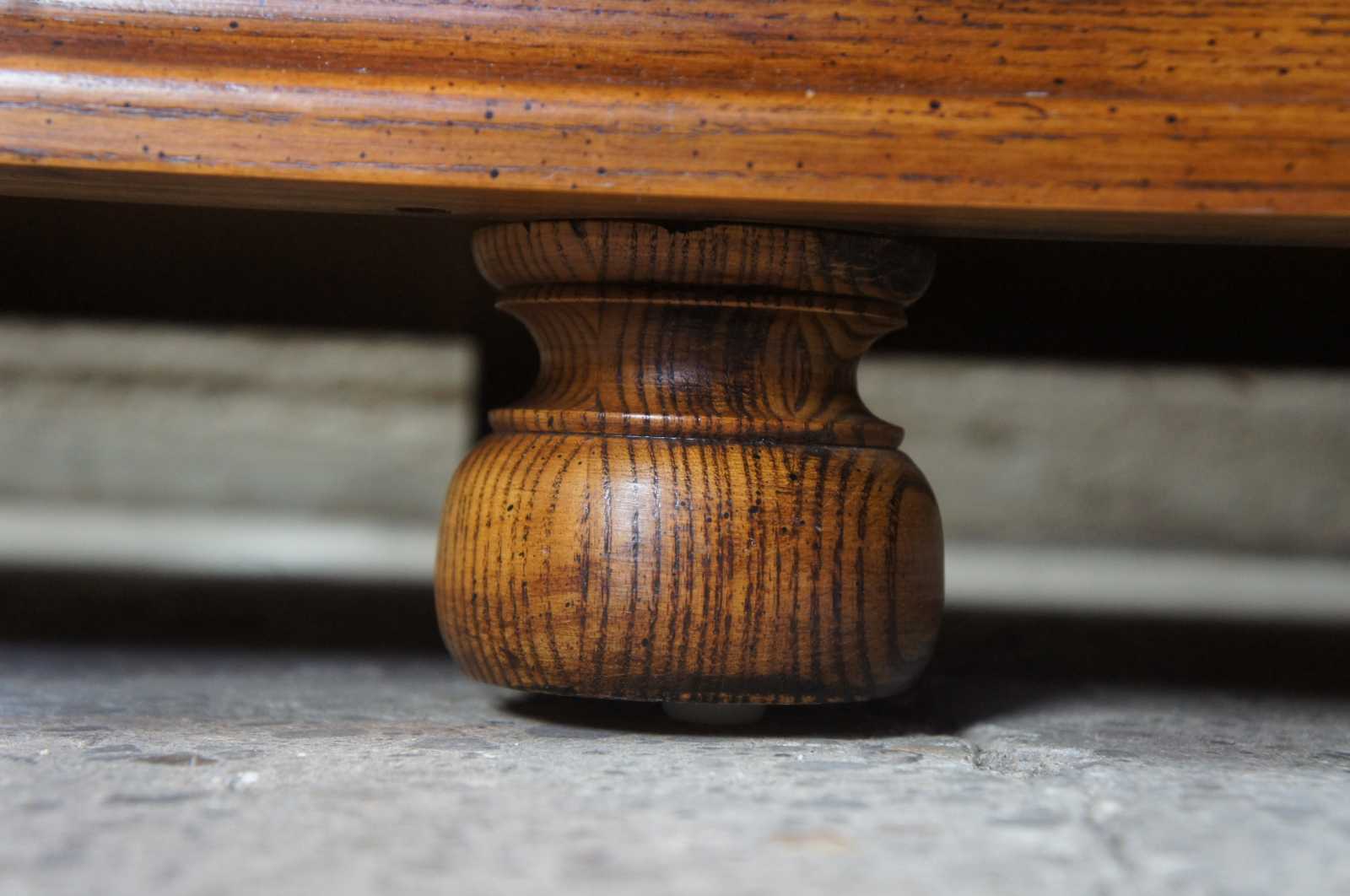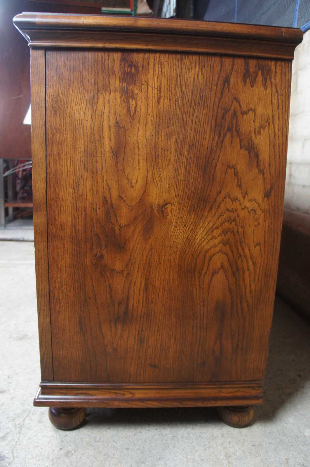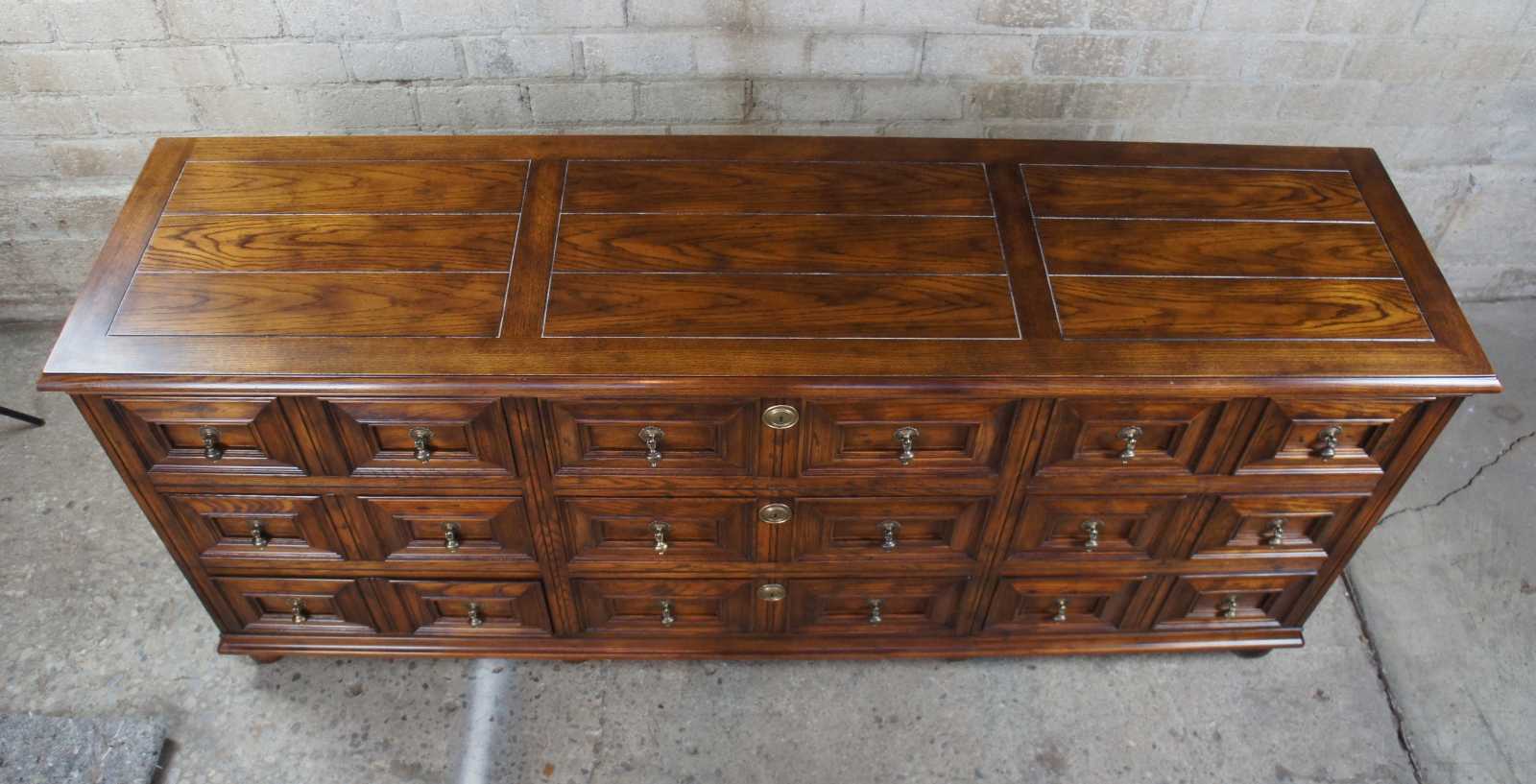 1979 Henredon nine drawer dresser. Made from oak with classic 18th century English styling. Includes robust paneled drawer fronts with victorian inspired knockers, brass key plates and bun feet.