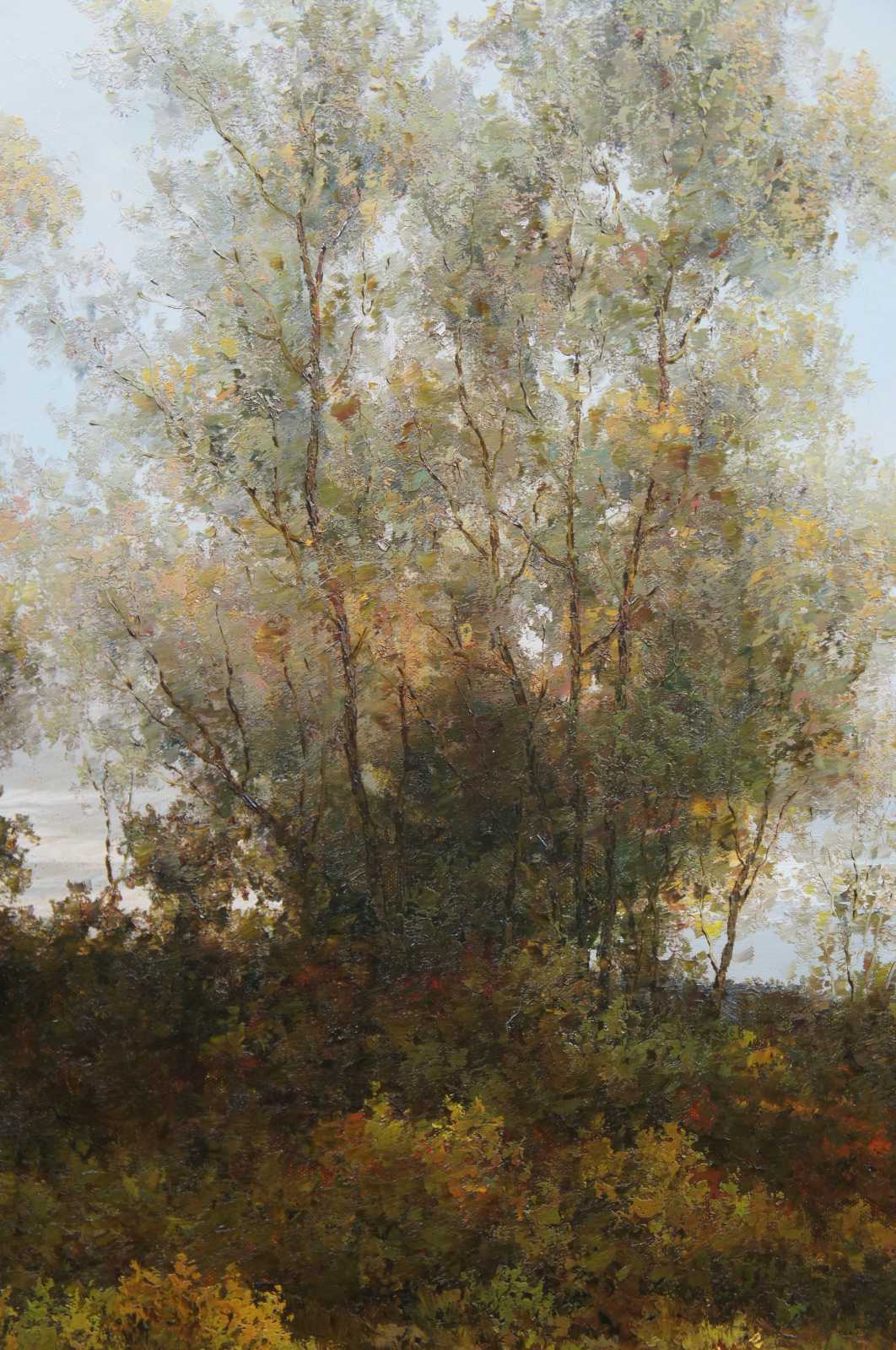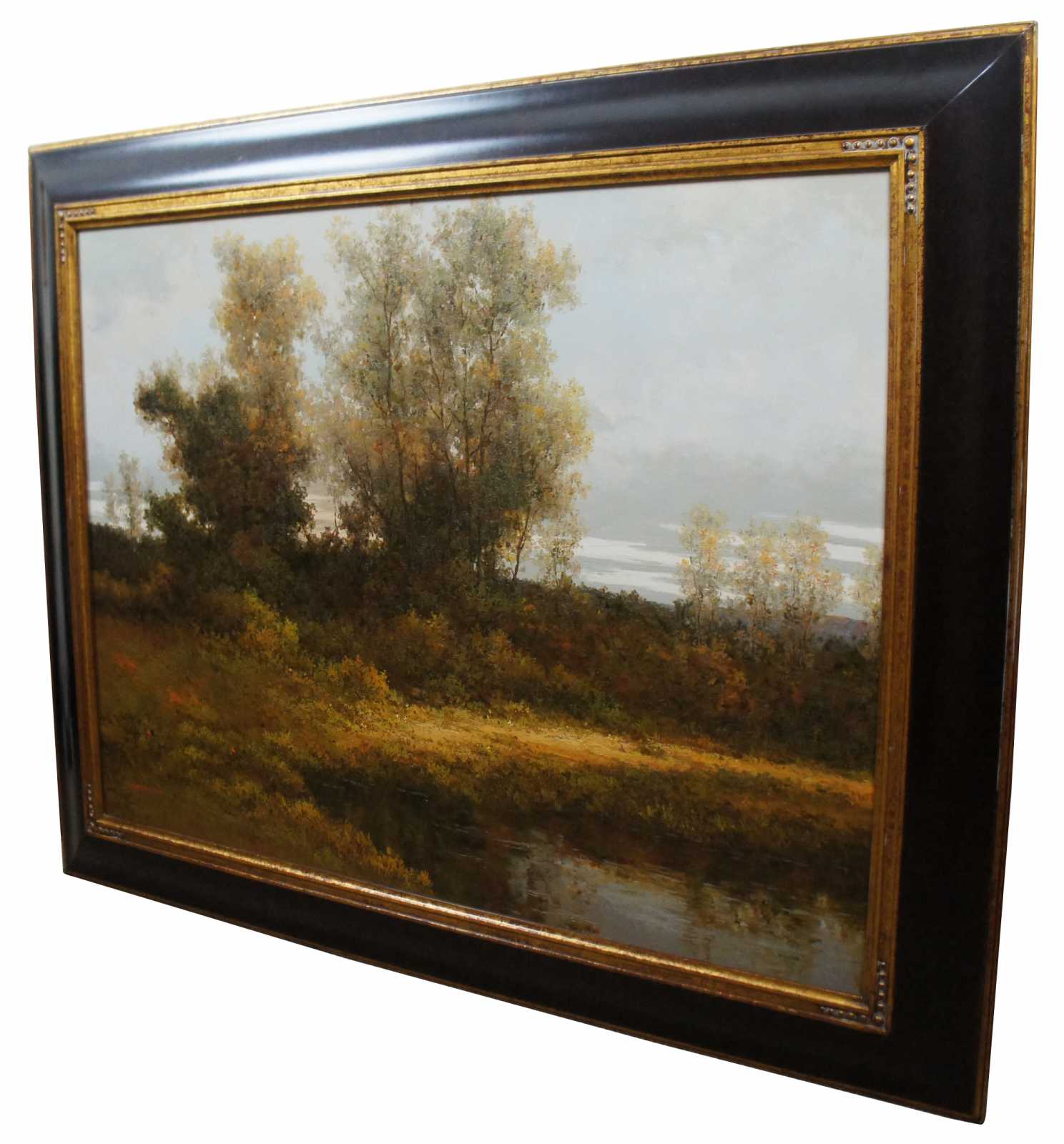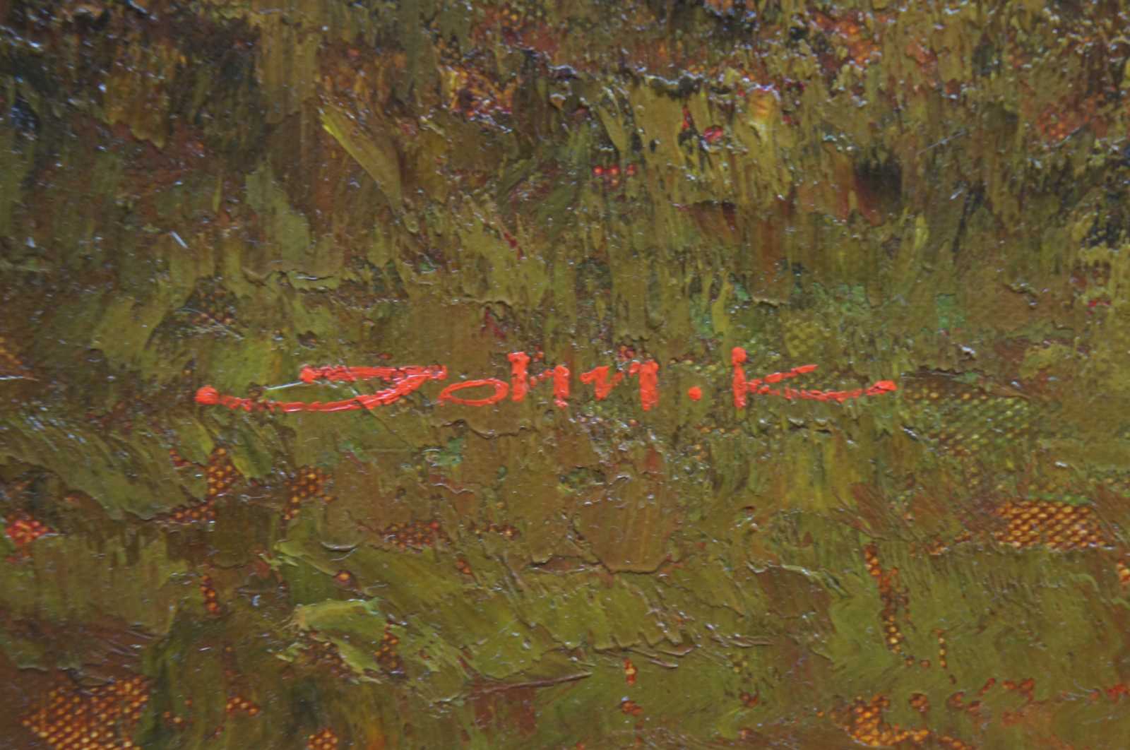 Large landscape painting on canvas, signed John K lower left. Features a country landscape scene near a pond in Autumn.