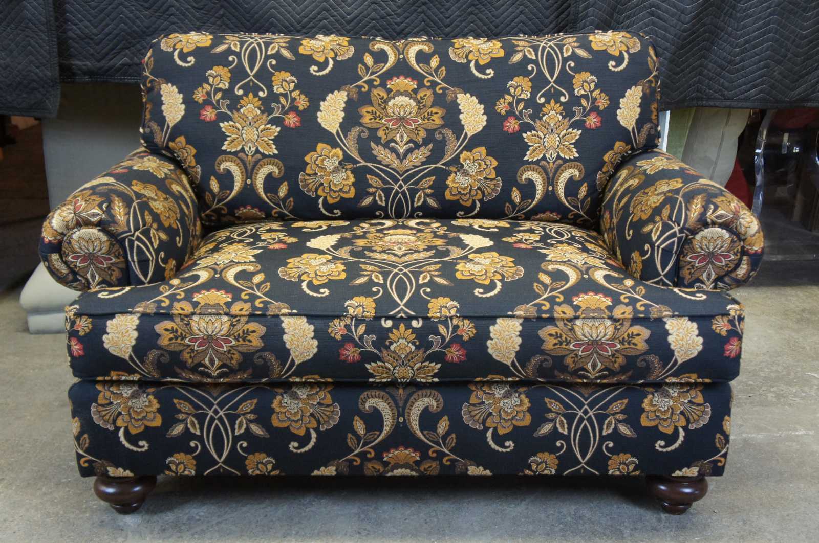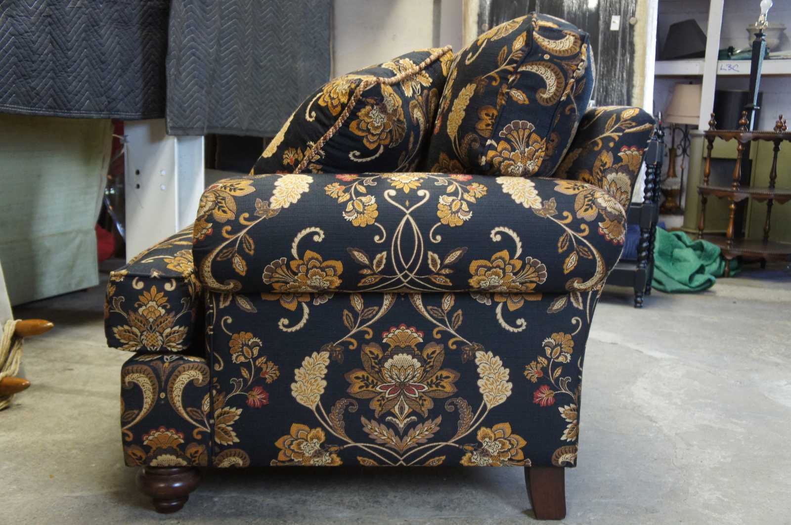 Henredon Upholstery Collection navy blue and gold floral sofa. Features natchez finish with rolled arms and throw pillows. Made in 2011, product # H2000-S.