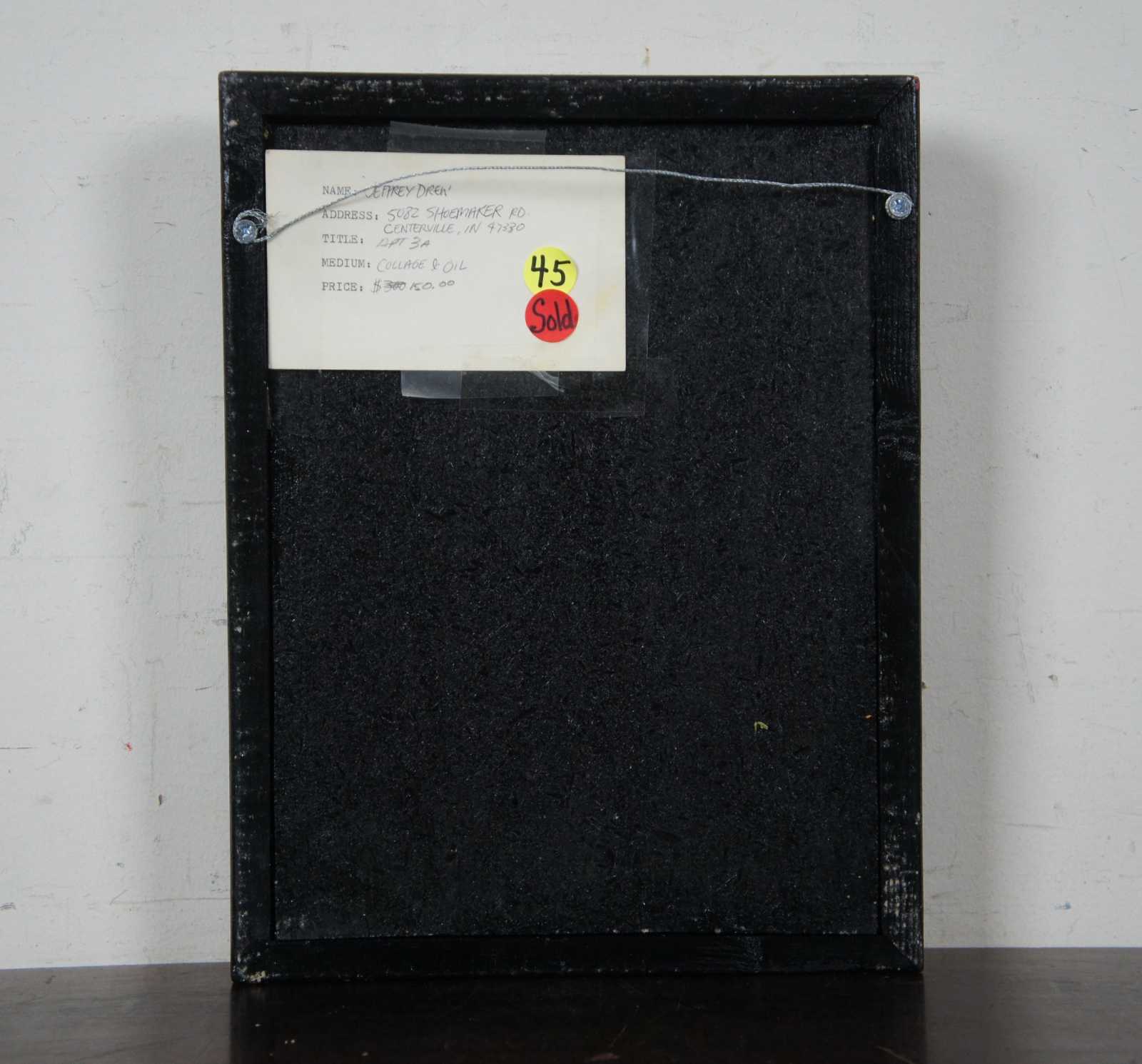 “Hold Up in Apt 3A” 1996 by Jeff Drew, a surrealist collage and oil on board featuring a partially obscured figure pointing a gun at a woman through a half open, chained apartment door. / Jeffery Drew (b. August 29, 1973) from Centerville, Indiana has been creating art since early childhood. He attended the John Herron School of Art in Indianapolis, IN from 1992-1997. After school he began his work as a freelance illustrator and designer. Drew designed his first cover for Albuquerque’s “The Weekly Alibi” in 1999 and worked as a full time graphic designer there from 2004-2012. Drew’s artistic output includes not only illustration and commercial graphic design, but music and animation as well.