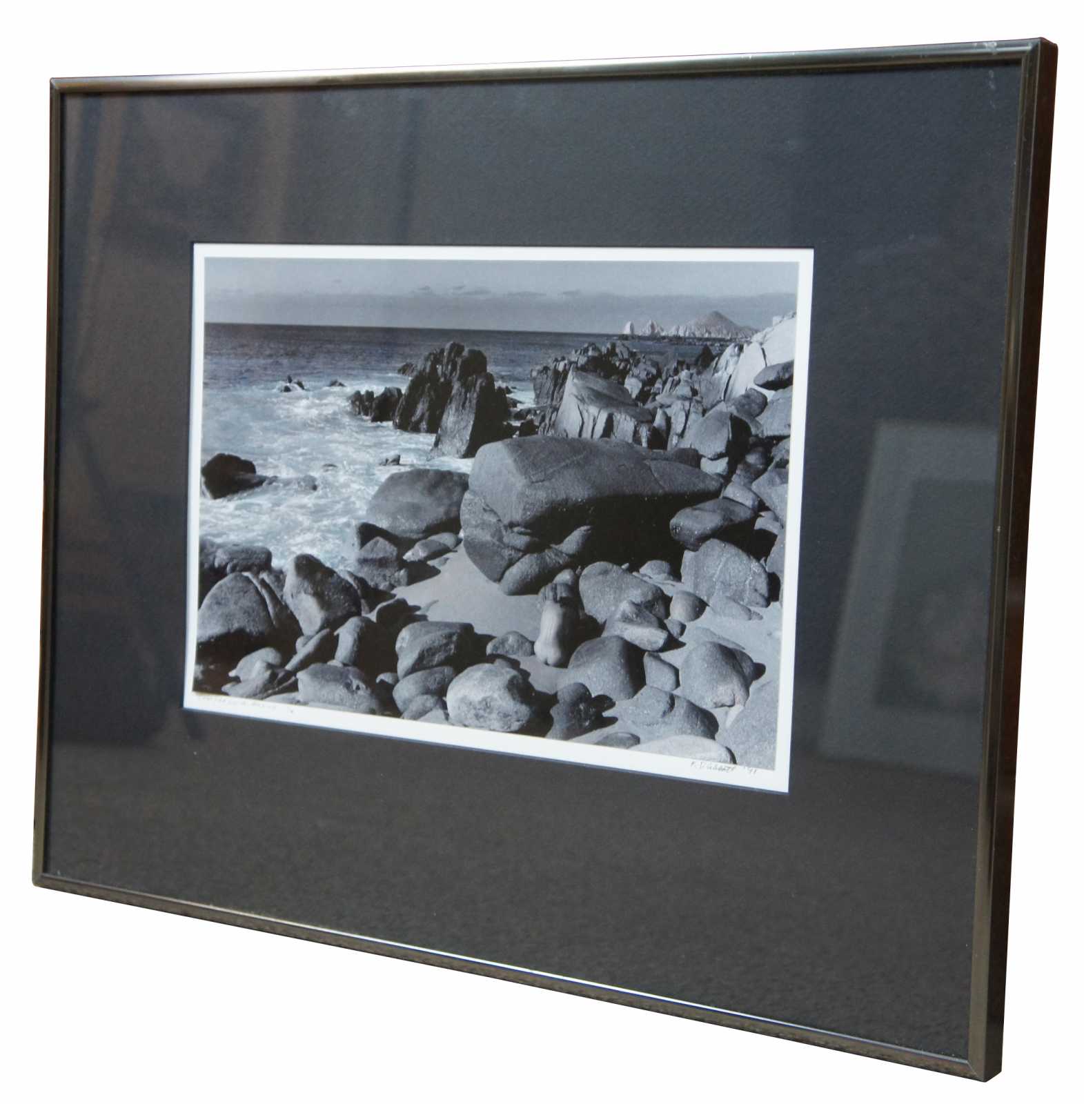 Pencil signed 1991 black and white photograph of a nude figure on a rocky beach in Cabo San Lucas, Mexico by Karen D. Abbott, number 1/2.