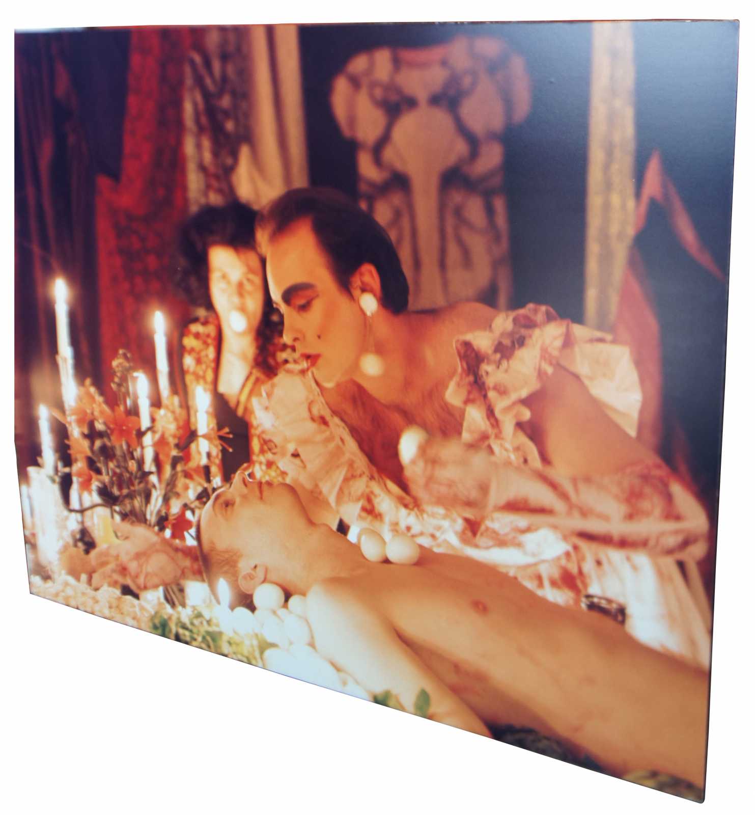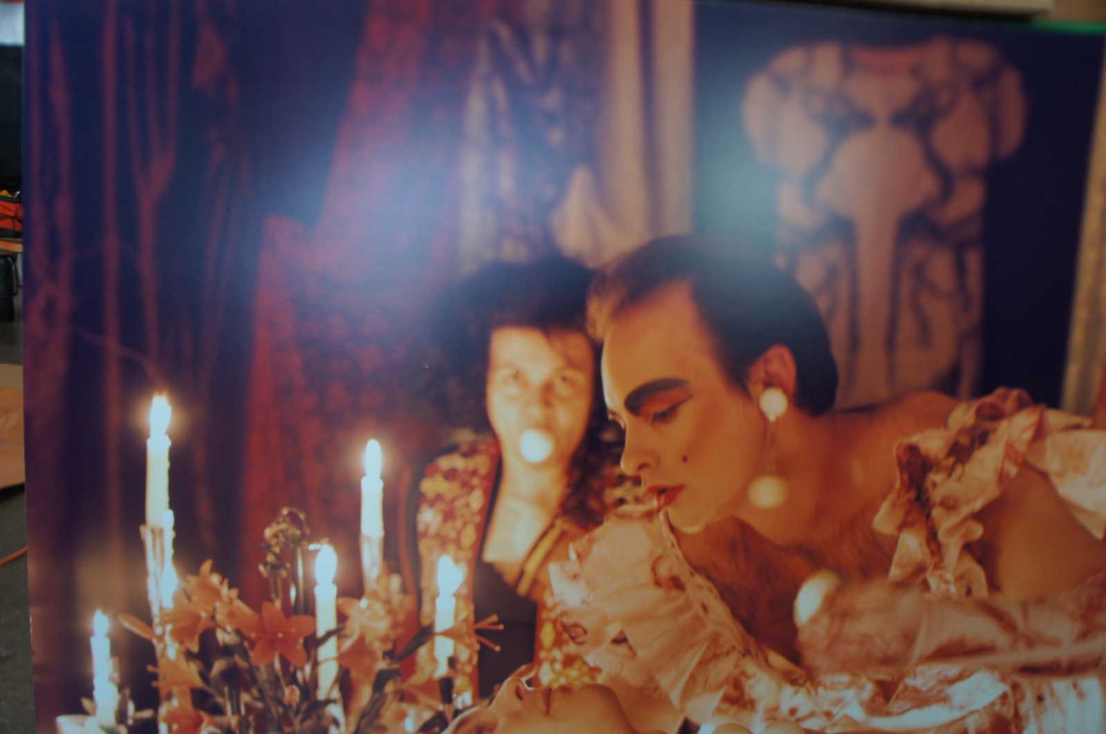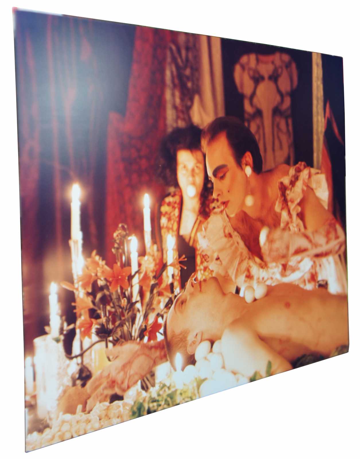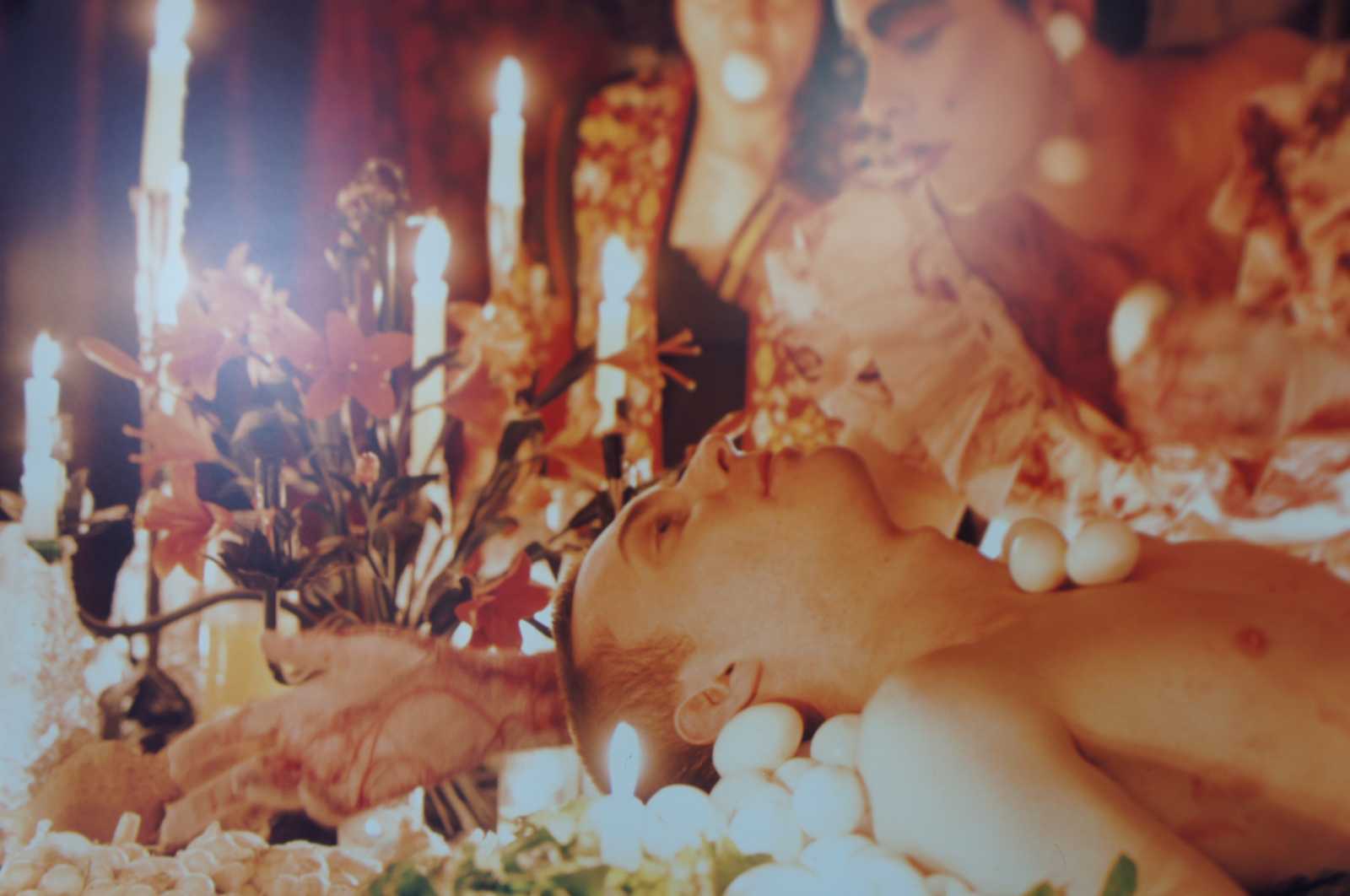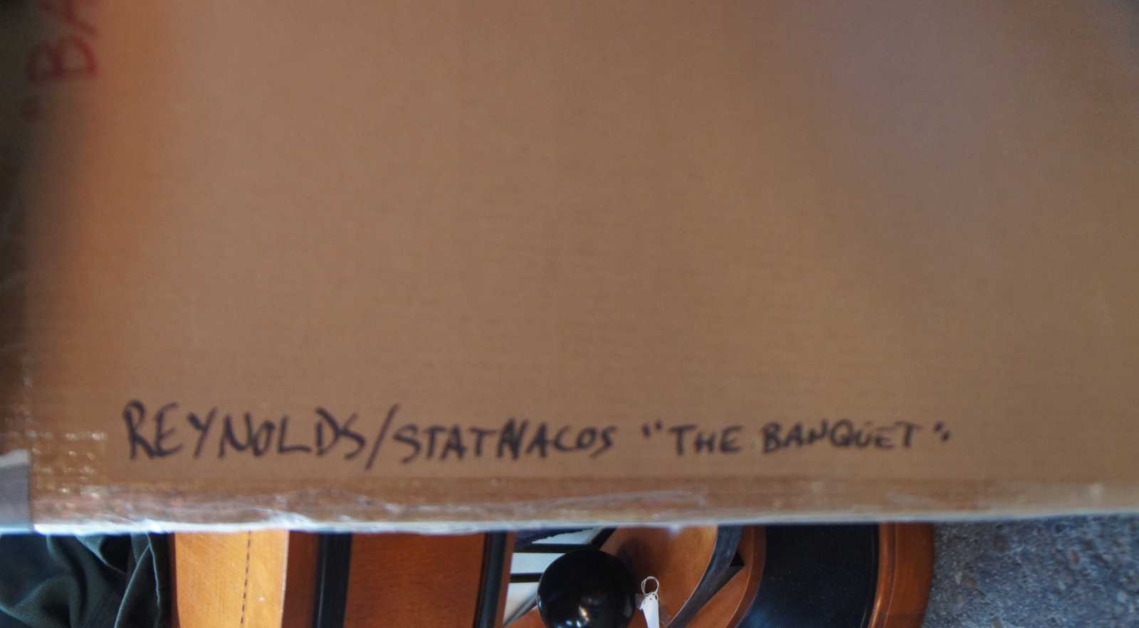 The Banquet, first preformed at Thread Waxing Space in 1992, was largely inspired by Surrealist Meret Oppenheim’s Spring Feast, in which a banquet was presented on the body of a nude woman. Andre Breton later encouraged Oppenheim to reenact Spring Feast for the Paris Exhibtion entitled Exposition InteR natiOnale du Surrealsime (the last joint exhibition of the Surrealist group). In The Banquet, Stathacos and Reynolds have inverted Oppenheim’s original event by substituting a nude man for the woman, blatantly confronting issues of male dominance throughout (art) history.