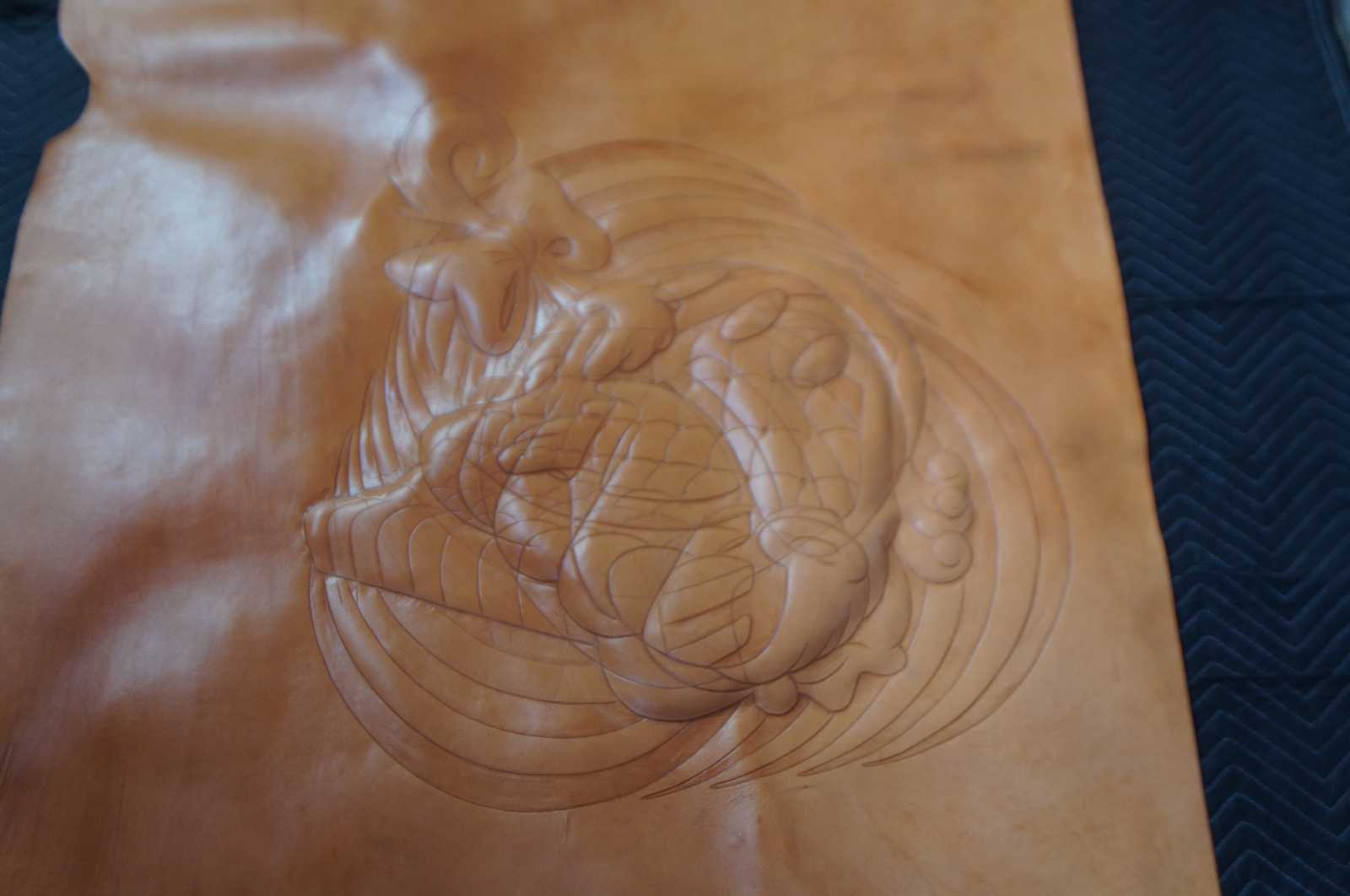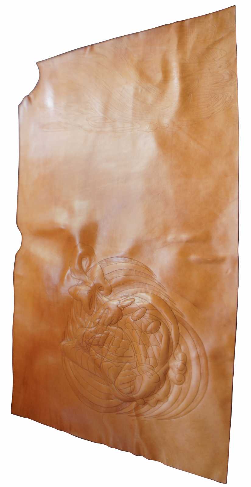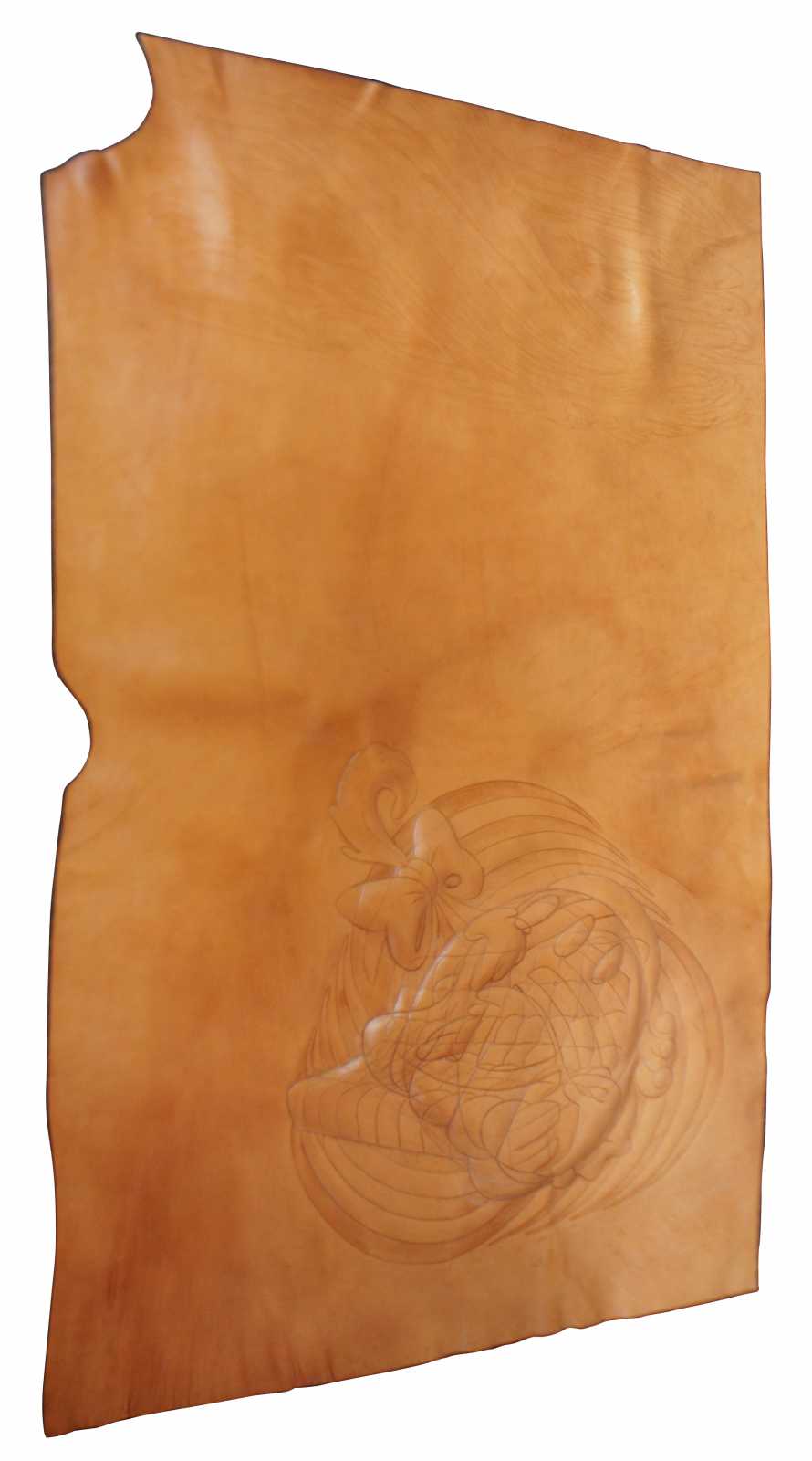 Features a peanut butter or carmel leather with embossed detail and abstract design.