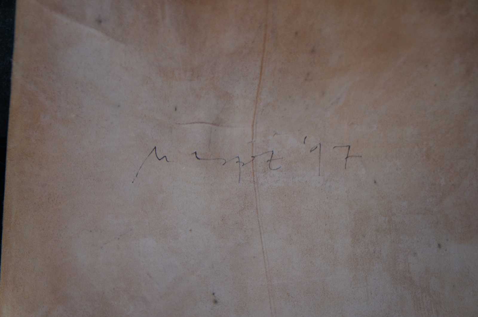 In fully encasing a 1971 Honda 600 automobile in skin-colored leather, early works such as Boy, 1999, offered commentary on contemporary society's relationship to consumer products by combining disparate forms of capitalism. Lopez also examines art-historical Minimalist forms by building abject spare structures out of debris. Constructed of crumpled aluminum and stainless-steel, Blue Angels, 2011, exemplifies post-9/11 technological failure while also considering the performative element of the artist’s body via sculpture. The sound and kinetic installation, Halyard, 2013, probes structures of power and the phenomenon of violence using structures of silence and disappearance. In the elegiacal Smoke Clouds, 2013, by pouring silver-nitrate onto immense sheets of reflective glass, one is left with a haunting stain evocative of the billowing aftermath of a violent explosion even as the glass acts as a mirror reflecting the viewer’s own image back to them.
