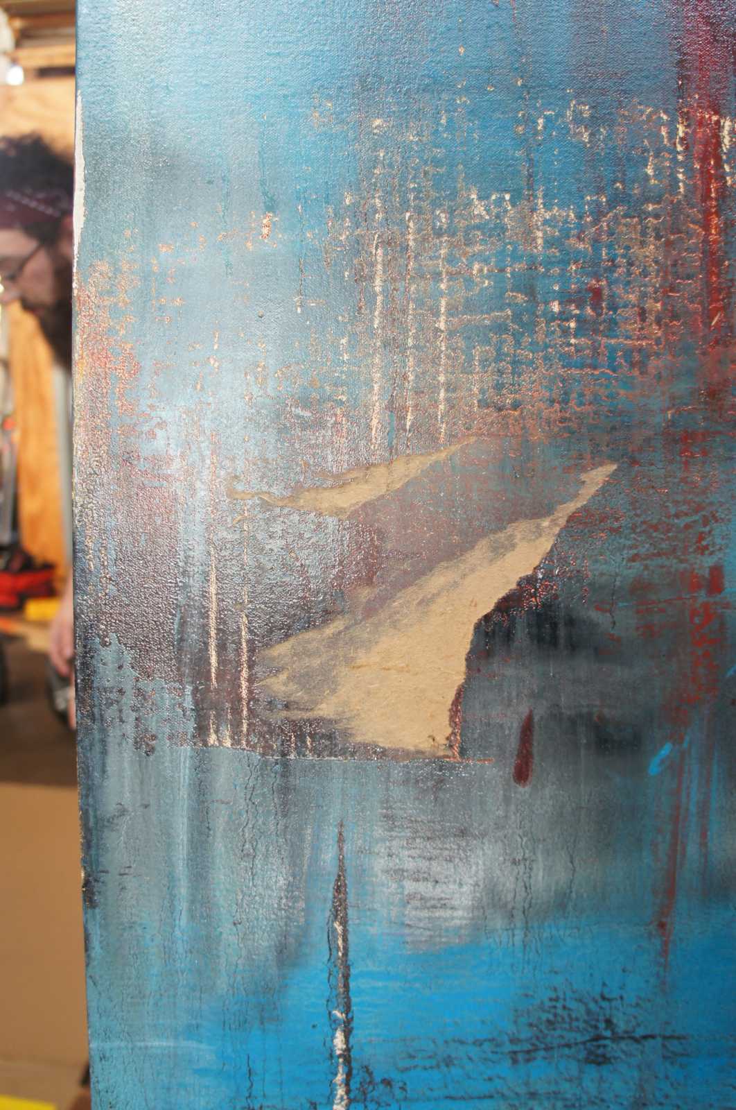There is damage to the canvas and paint loss due to being improperly stored with cardboard. Cordboard is stuck to the canvas in spots.