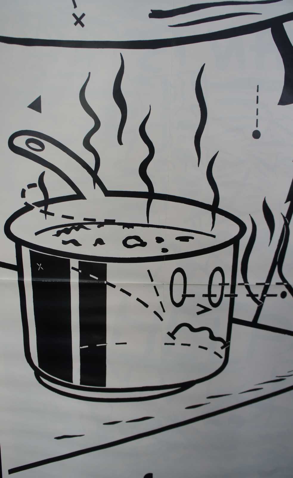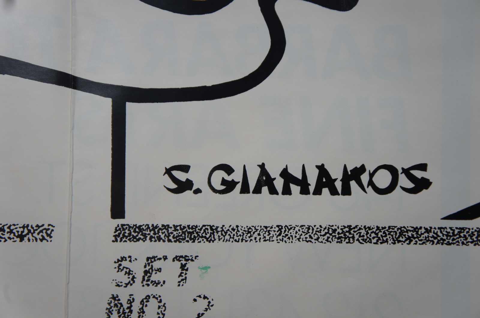 His images, generally derived from the lower echelons of popular culture, are mechanically enlarged, reduced, warped, repeated and recopied before being juxtaposed and joined together. Gianakos might use the same photocopied image several times to tease out different meanings in different contexts. To finish his works, Gianakos applies a layer of protective lacquer that makes the wrinkles and variegations in tone (and toner) permanent. The edges of most works are uneven and jagged, and Gianakos sometimes creates a pretense of the haphazard by integrating images of crumpled or overlapped papers from the margins of the copy machine's glass field.