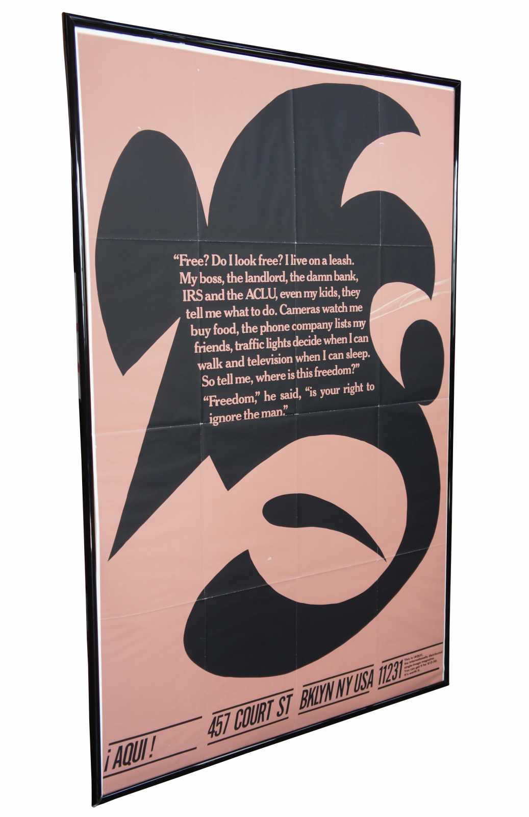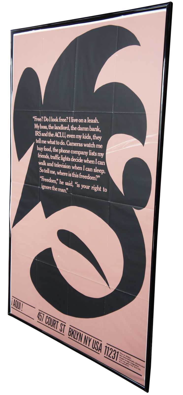 During the 80s, the colorful, illustrative oversized posters of AQUI Magazine were lining the streets of New York City, sold at bookstores such as MoMA bookstore and Printed Matter, and displayed at art institutions around the world. From 1983-86, Cliff Baldwin, Julie Bradrick and Davi Det Hompson collaborated with silk-screener Norman Lassiter and published ten issues of AQUI in downtown Manhattan. AQUI provided the public with accessible quality art at the price of $10 a poster, an affordable alternative to the traditional art gallery. The tabloid-sized, folded posters unfolded into one of two sizes: 45 x 69” and 35 x 45,” and featured silk-screened original artwork by Barbara Kruger, Les Levine, Steve Gianakos, General Idea, Gilbert & George, Davi Det Hompson, Julie Bradrick and Cliff Baldwin. To this day, the posters are significant because of their experimental typographic explorations and genuine promotion of democratic art making.