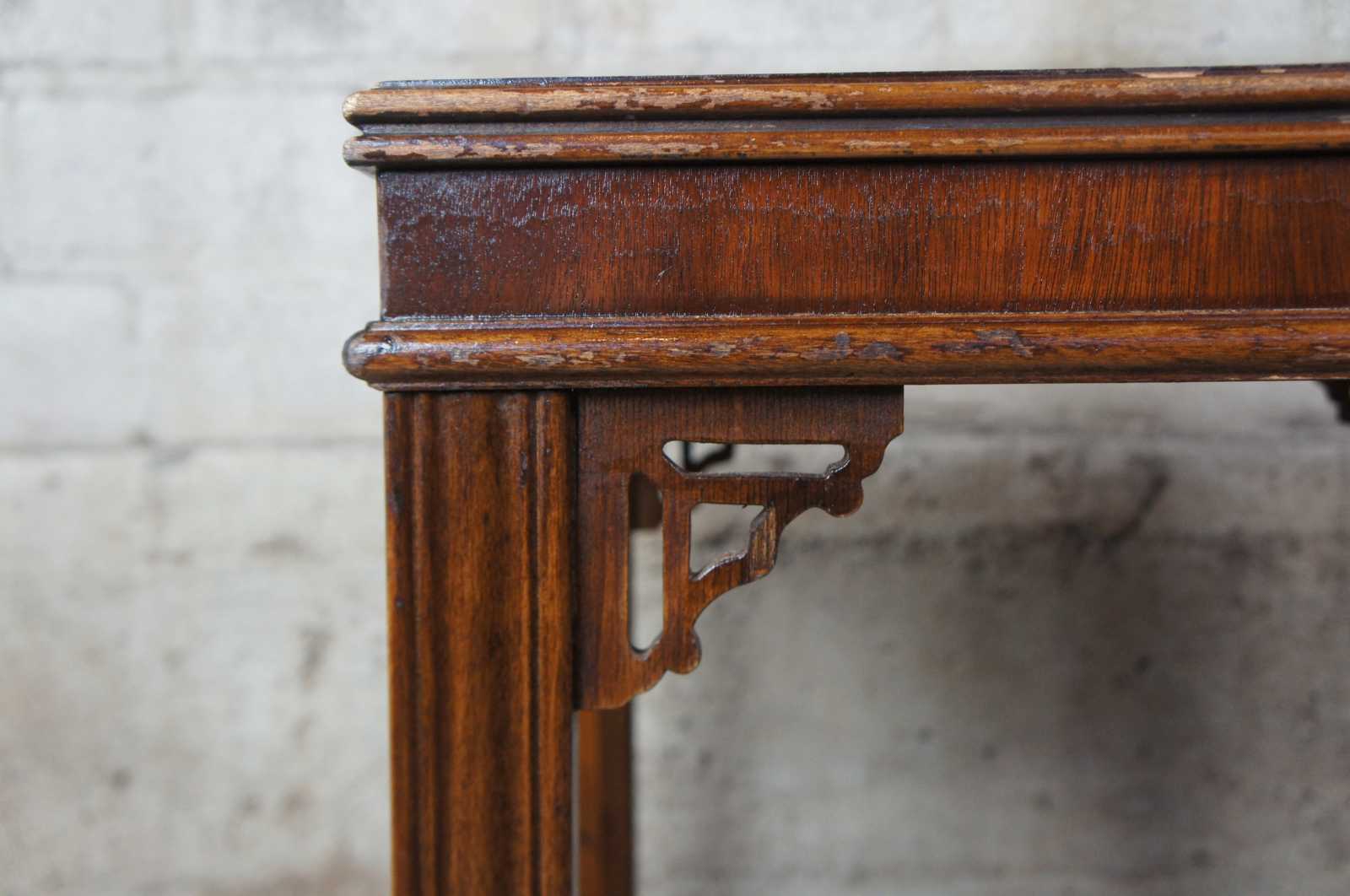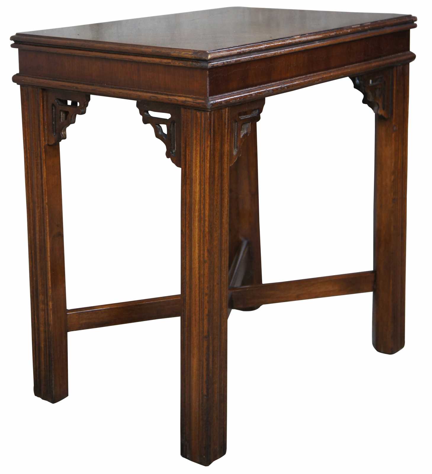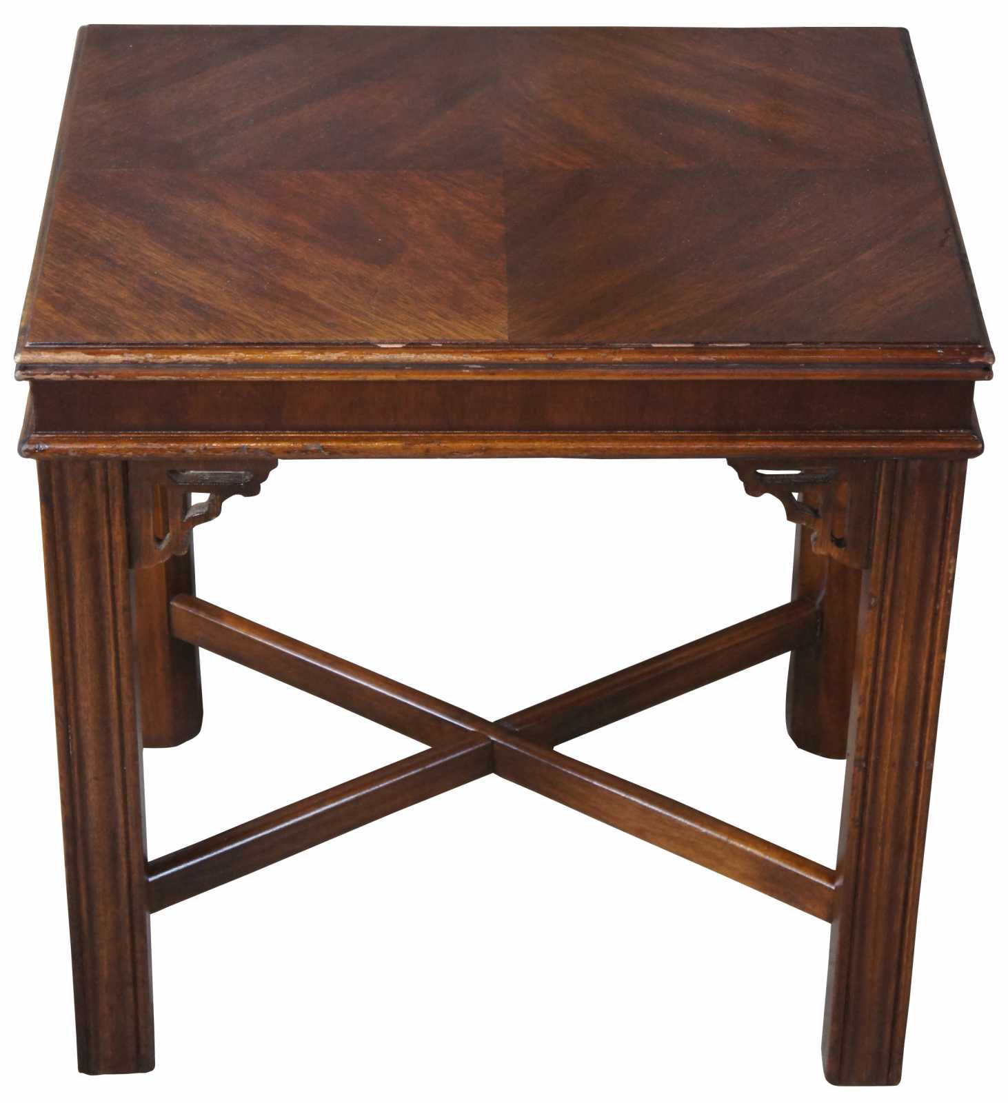 Chinese chippendale side table by Lane Furniture, circa 1980, Altavista Virginia. Made from walnut with a bookmatched veneered top over fluted legs connected by x stretcher.