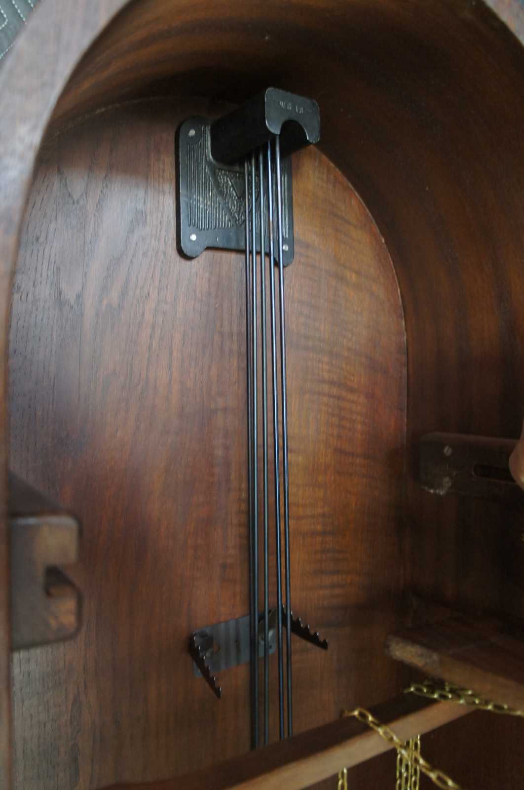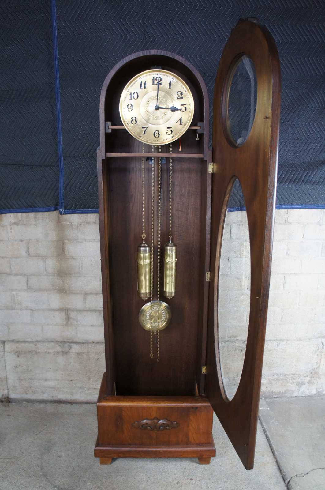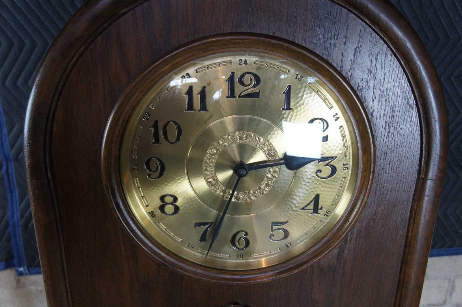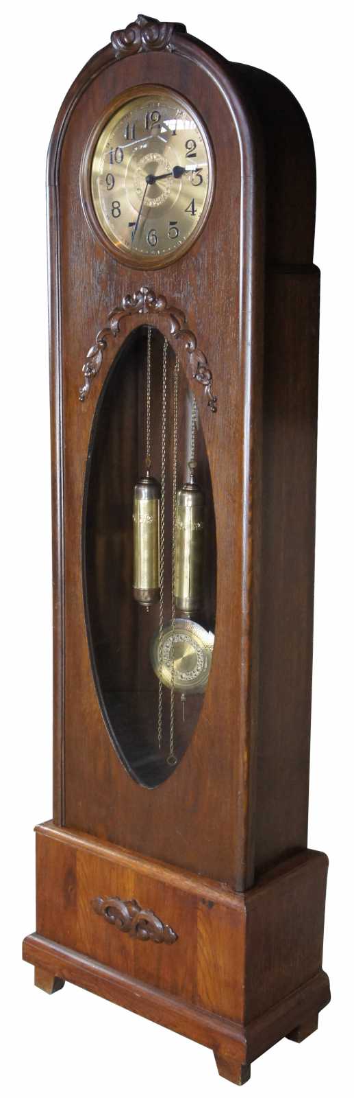 Art Deco German grandfather clock by Kieninger. This tall case clock has an oak wooden case with a round bonnet, and a plinth base featuring an appliqued foliate motif rising on squared feet. The front of the clock has an oval glass door with arched floral details, and a window for the clock face. The golden hued clock face displays black stylized Arabic numbers, an incised chapter ring, spade tipped hand, and hammered details.