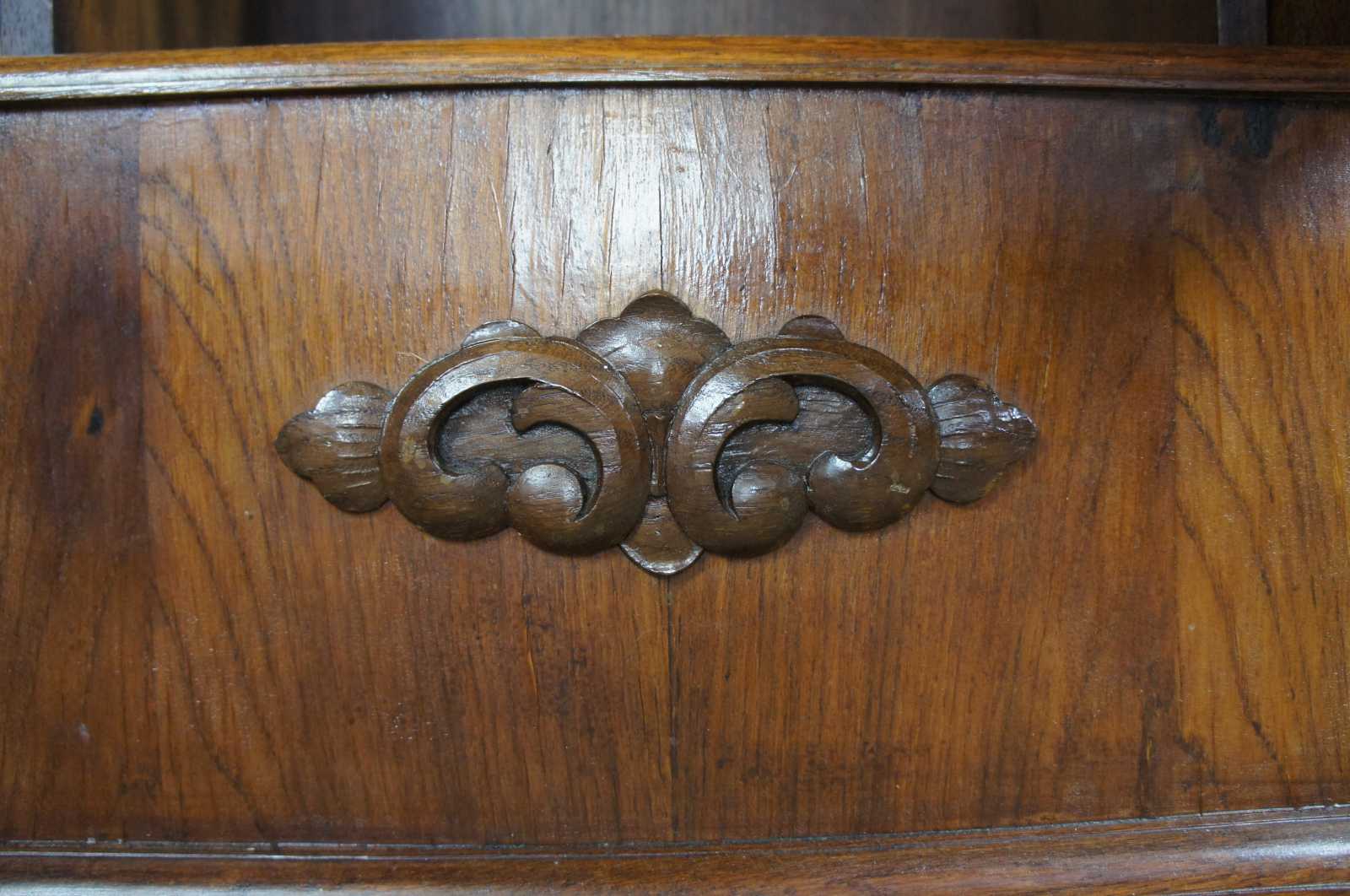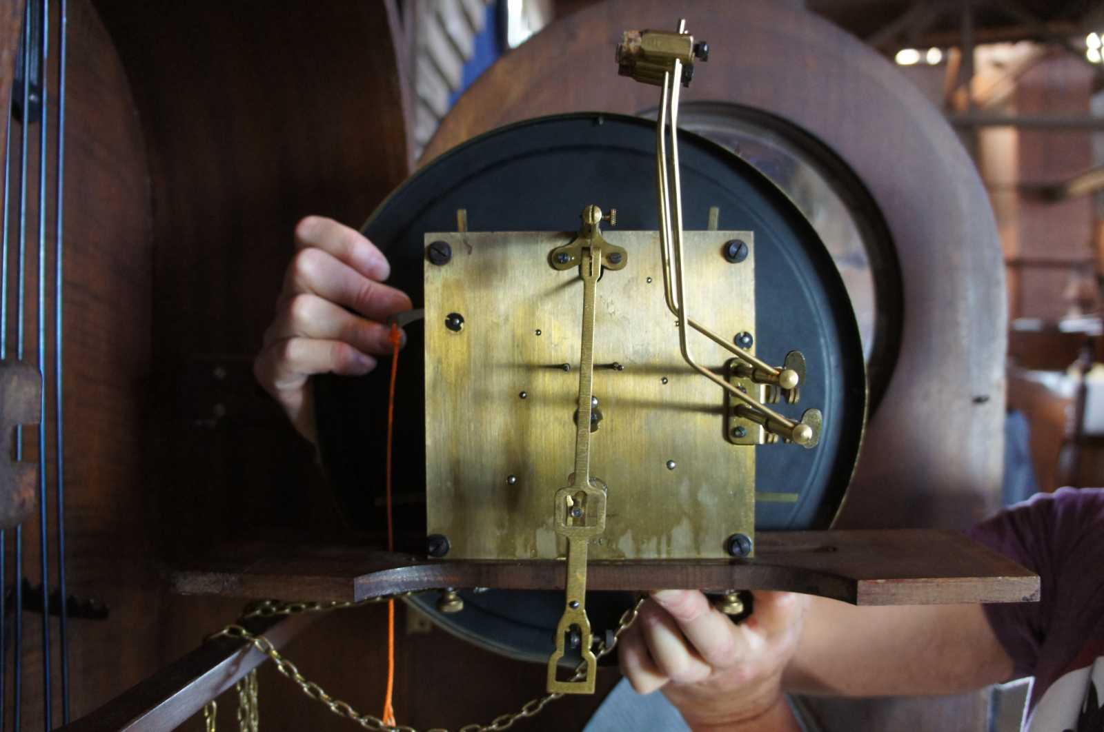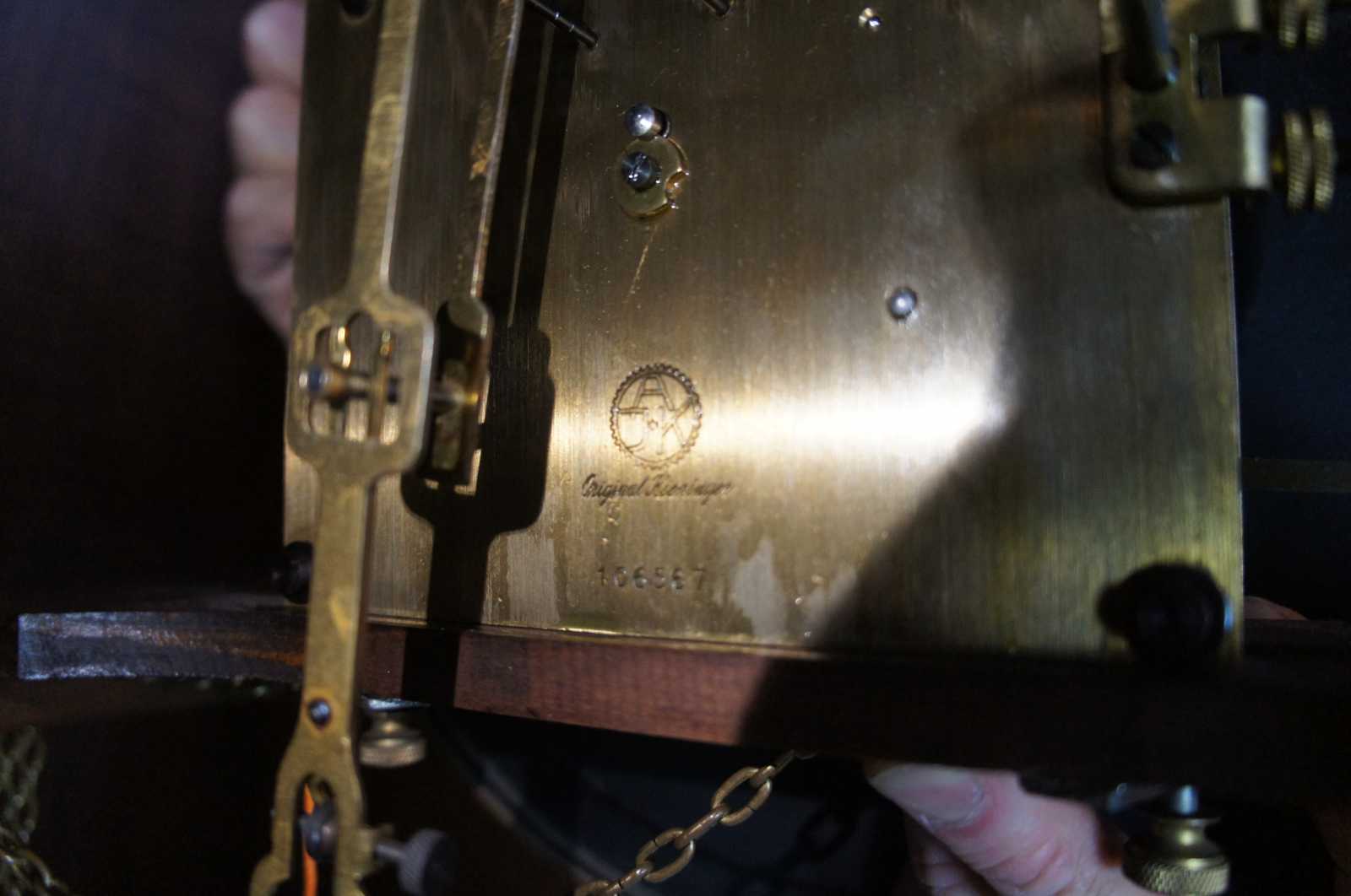 Art Deco German grandfather clock by Kieninger. This tall case clock has an oak wooden case with a round bonnet, and a plinth base featuring an appliqued foliate motif rising on squared feet. The front of the clock has an oval glass door with arched floral details, and a window for the clock face. The golden hued clock face displays black stylized Arabic numbers, an incised chapter ring, spade tipped hand, and hammered details.