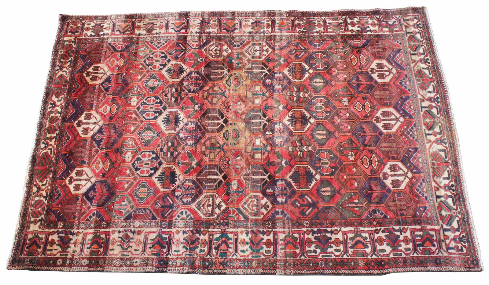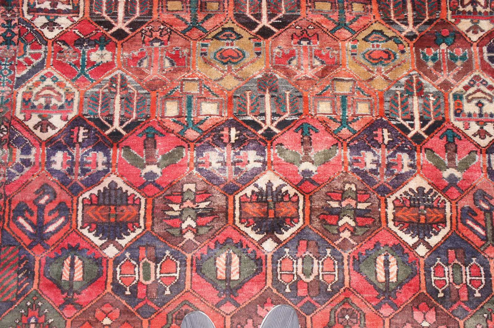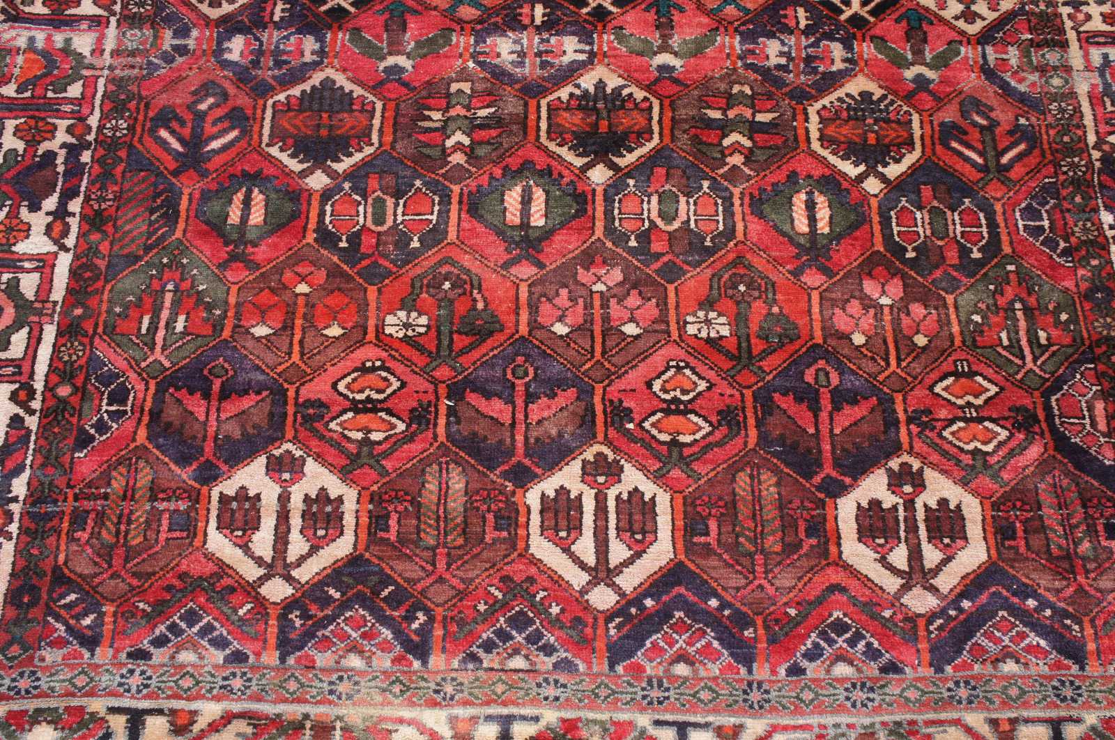 Fantasitc Antique hand knotted Persian Bakhtiar area rug. Inspired by Persian gardens with a field of red with a geometric floral pattern with greens, reds, tans, pinks, purples and orange.