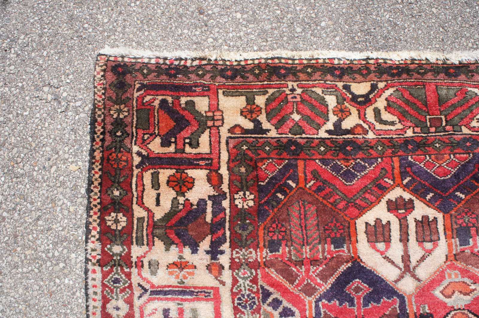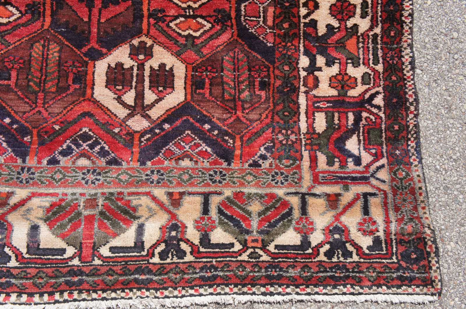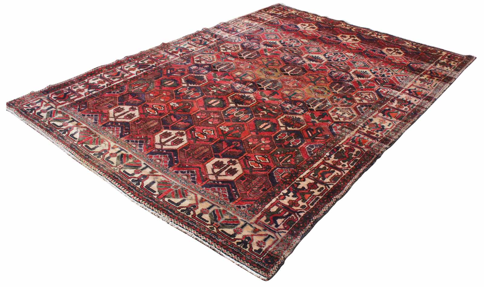 Fantasitc Antique hand knotted Persian Bakhtiar area rug. Inspired by Persian gardens with a field of red with a geometric floral pattern with greens, reds, tans, pinks, purples and orange.