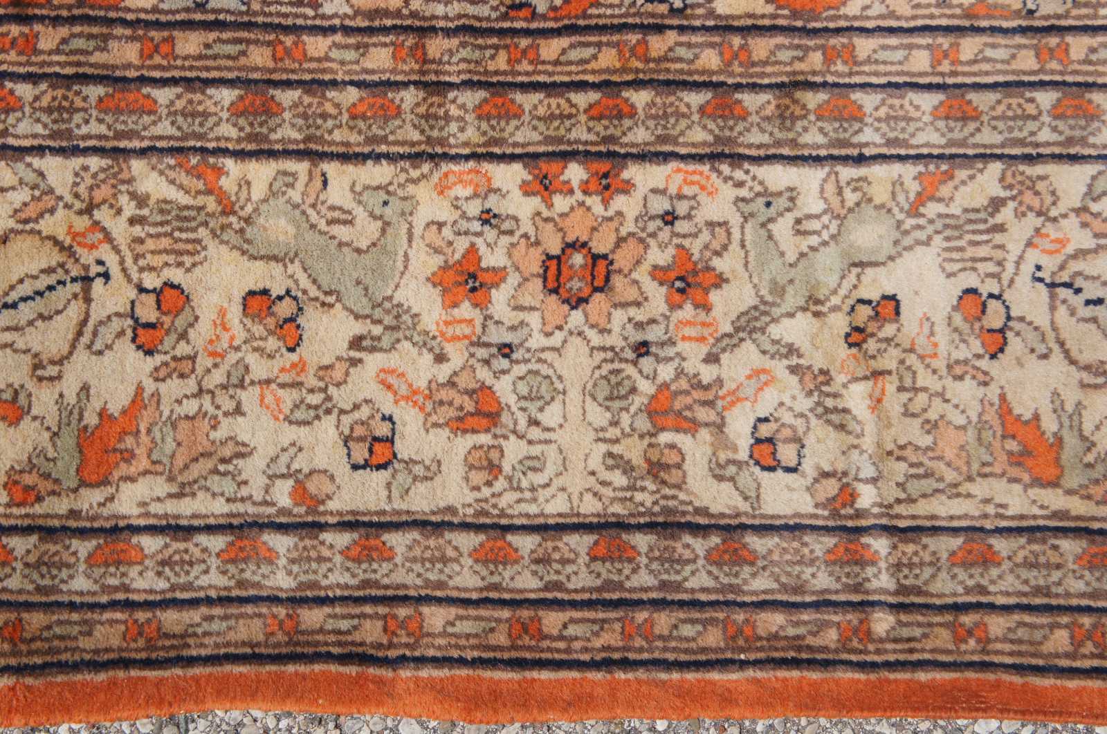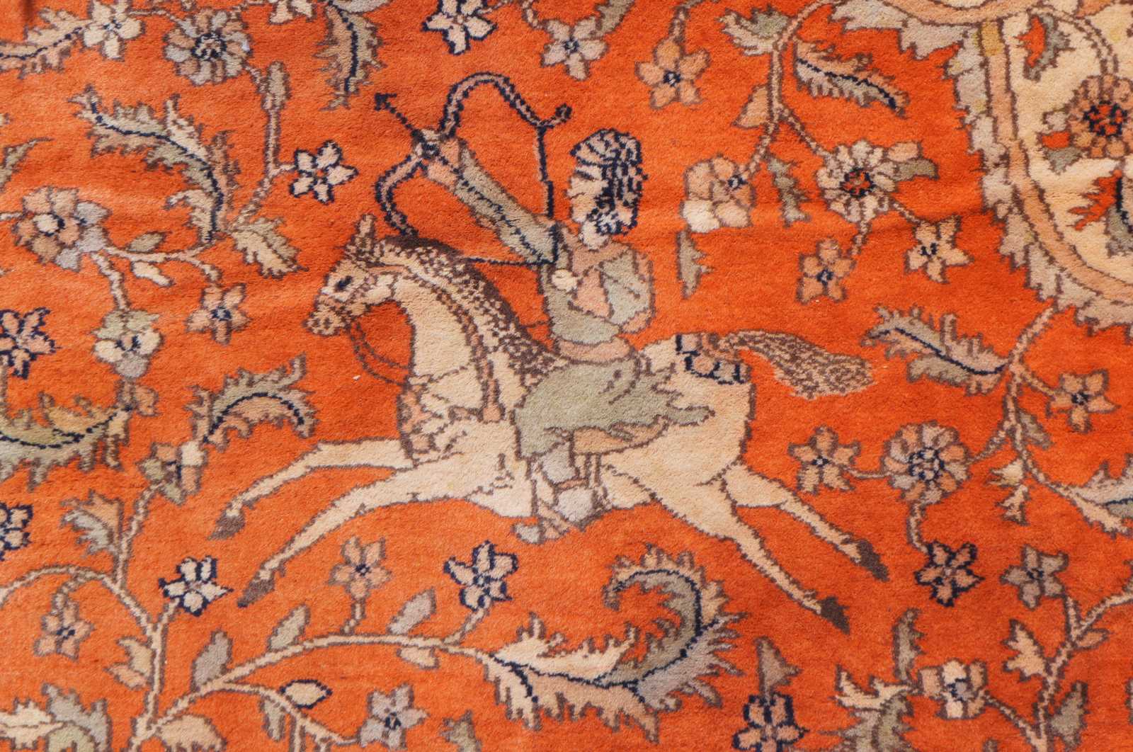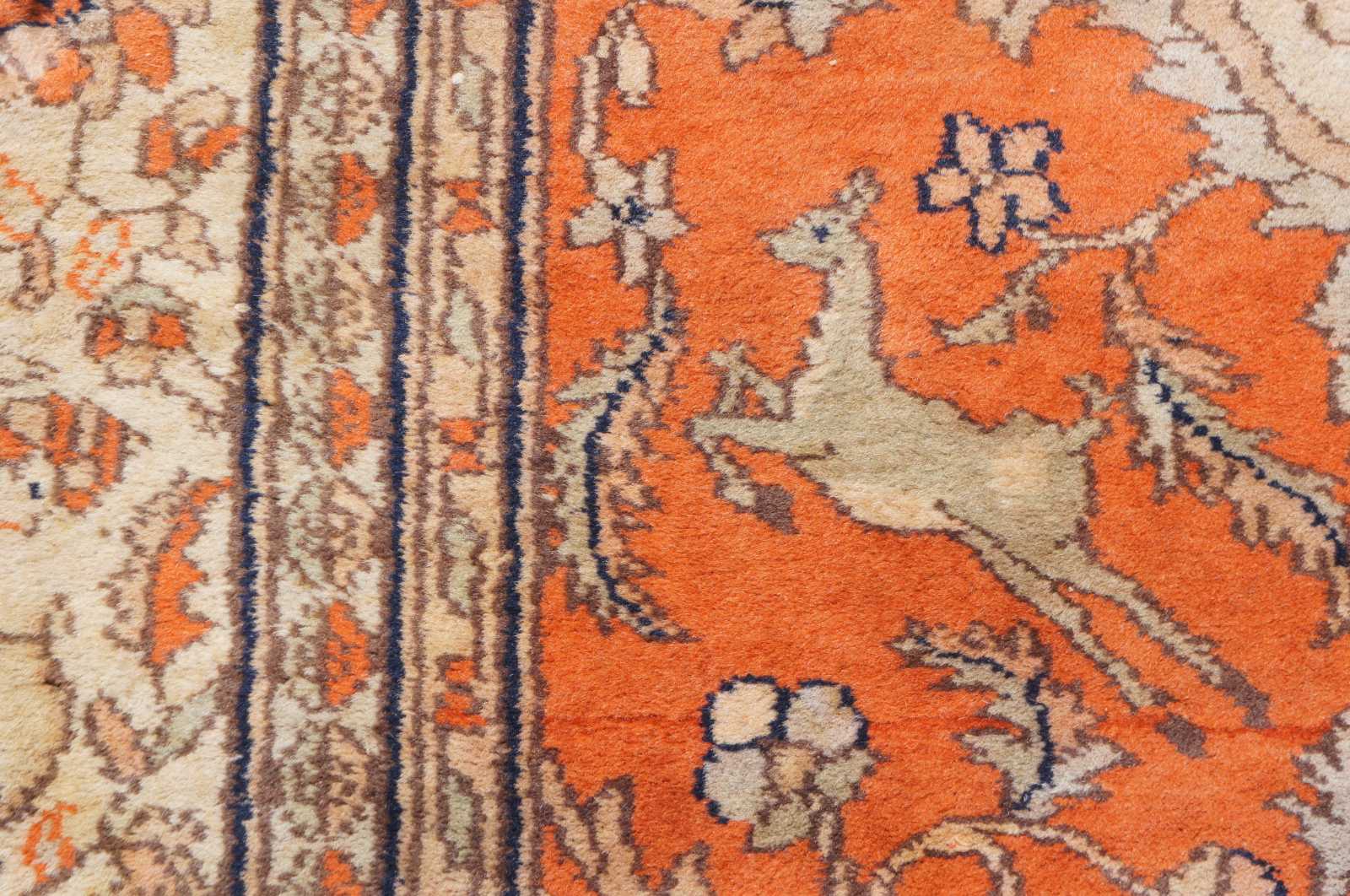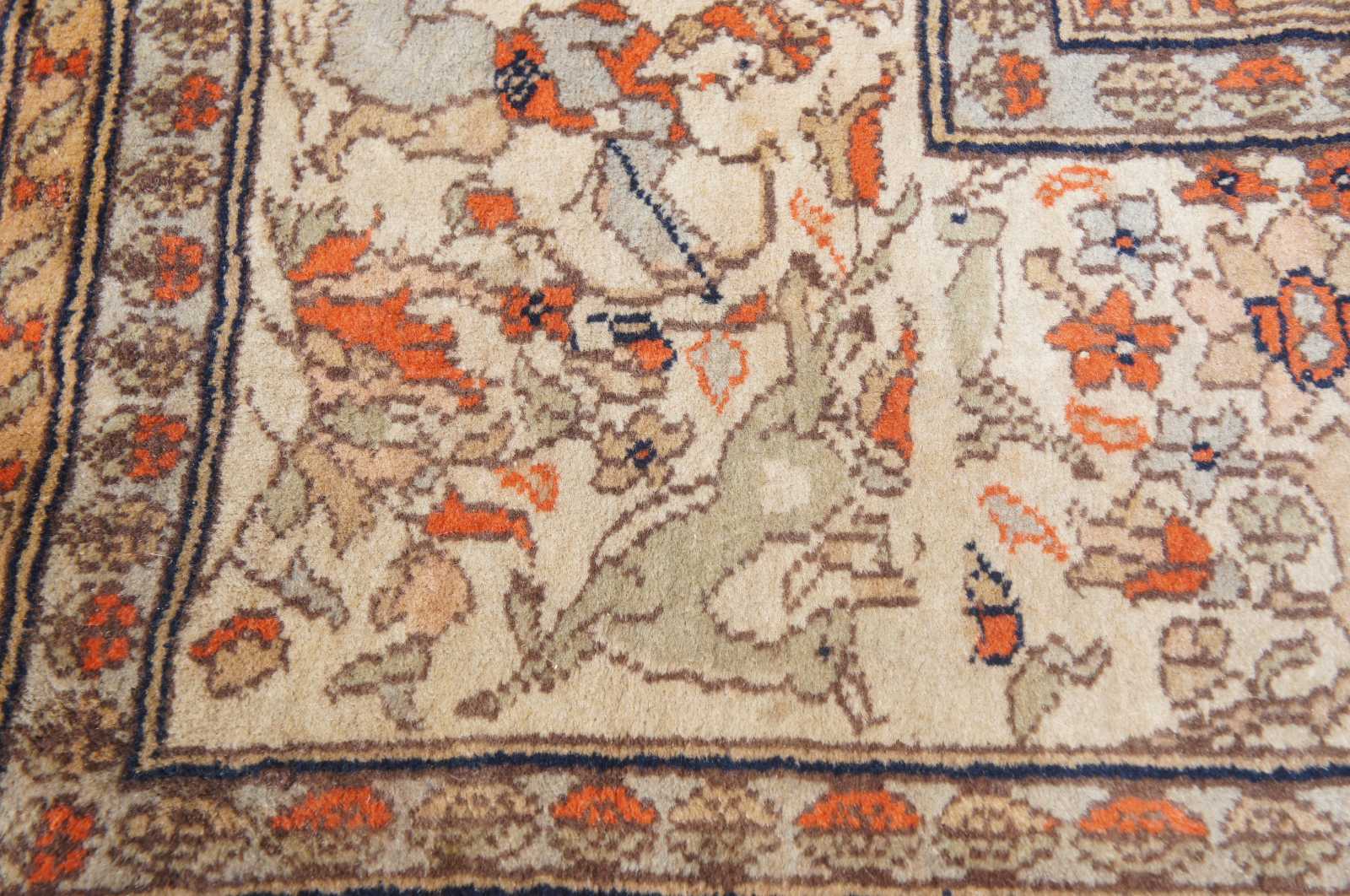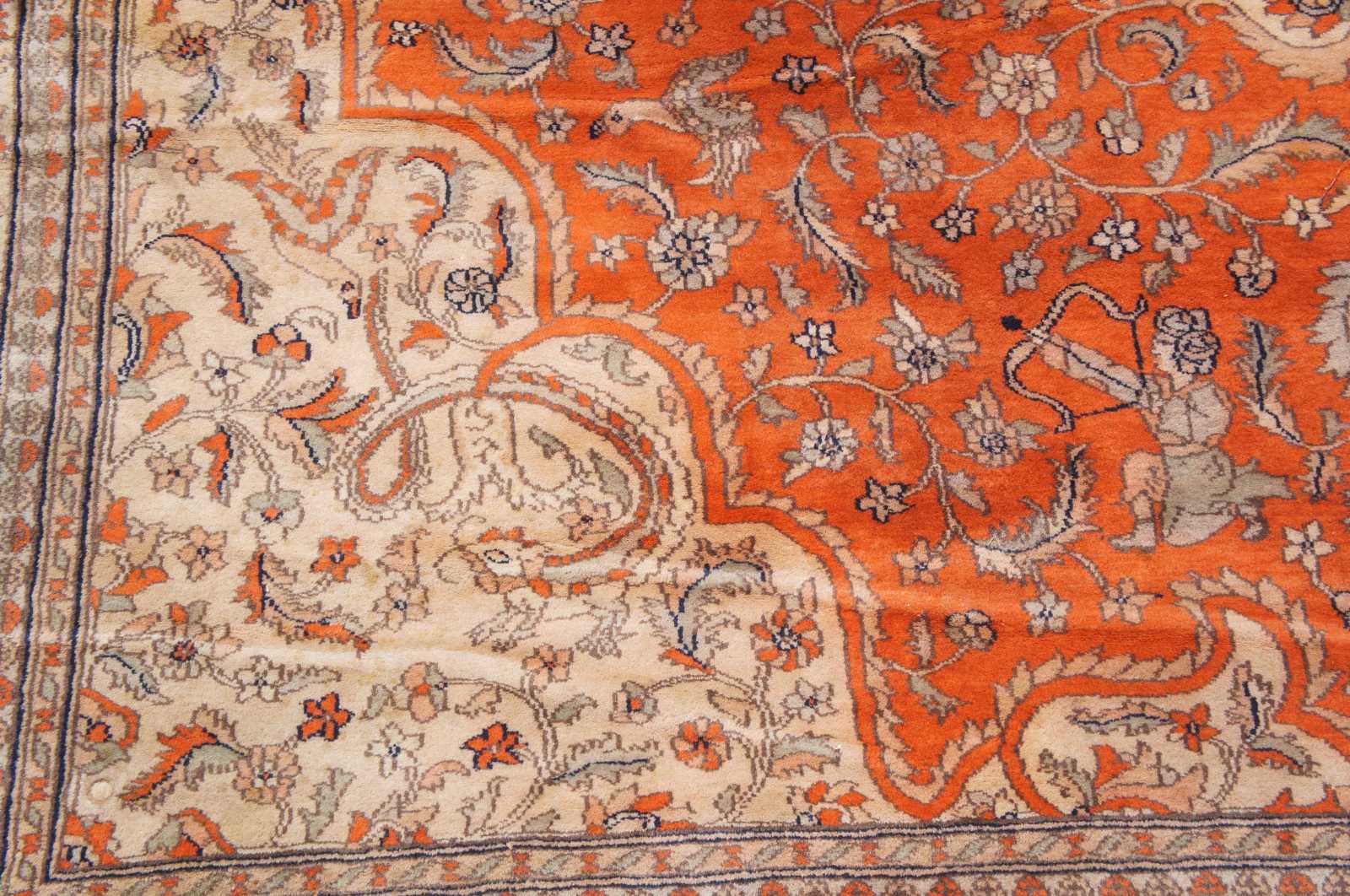 Antique hand knotted Tabriz Indo Persian area rug with a hunting scene on a orange field or forest. Features hunters shooting antelope or deer with arrows on horses and by foot. The center medallion and boarder features cream or tan floral motifs, and serpent or lizard like creatures at the center. Tans, oranges, blues, greens and browns.