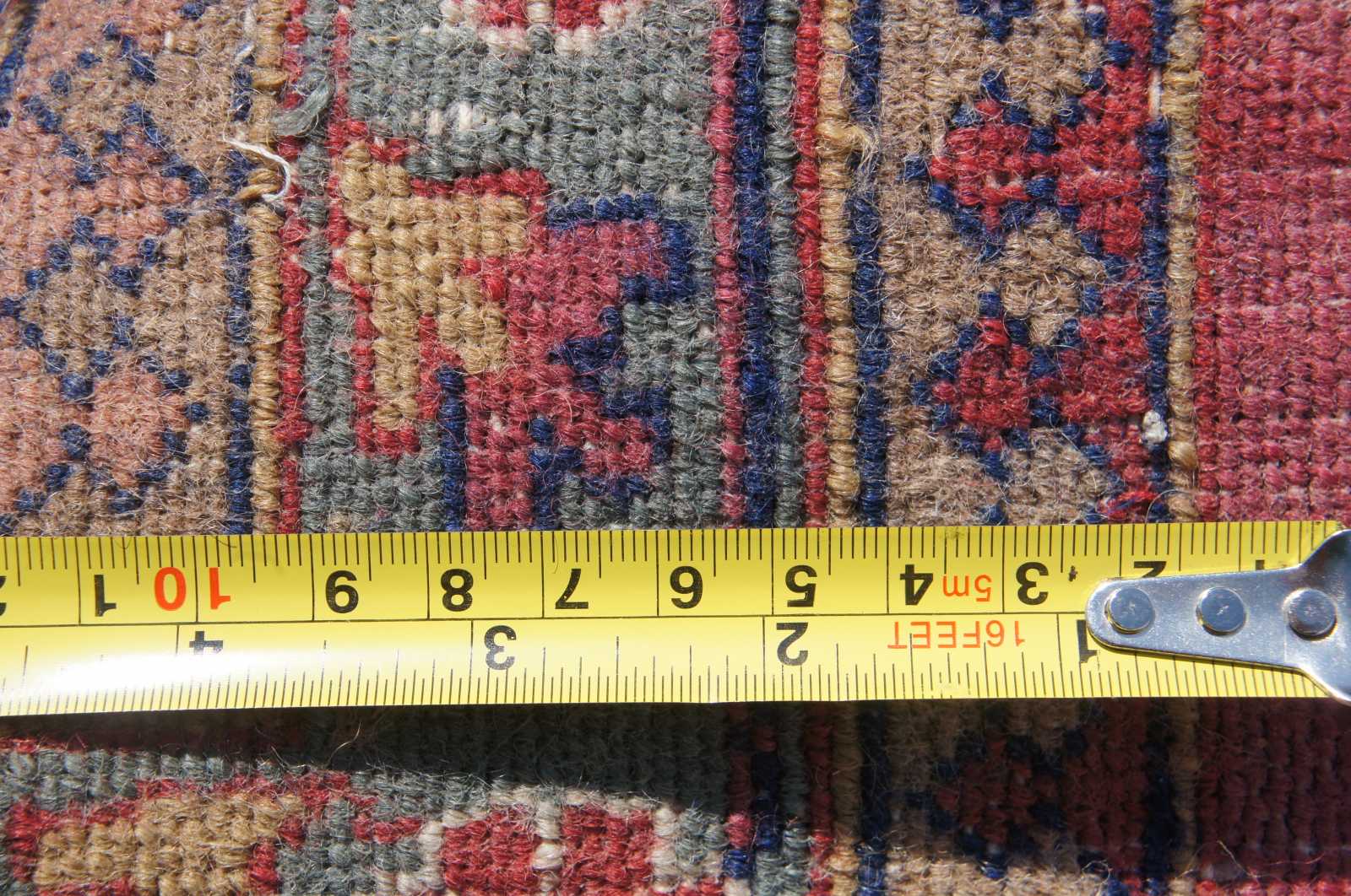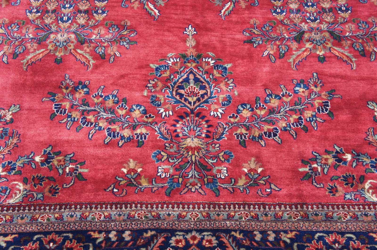 Antique hand knotted Sarugh area rug. Features a field of red with a floral spray of medallions and all over floral design, framed by a indigo / blue / purple border. Features blues, purples, reds, pinks, green and cream / beige.