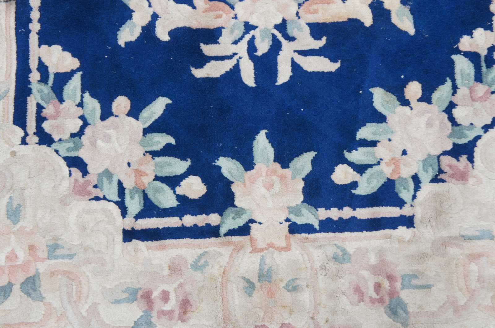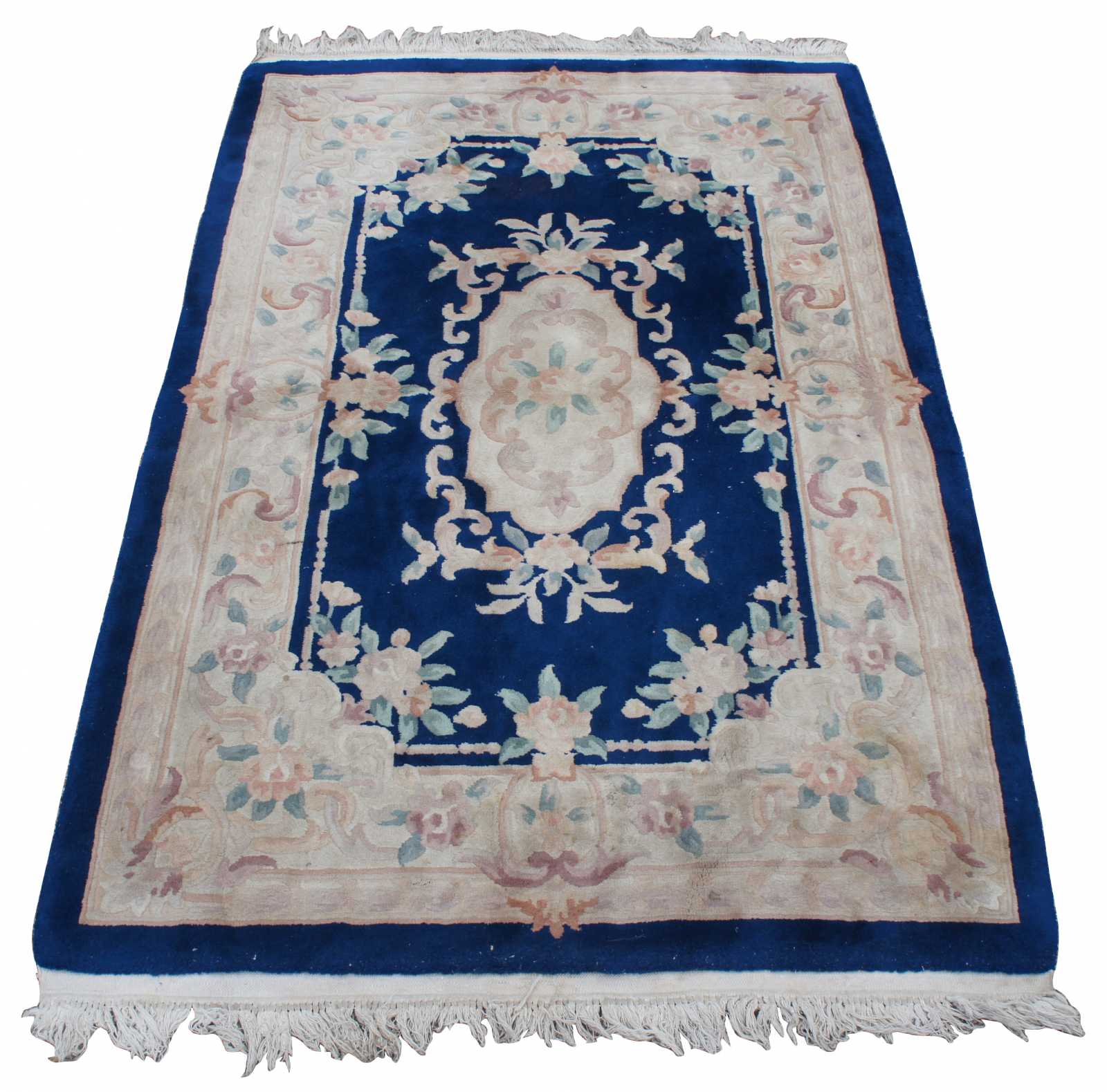 Vintage Chinese Aubusson area rug featuring a field of blues with light pink, light green, tan / cream / beige. Made of silk and wool.