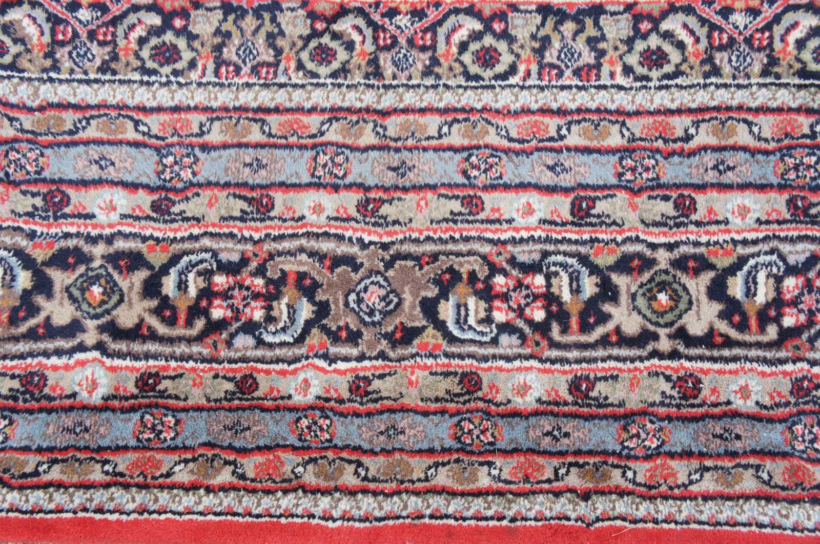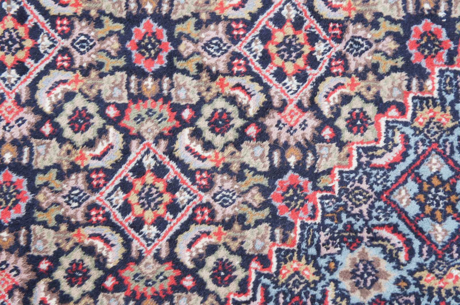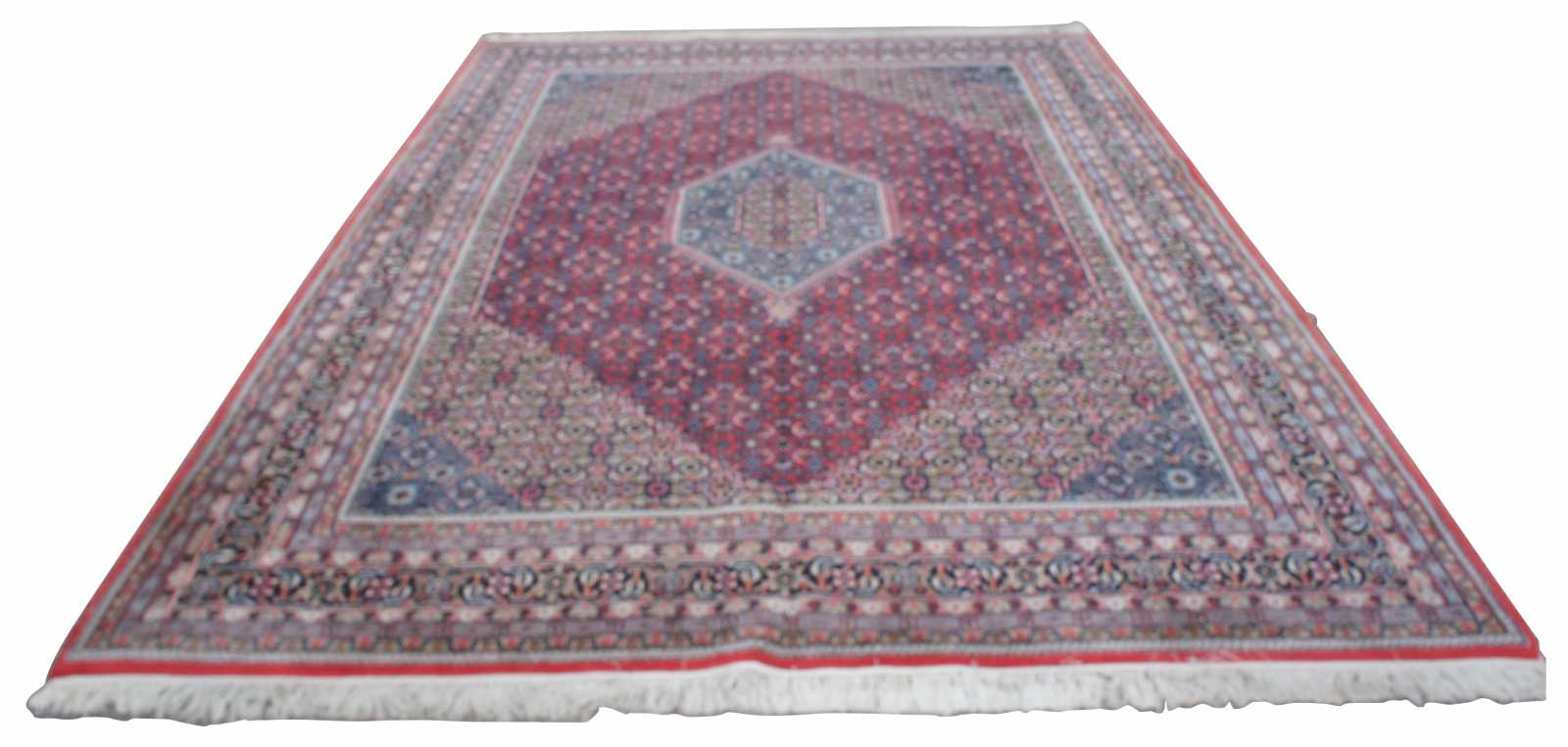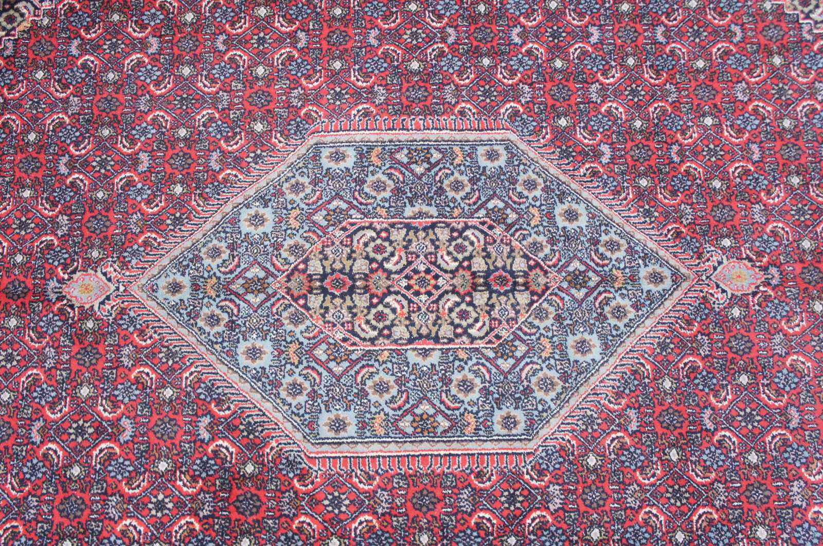 Vintage Persian Tabriz Mahi medallion area rug. Featuring a field of reds, with a central geometric shaped medallion with blues, brown, pink, green and orange accents. Made of wool in the city of Tabriz, east of Azarbaijan Province in north west Iran.