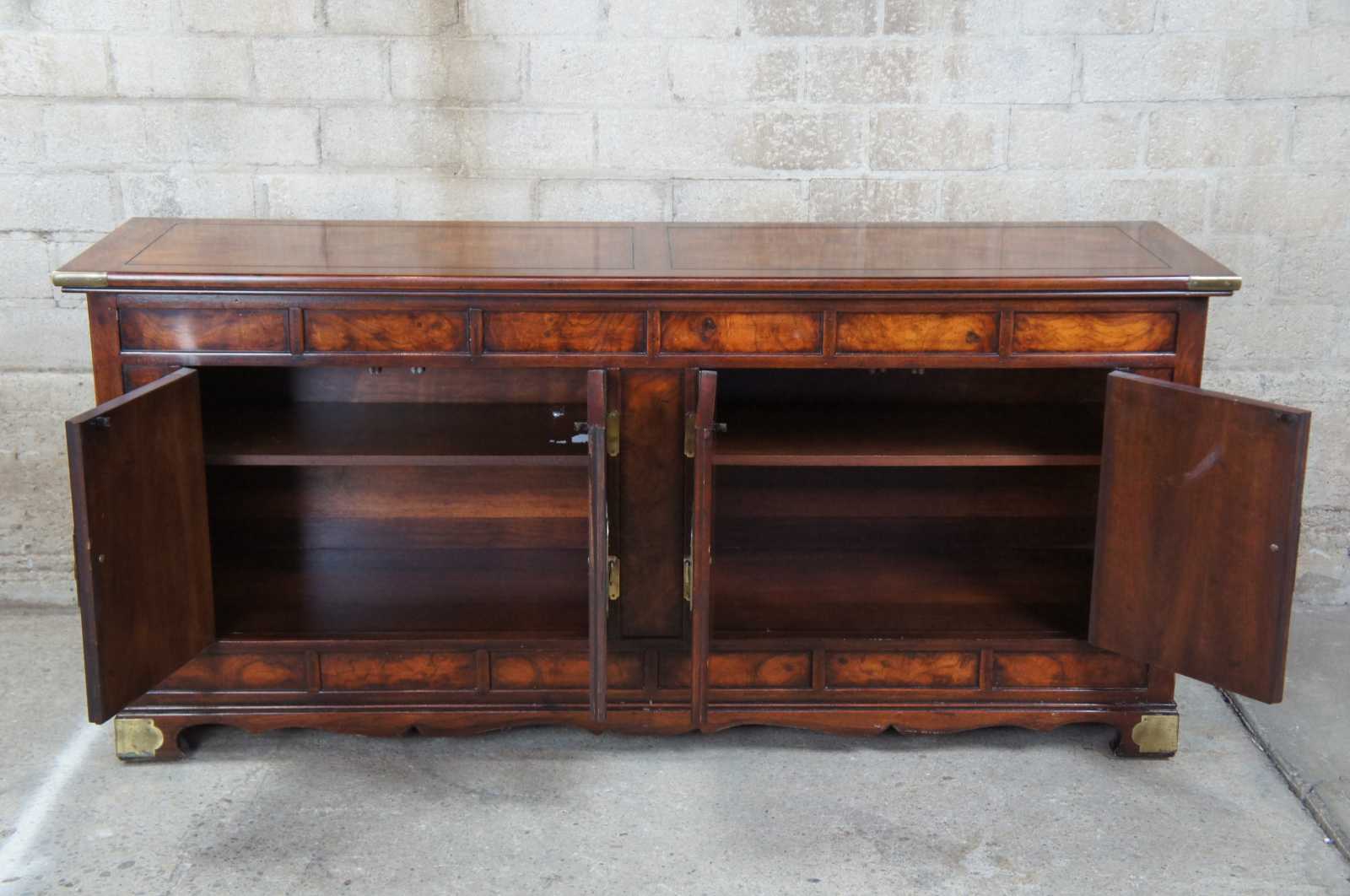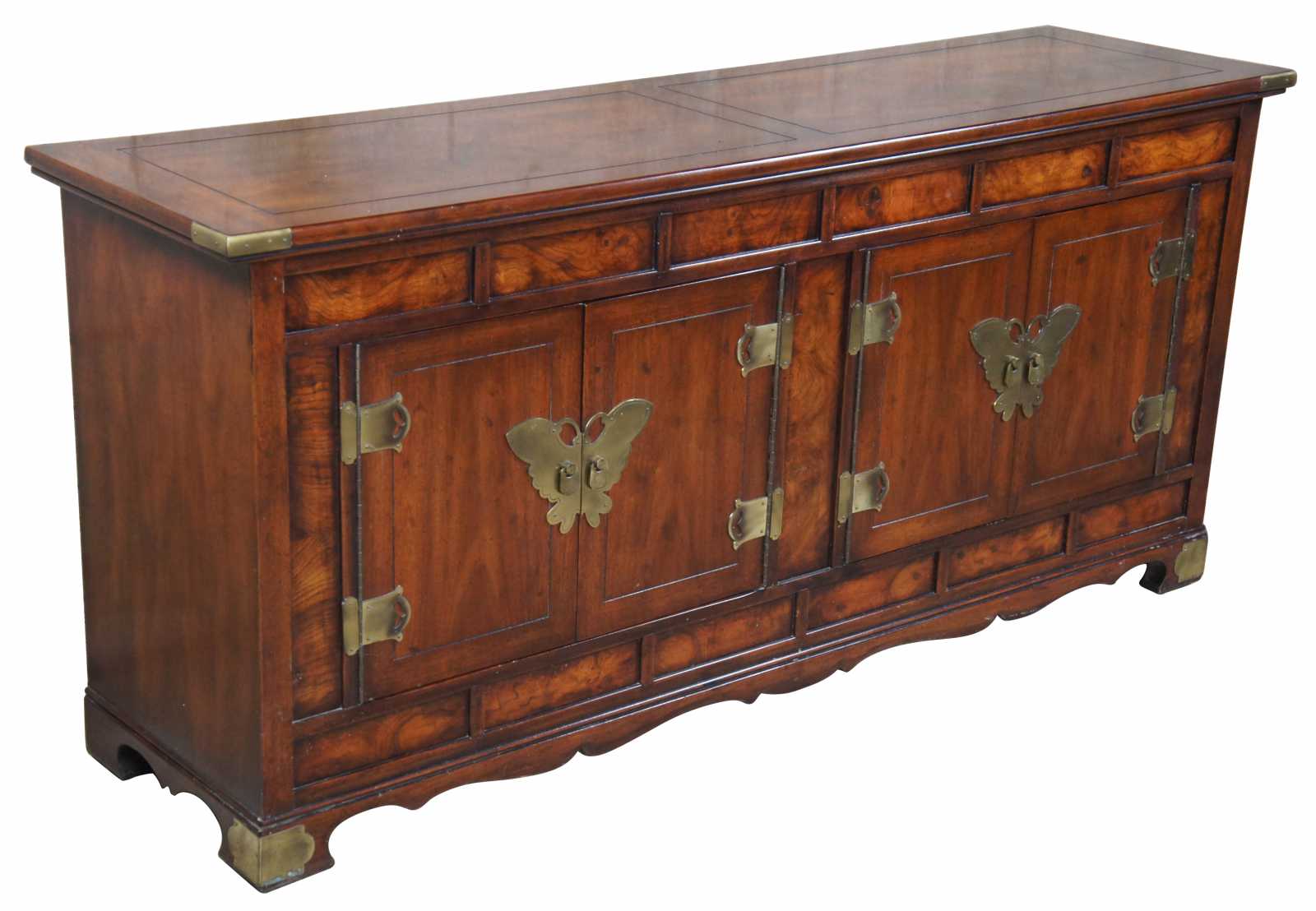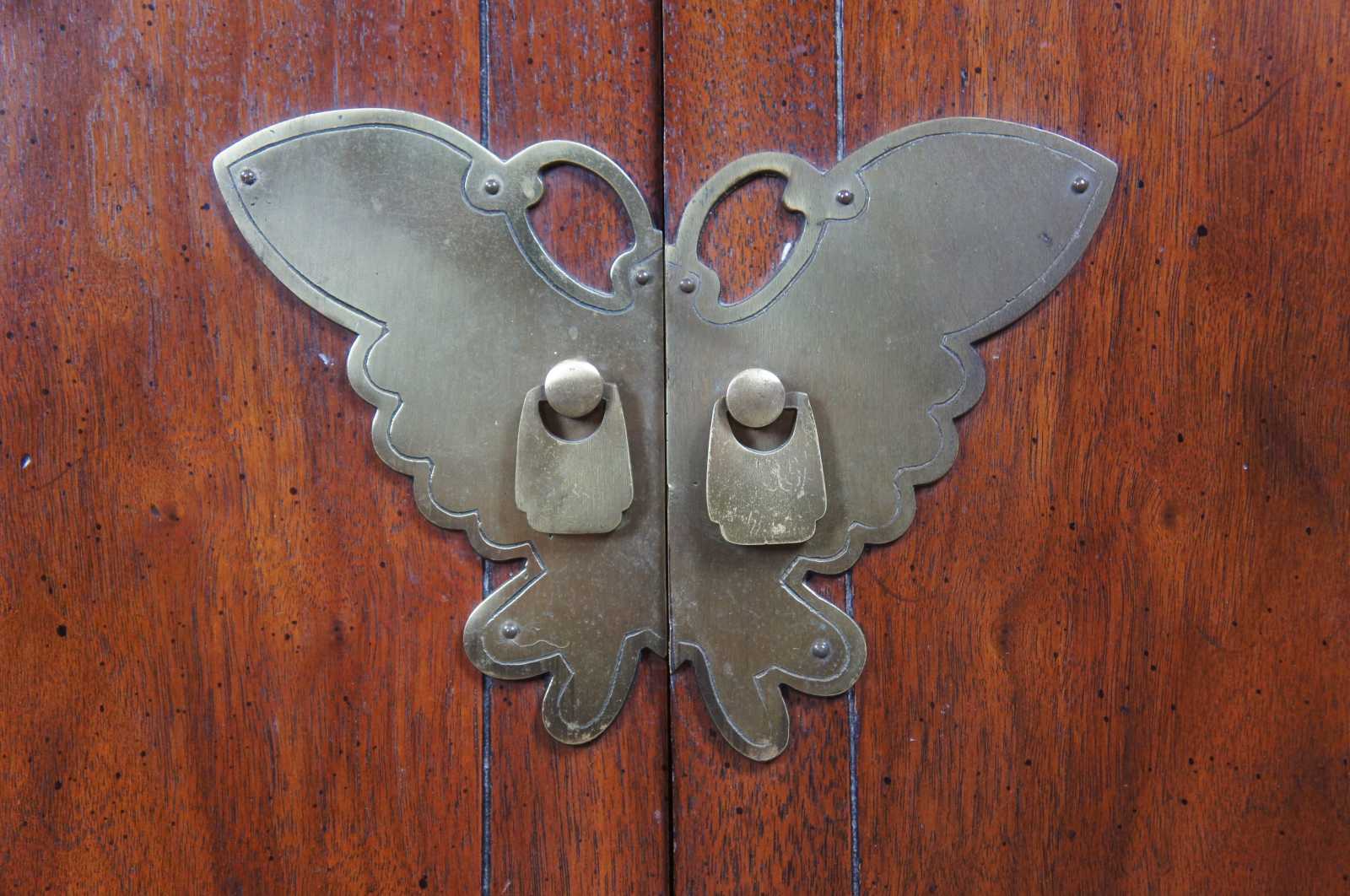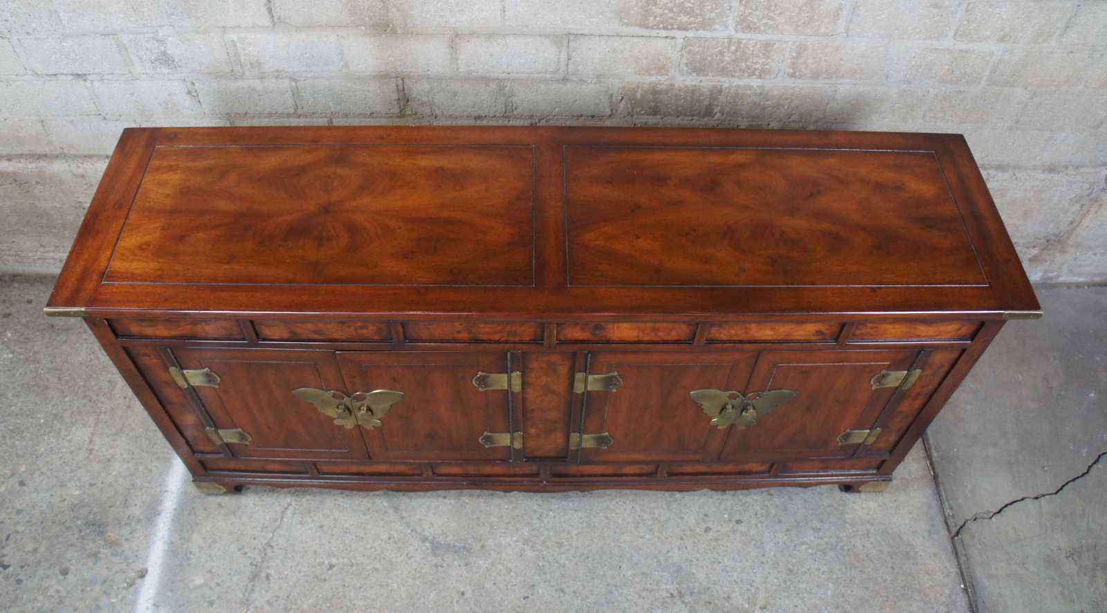 Circa 1980s Henredon Butterfly cabinet. Features campaign styling with burled panels, brass mounts, and brass butterfly hardware along the doors. The top is neatly designed with a matchbook veneer mirroring the wings of the butterfly.