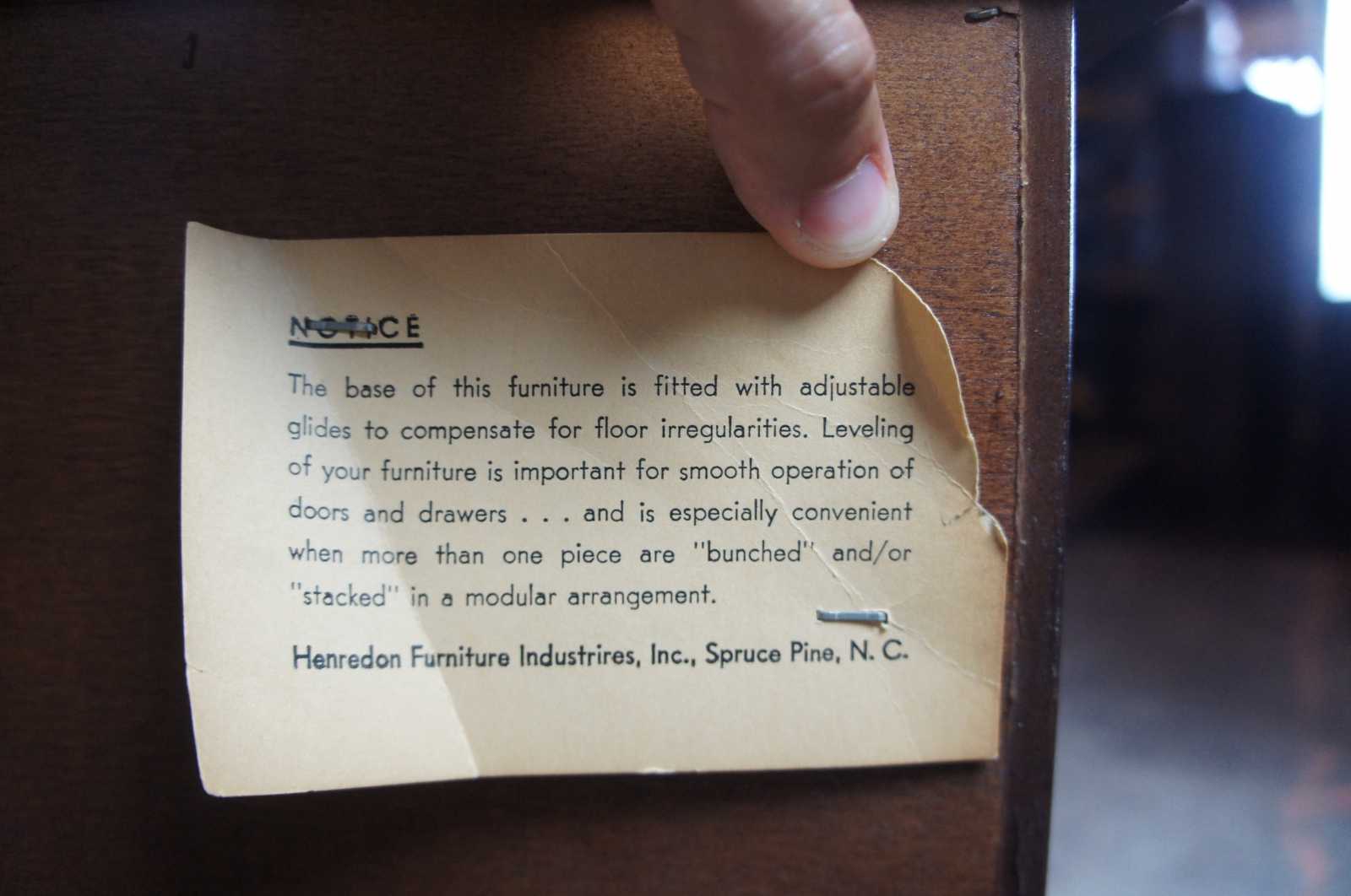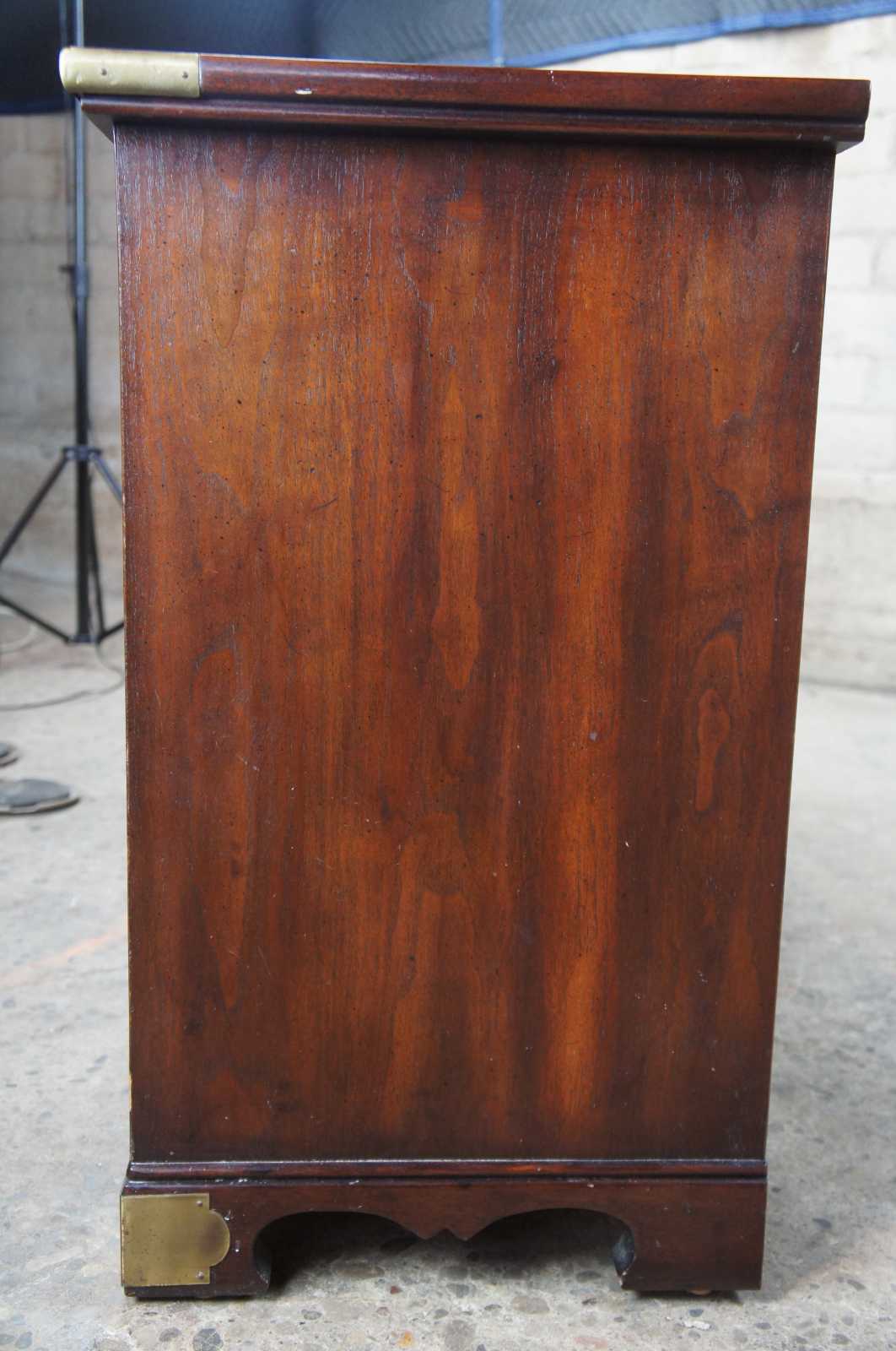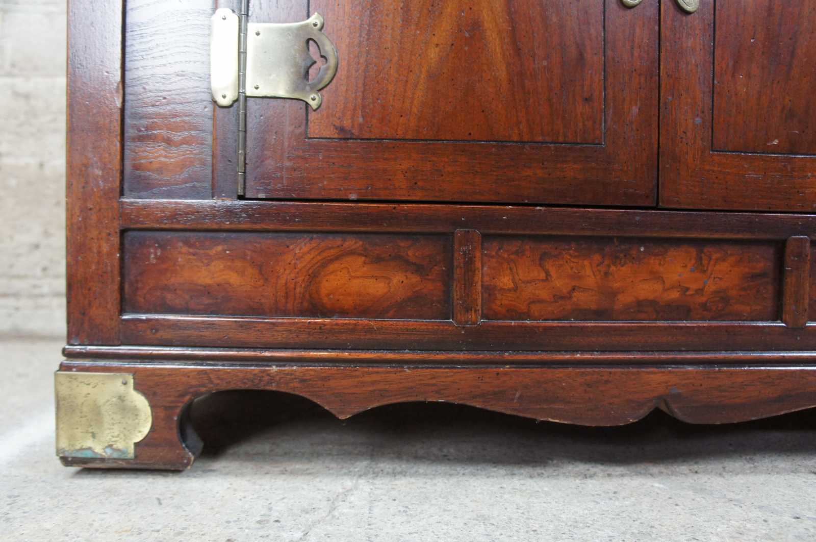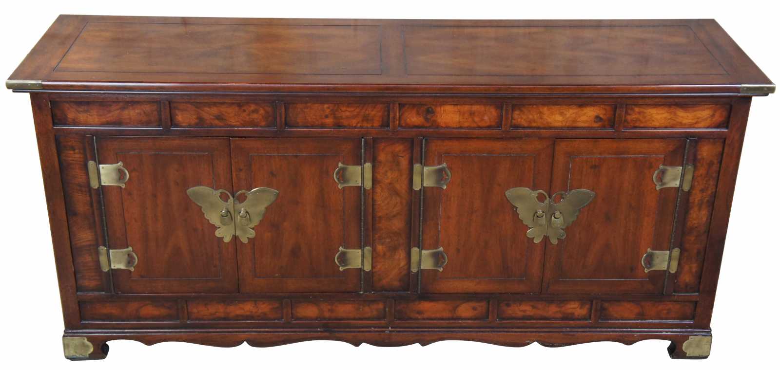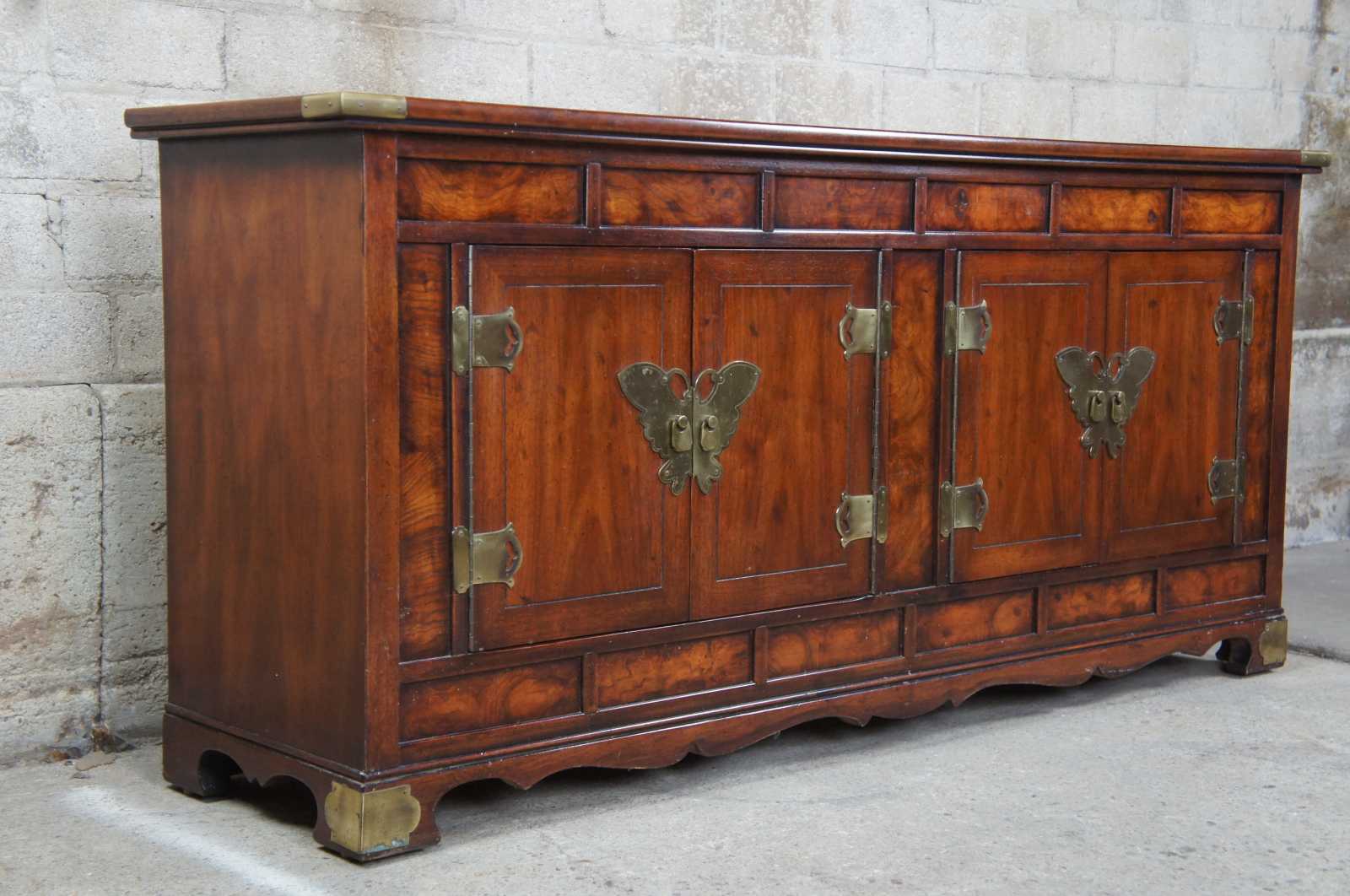 Circa 1980s Henredon Butterfly cabinet. Features campaign styling with burled panels, brass mounts, and brass butterfly hardware along the doors. The top is neatly designed with a matchbook veneer mirroring the wings of the butterfly.