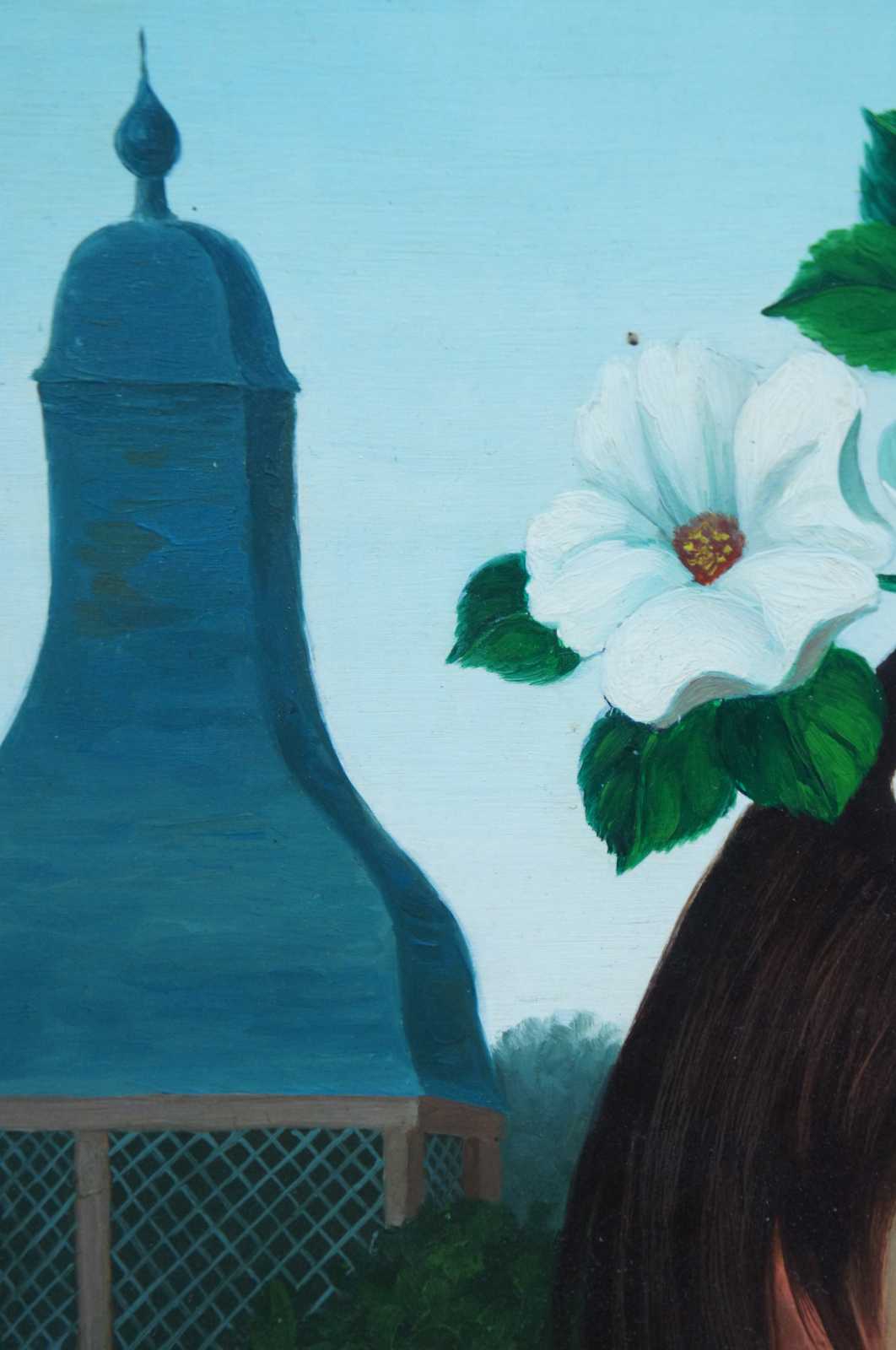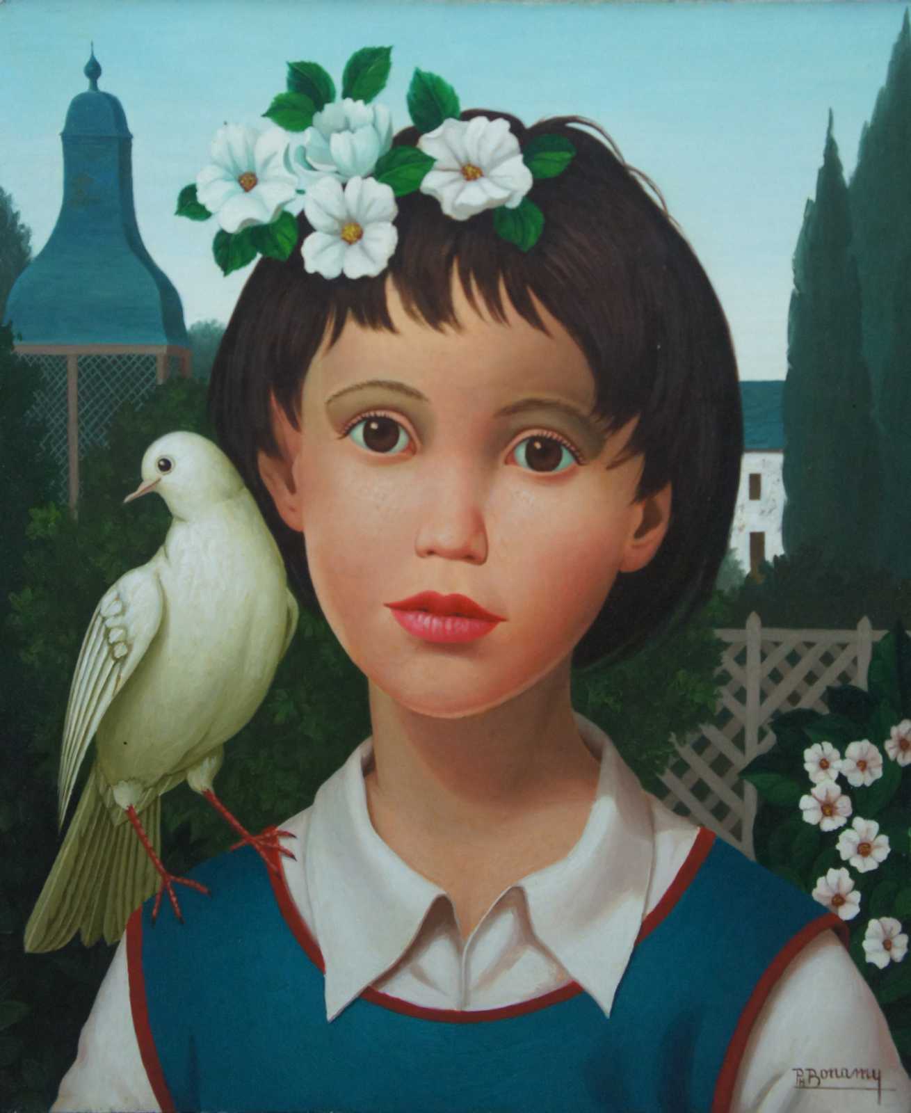 Original oil on canvas portrait by Philippe Bonamy of a brown haired girl in a blue vest with a dove on her shoulder and white flowers in her hair. / Philippe Bonamy (b. 1926) is an active artist living in France. Signed lower right.