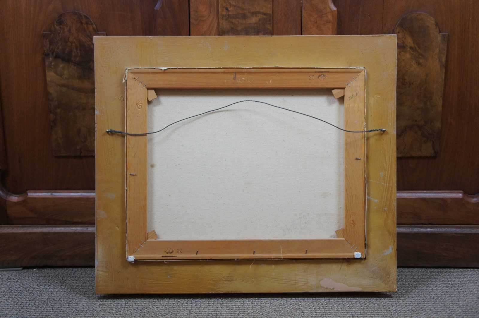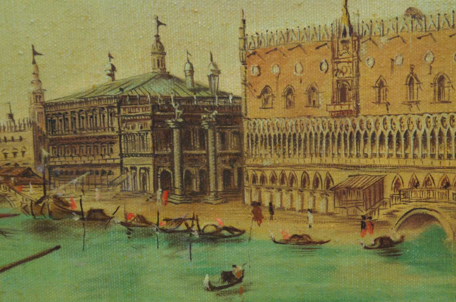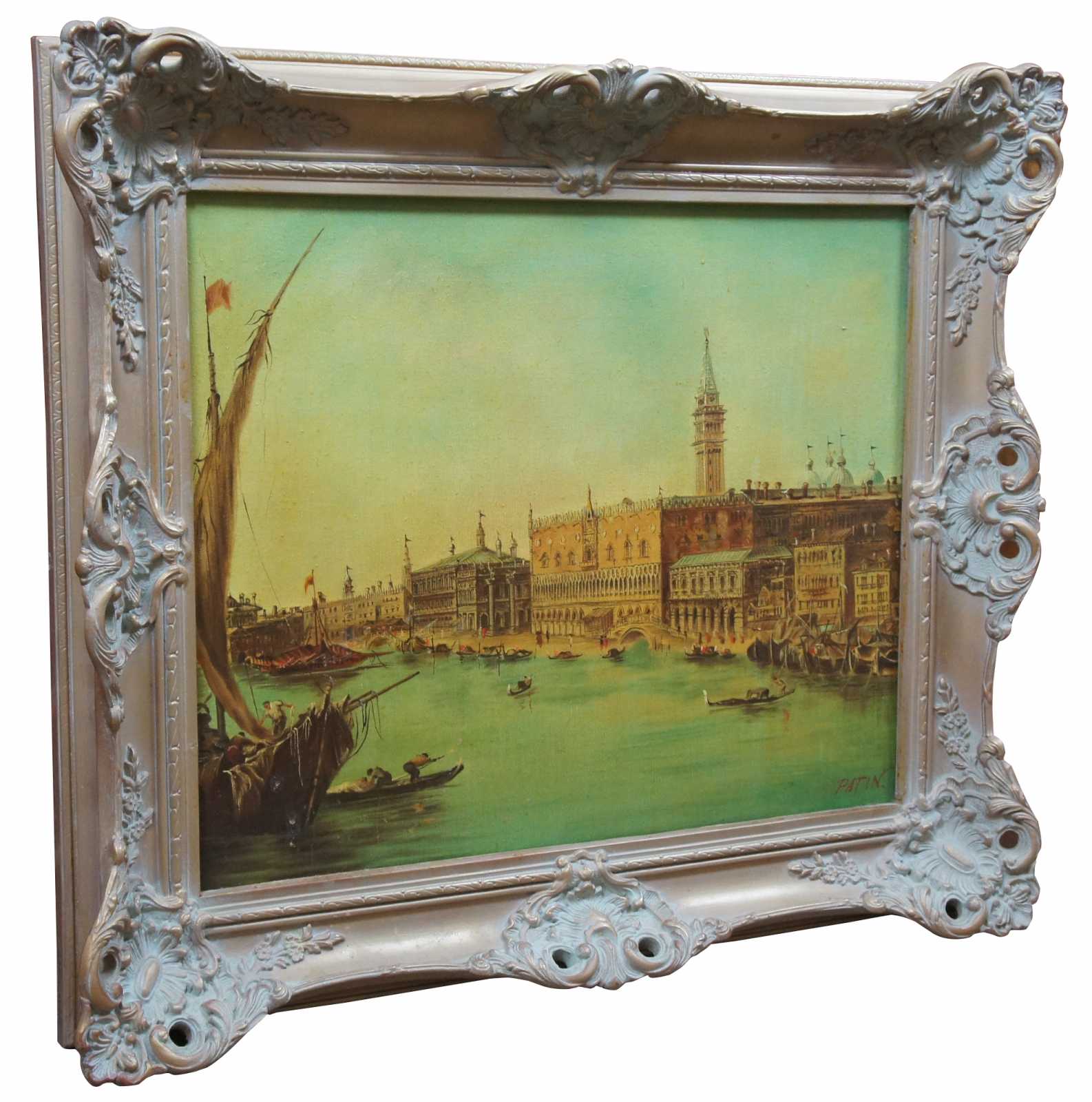 20th century glimpse of the canal in Venice Italy. Depicts vaious boats and gondolas docking in the harbour. Signed Patin lower right. The beautiful historic achitecture of Venice seen in full display along the right side.