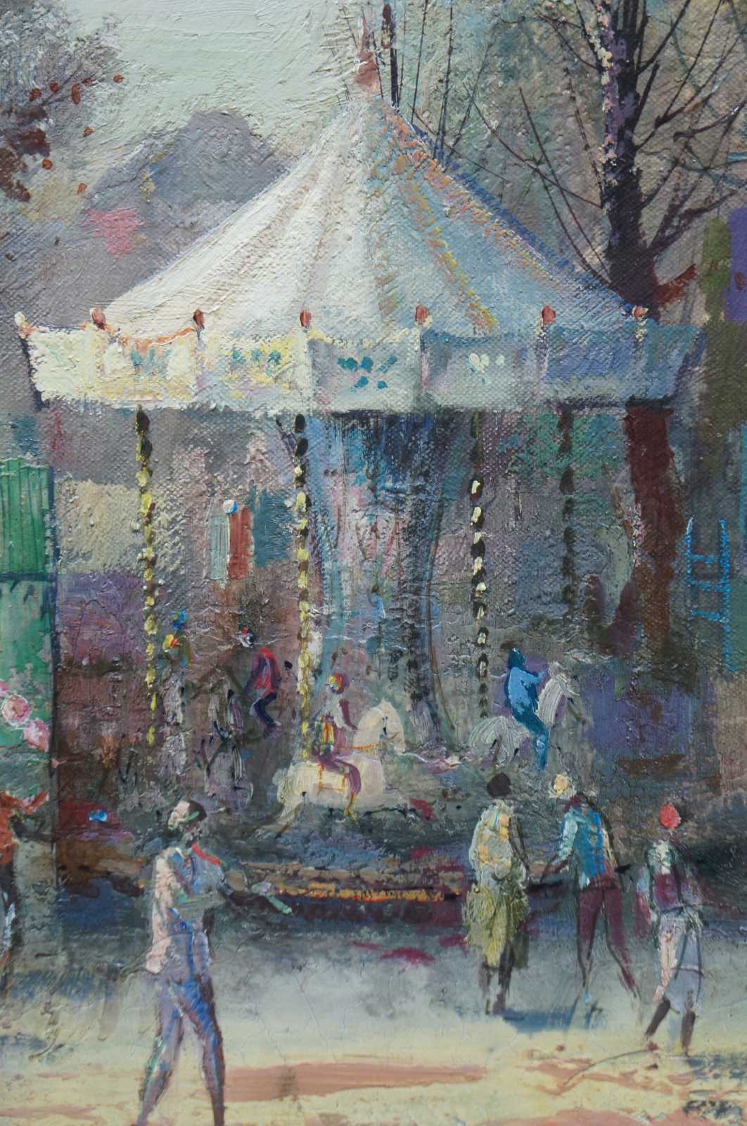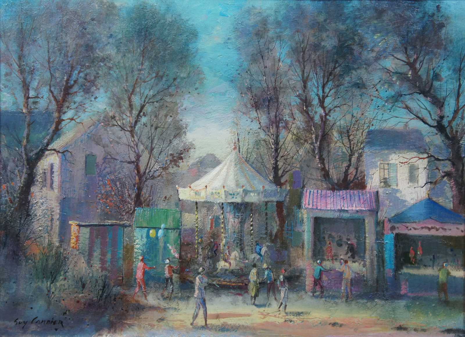 Impressionist cityscape painting of a French neighborhood traveling carnival or circus with ferris wheel, tents and games by Guy Cambrier. Guy Cambier was born in Uccle-lez-Bruxelles in 1923. He was a painter of genre scenes, figures, portraits and still life paintings. At the age of nine years old, he lost the use of his legs caused by a tragic accident.