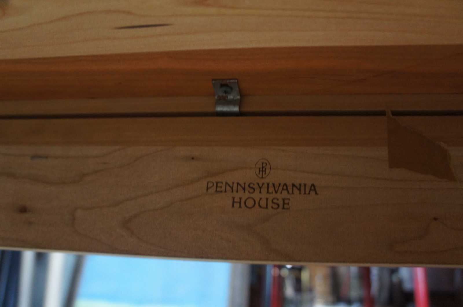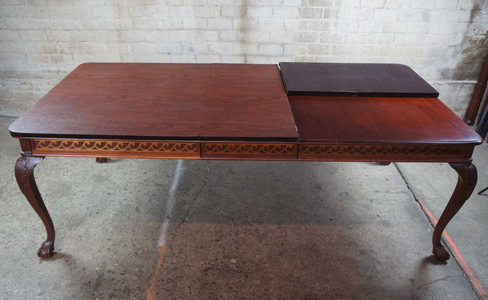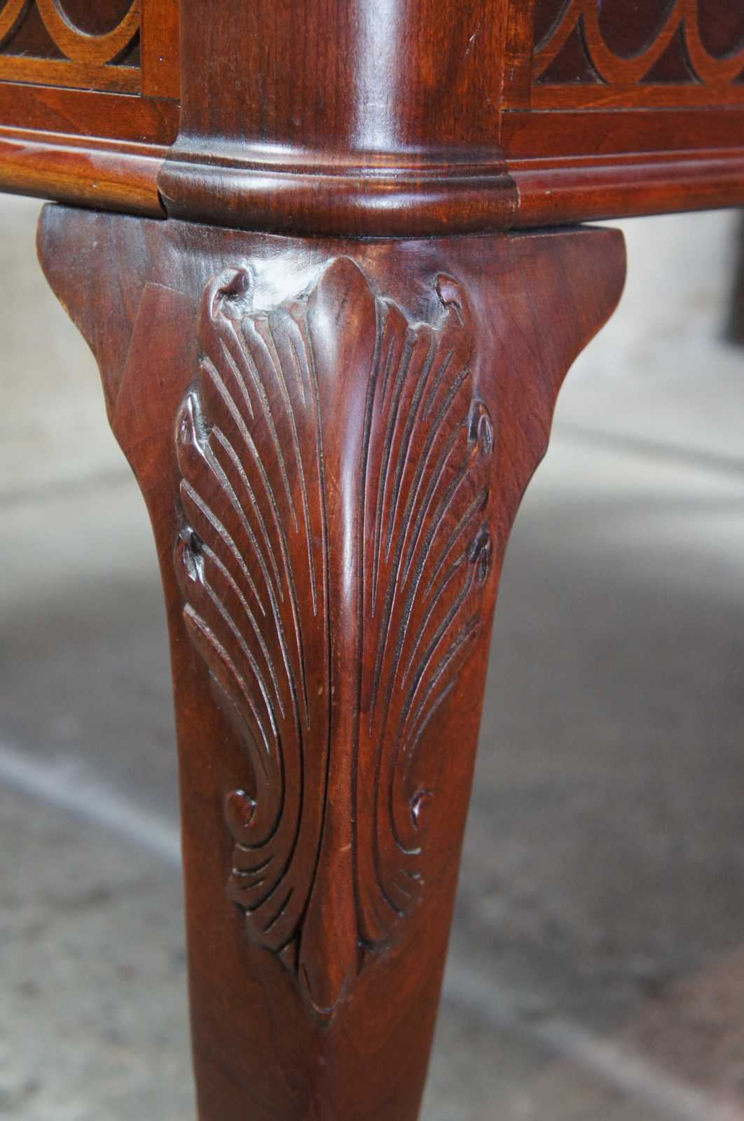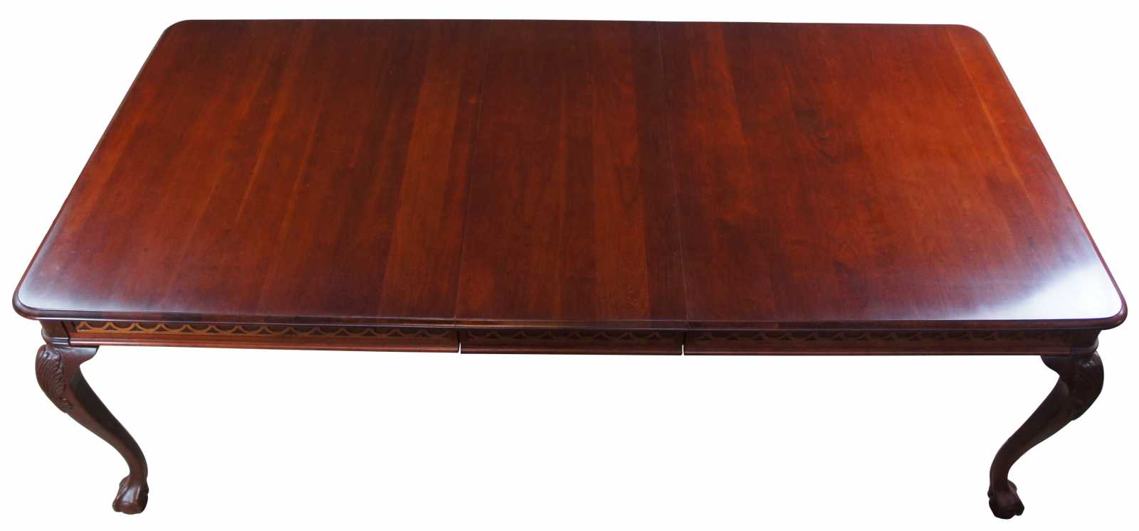 Circa 2000 Pennsylvania House dining room table. Features chippendale styling with a wavecrest carved apron, cabriole legs with scalloped medallion leading to ball and claw carved foot. Made from solid cheery, includes one leaf and table pads.