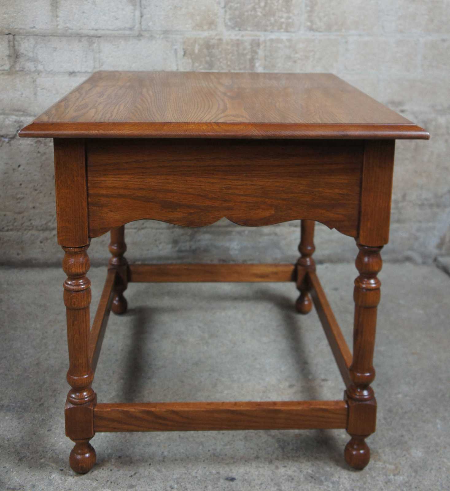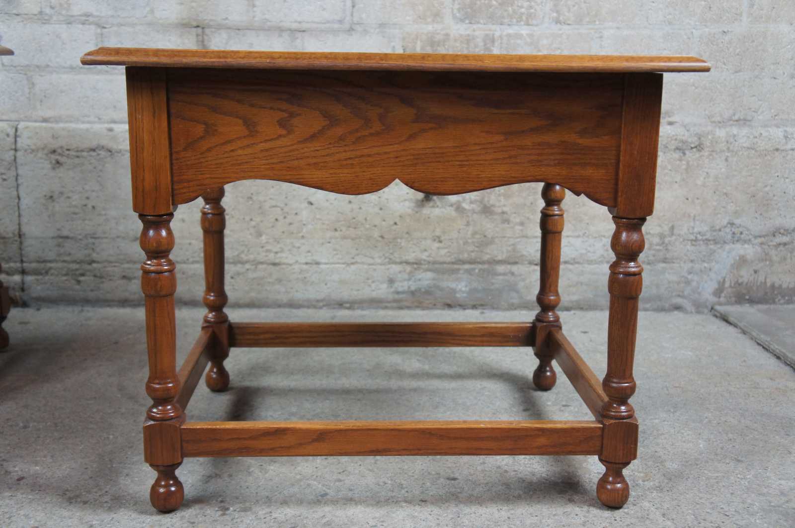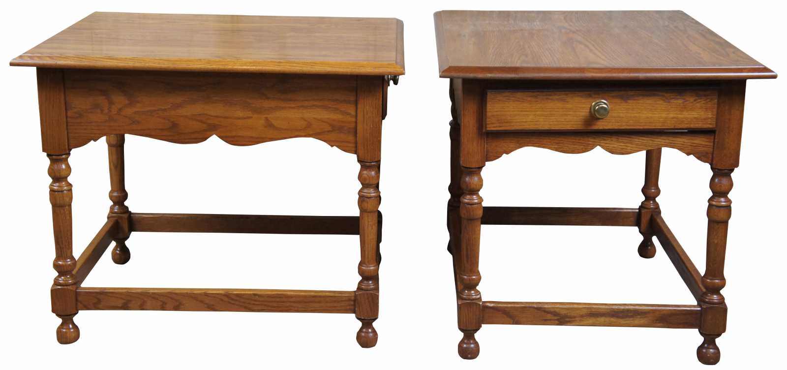 Oak end tables by Pennsylvania House. This rectangular table features a single drawer and a serpentine apron; the drawer is equipped with a brass tone knob pull and is marked “Pennsylvania House” to the interior.