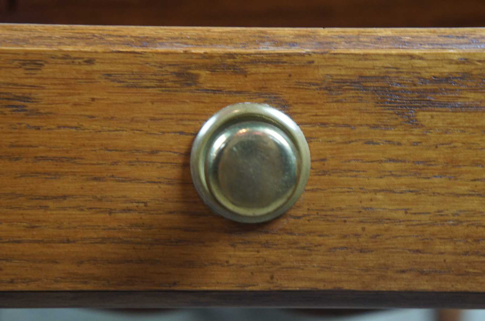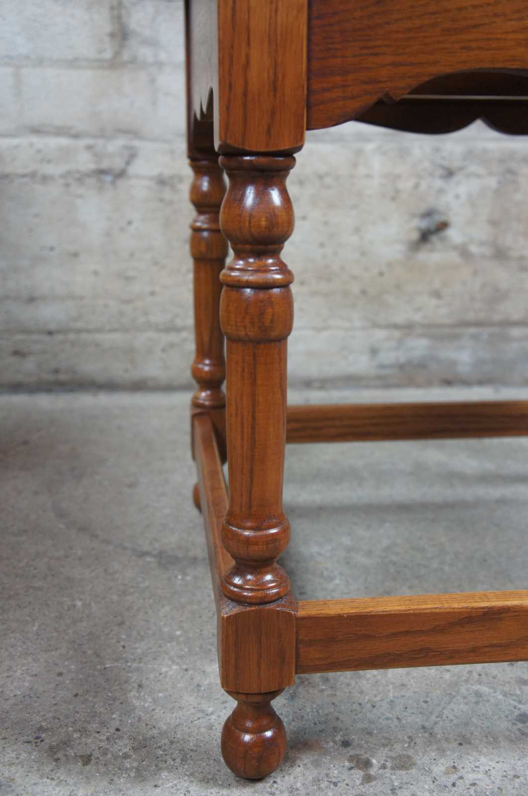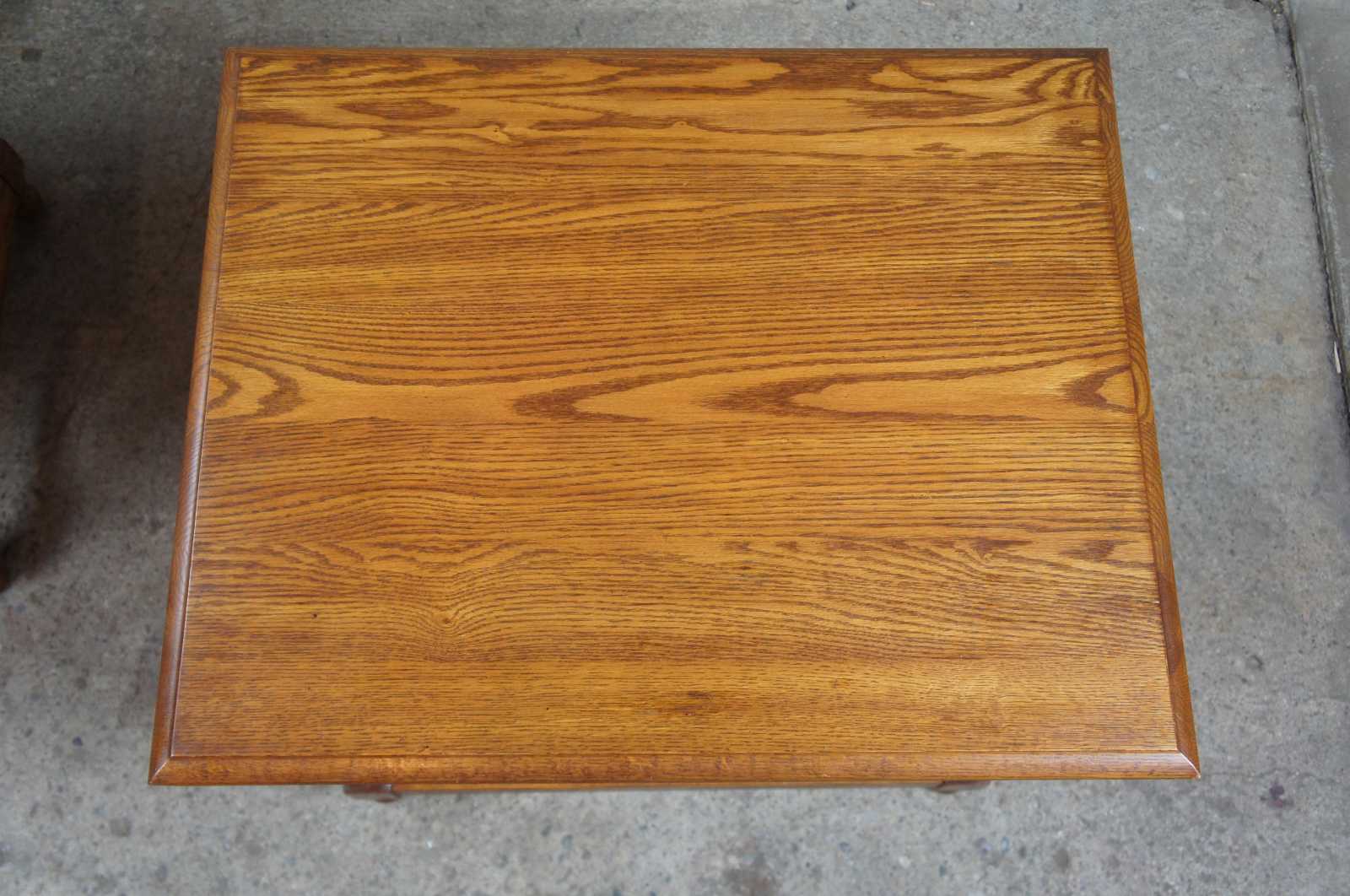 Oak end tables by Pennsylvania House. This rectangular table features a single drawer and a serpentine apron; the drawer is equipped with a brass tone knob pull and is marked “Pennsylvania House” to the interior.