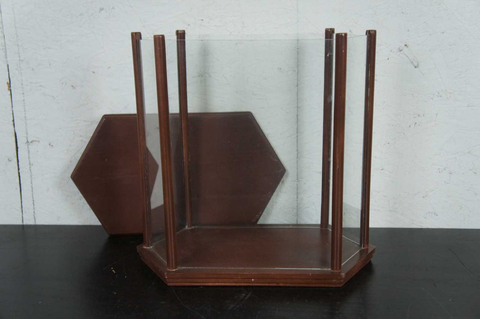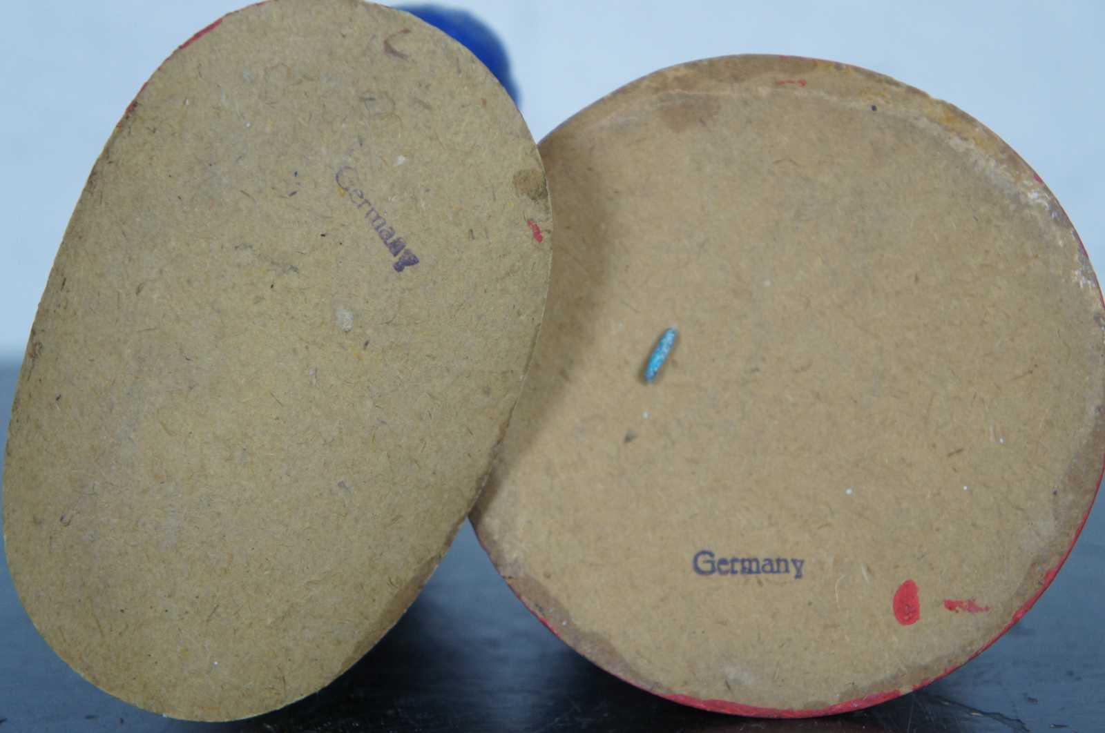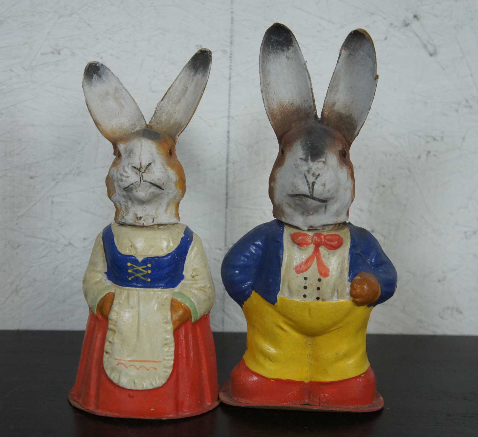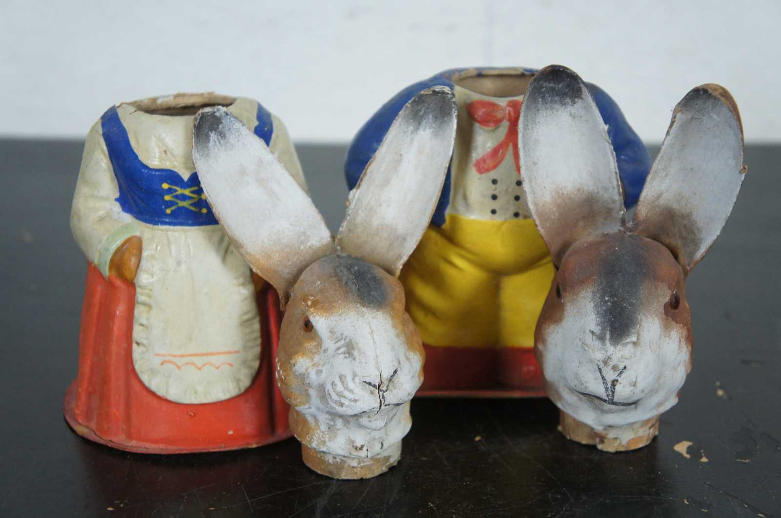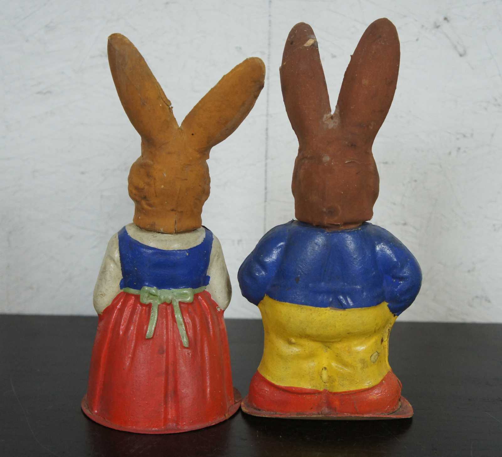 Pair of antique German paper mache, painted folk art rabbit / easter bunny Mr. & Mrs. figurines candy containers dressed in red, yellow and blue outfits and housed in a wood and glass display case.