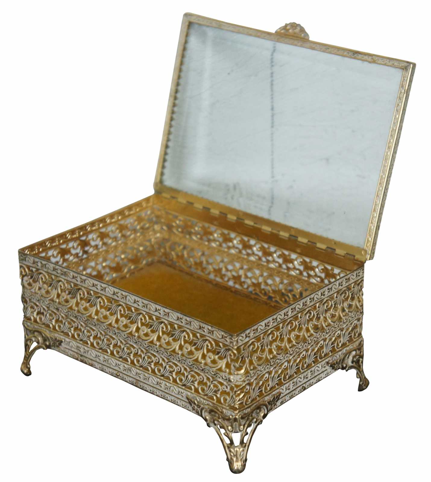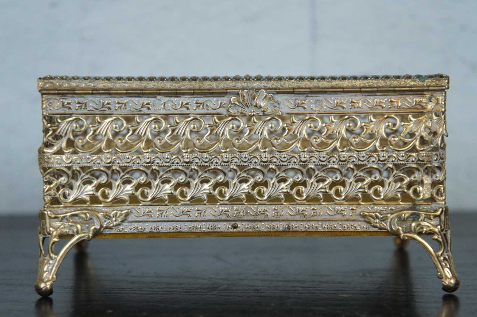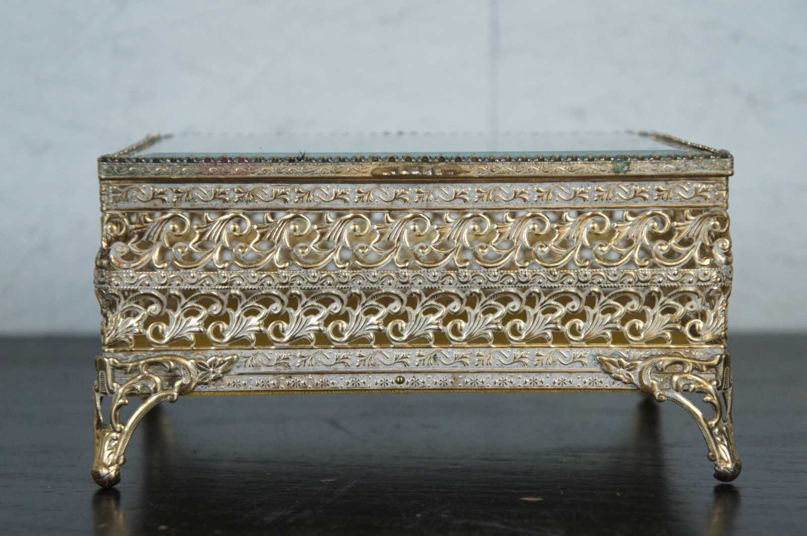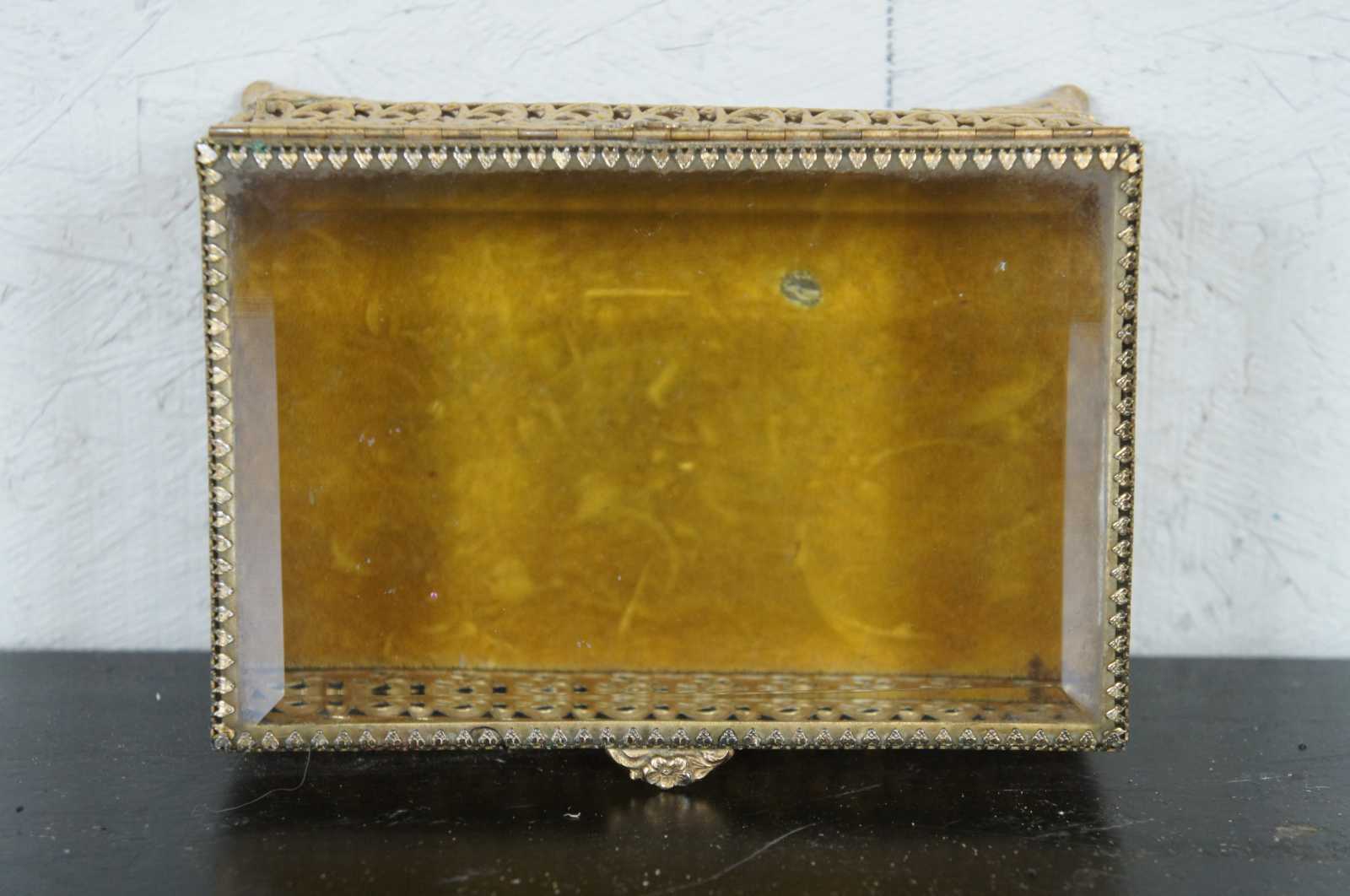 Antique French Regency Brass Filigree Jewelry Casket Trinket Box w Beveled Glass