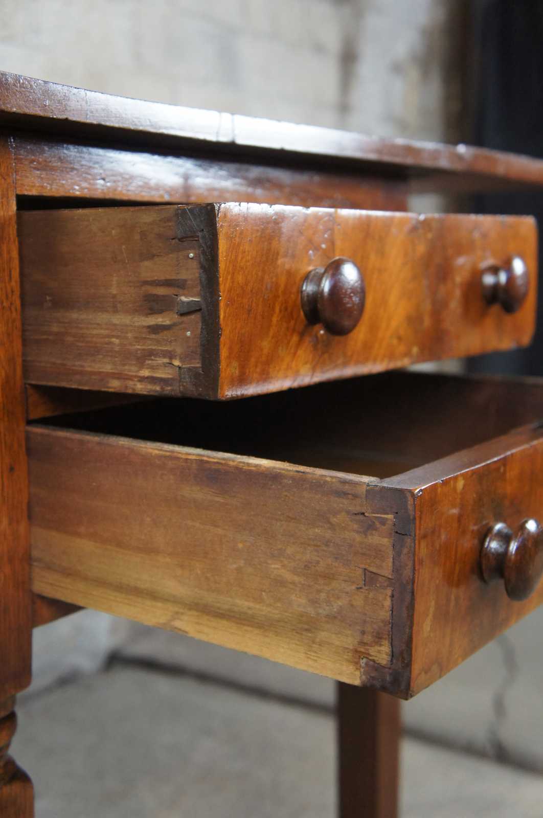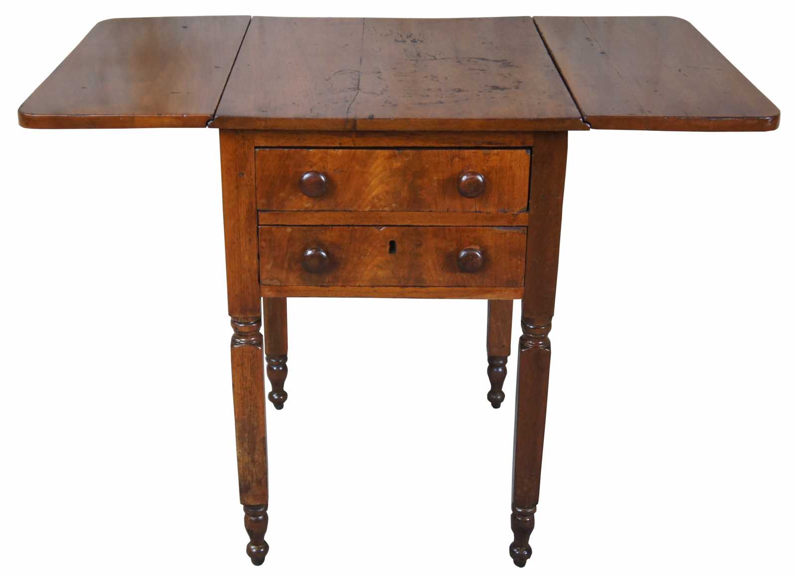 Mid 19th century Federal / early American style drop leaf side table. Features two hand dovetailed drawers with a crotch walnut veneer supported by four square legs leading to turned feet.