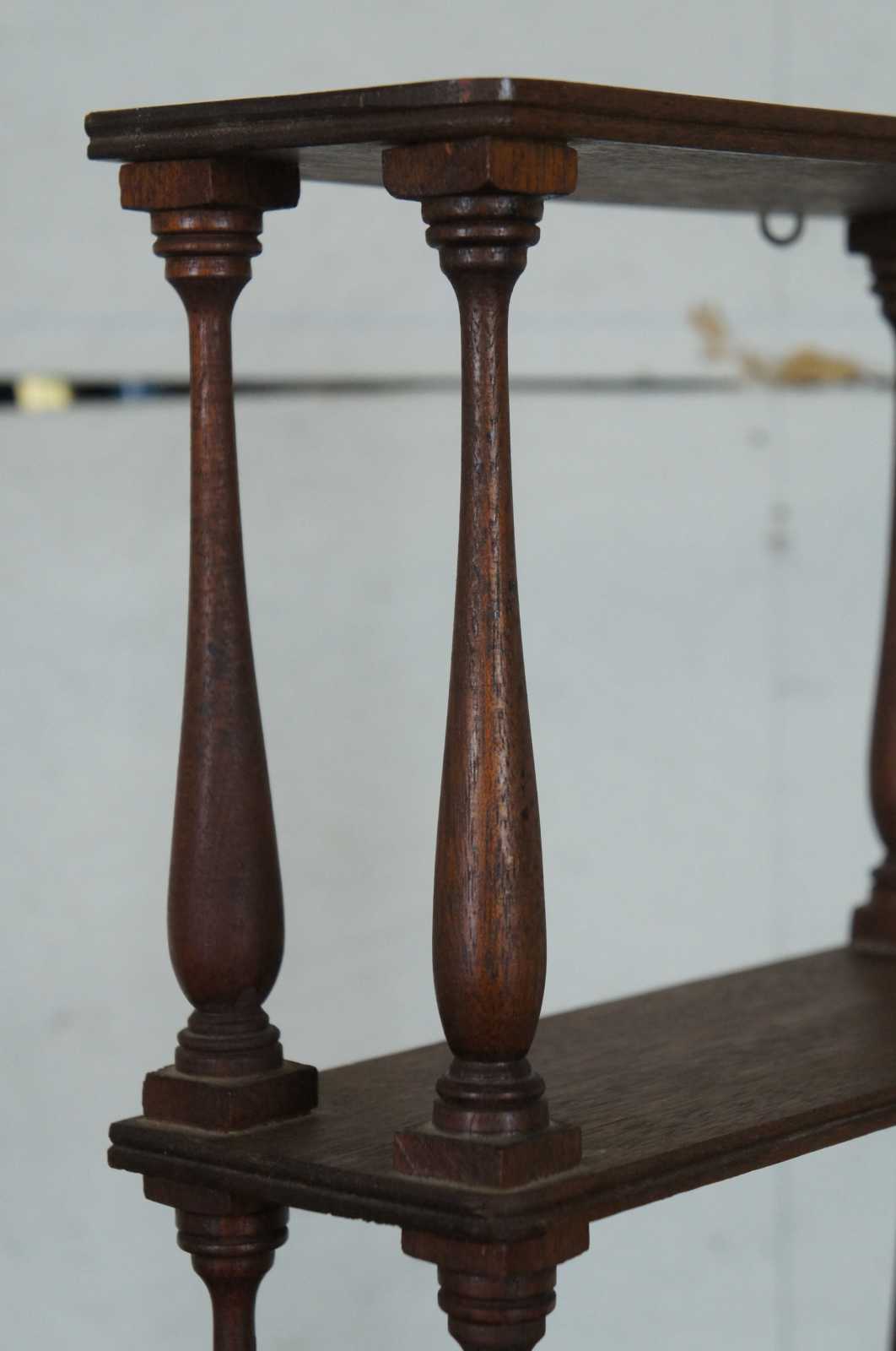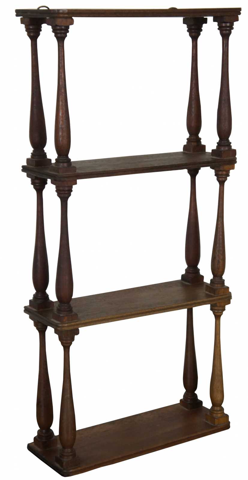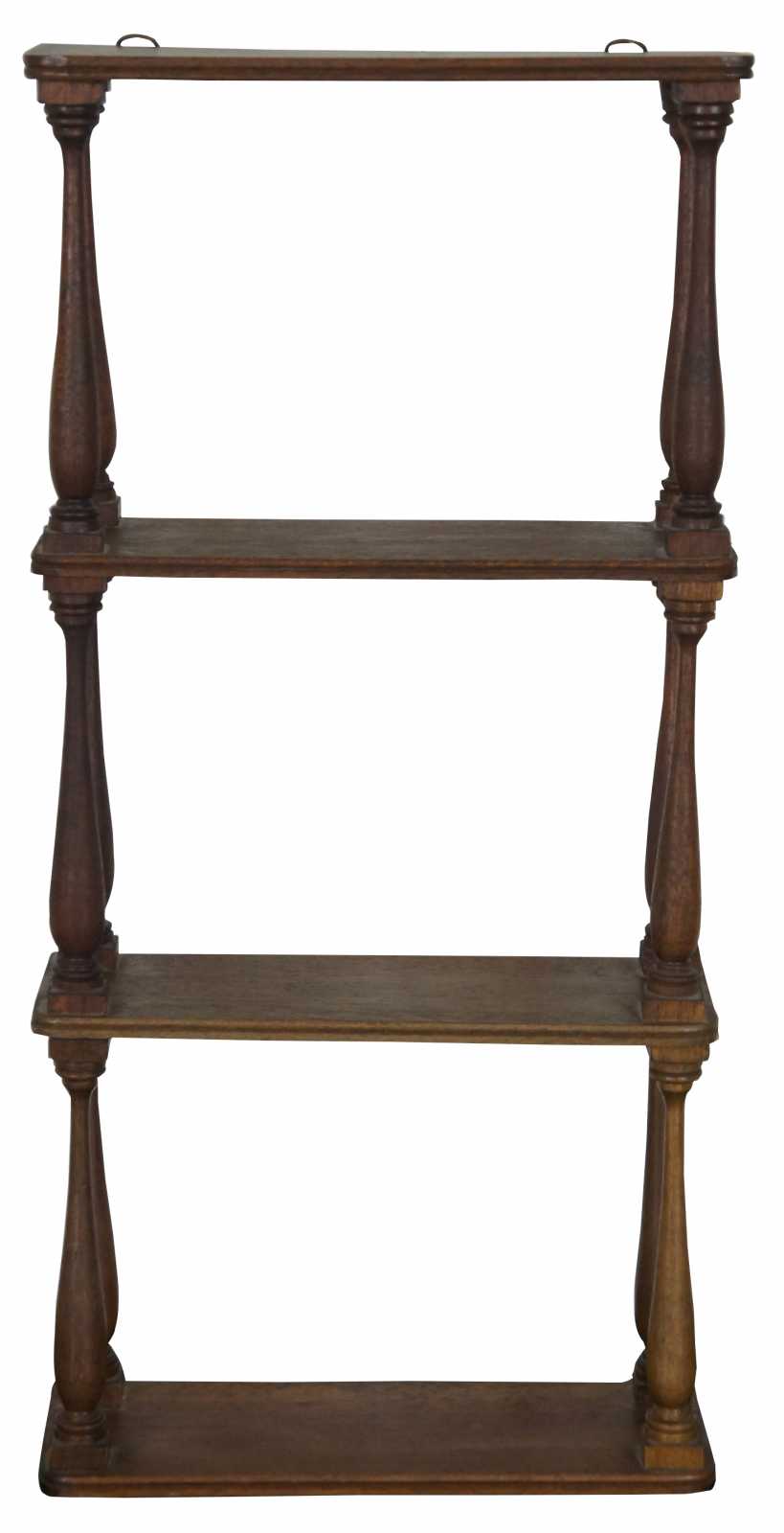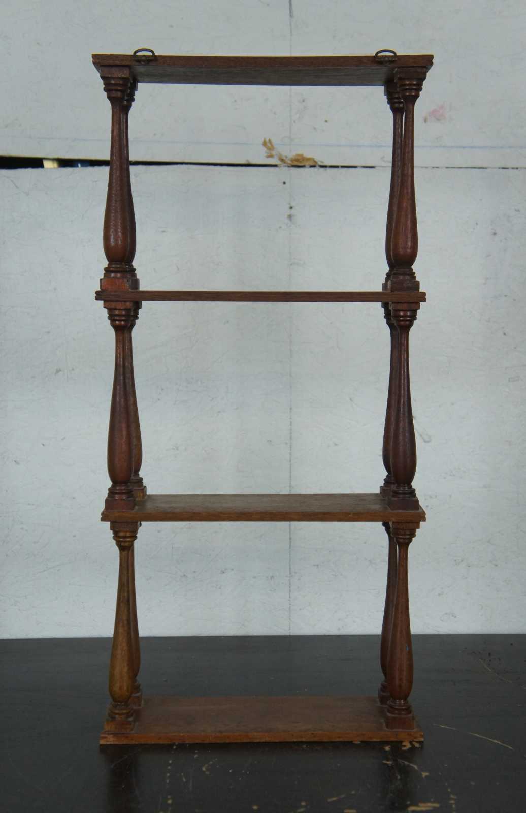 Antique walnut early American wall hanging etagere curio shelf unit with four tiers supported on turned spindle columns.