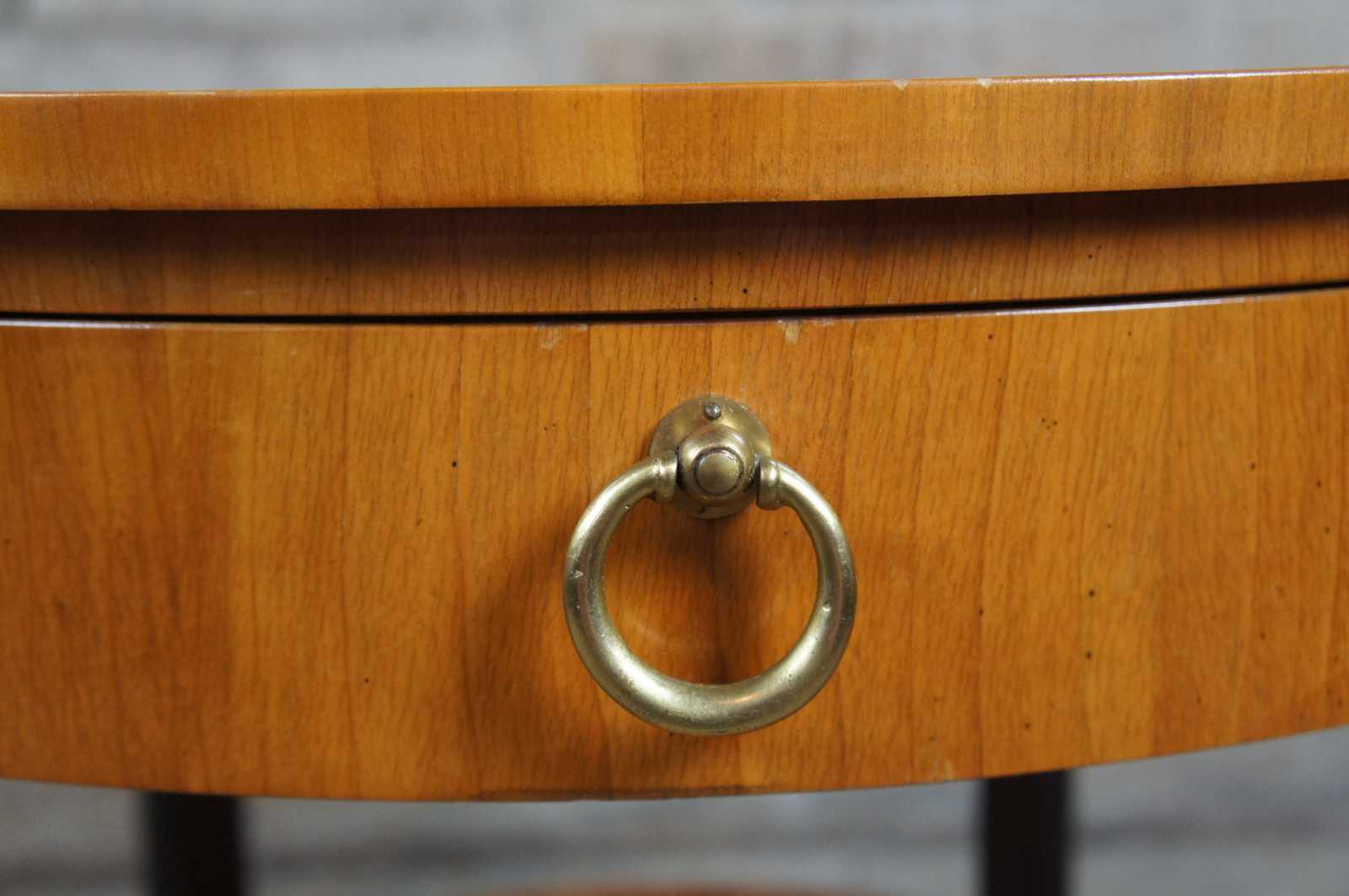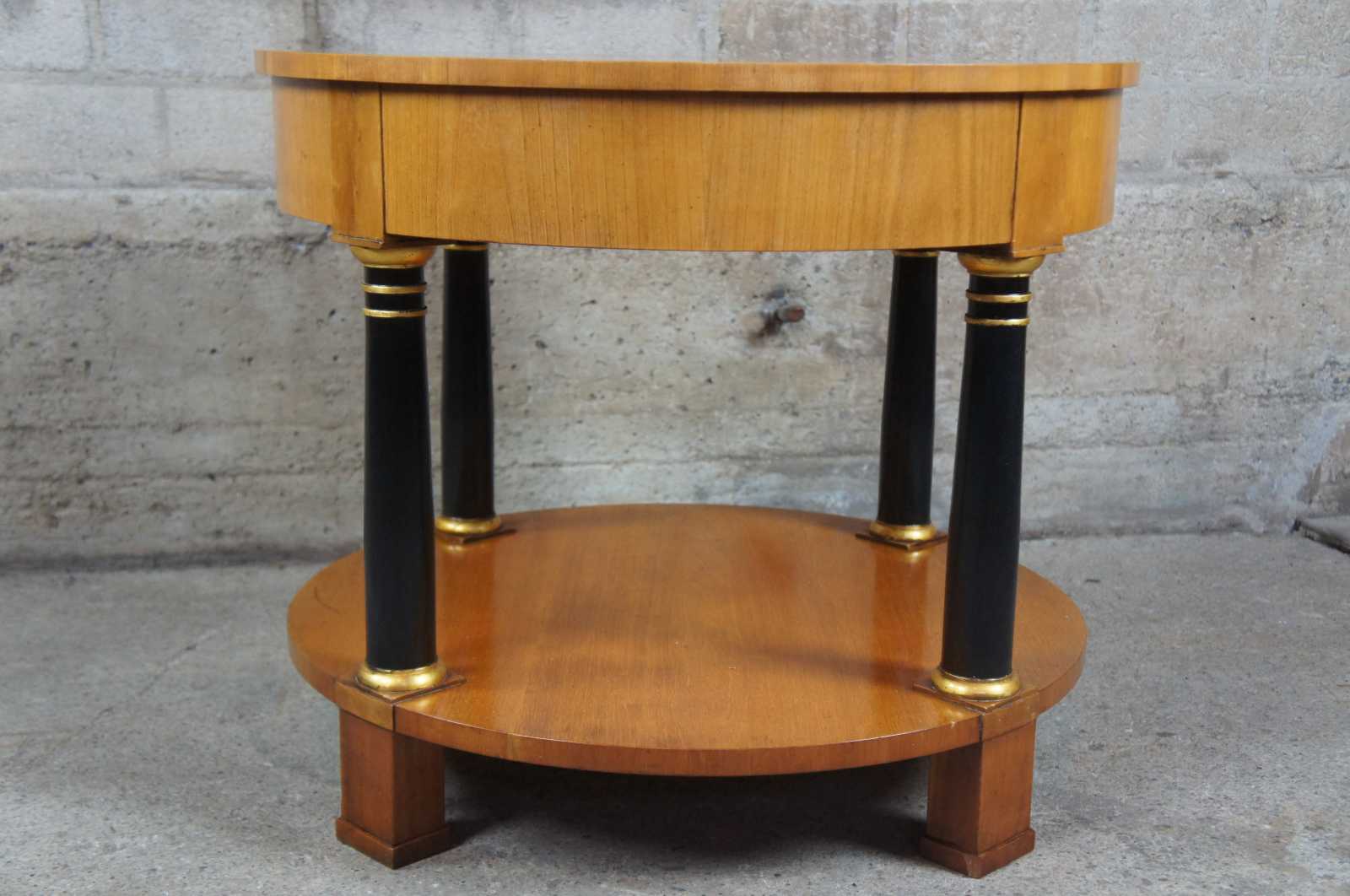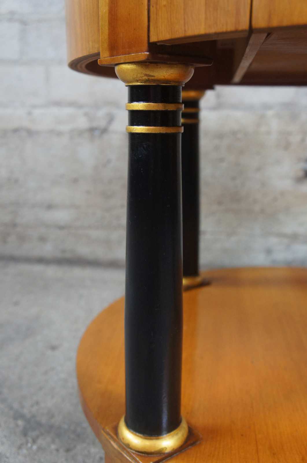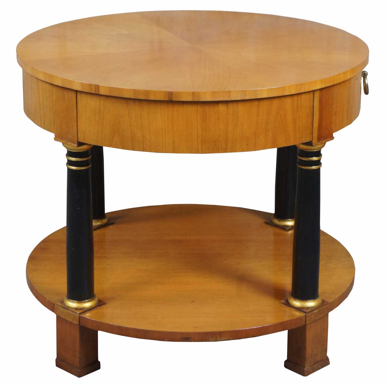 Circa 1960s Baker Furniture French Empire Fruitwood side table. Feature a round two tier design supported by ebonized columns with gold trim. Includes upper drawer with knocker pull.