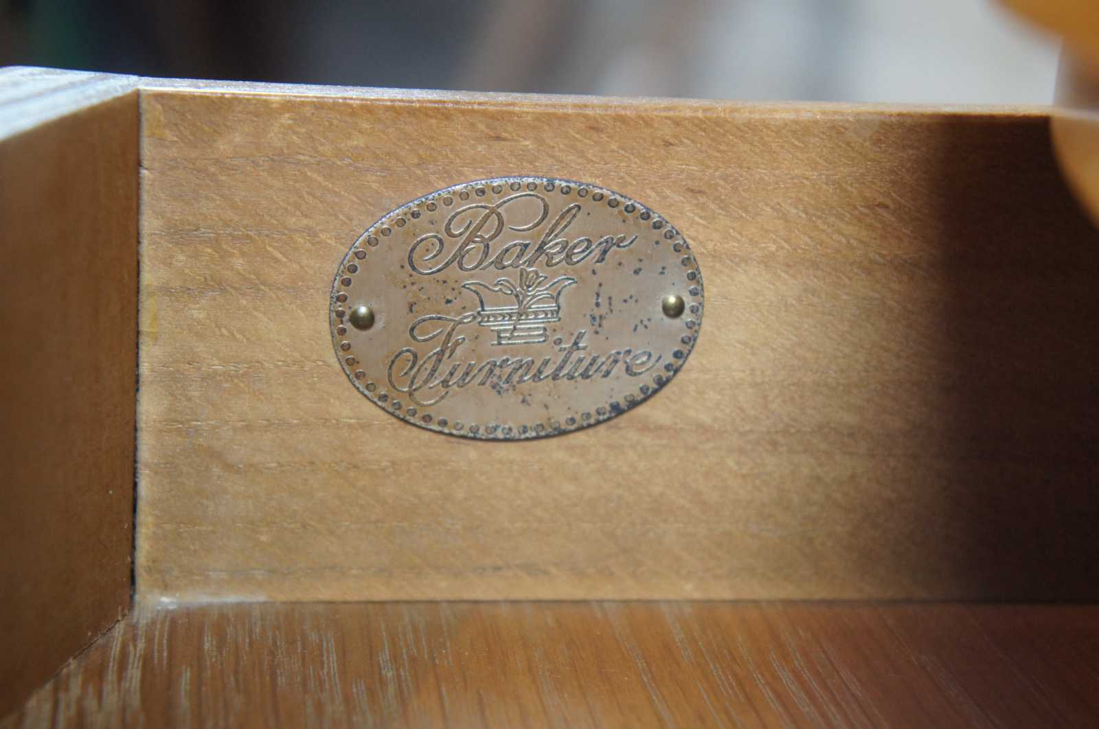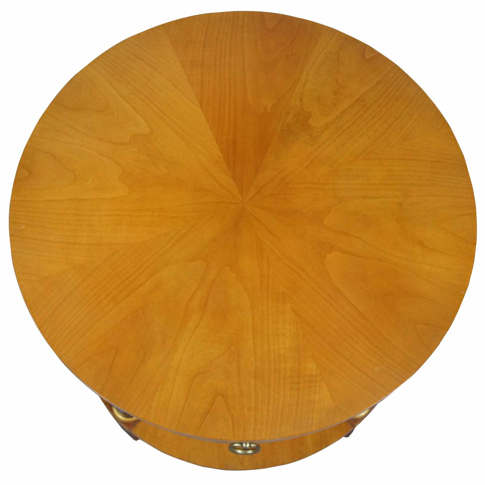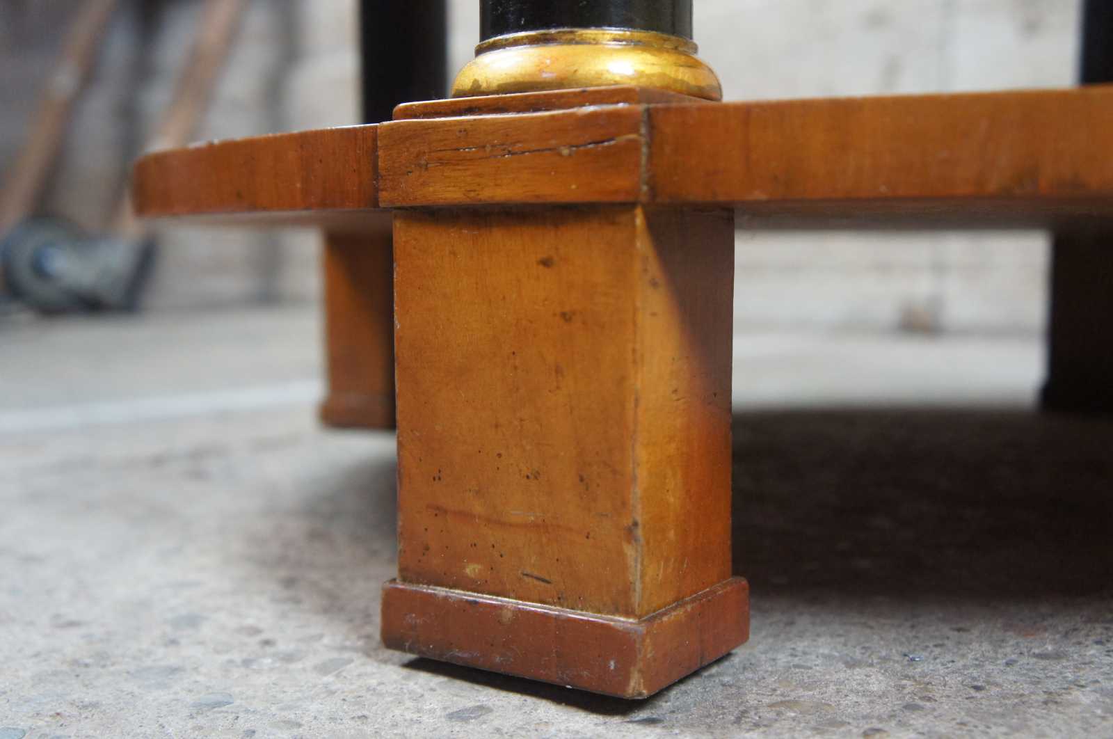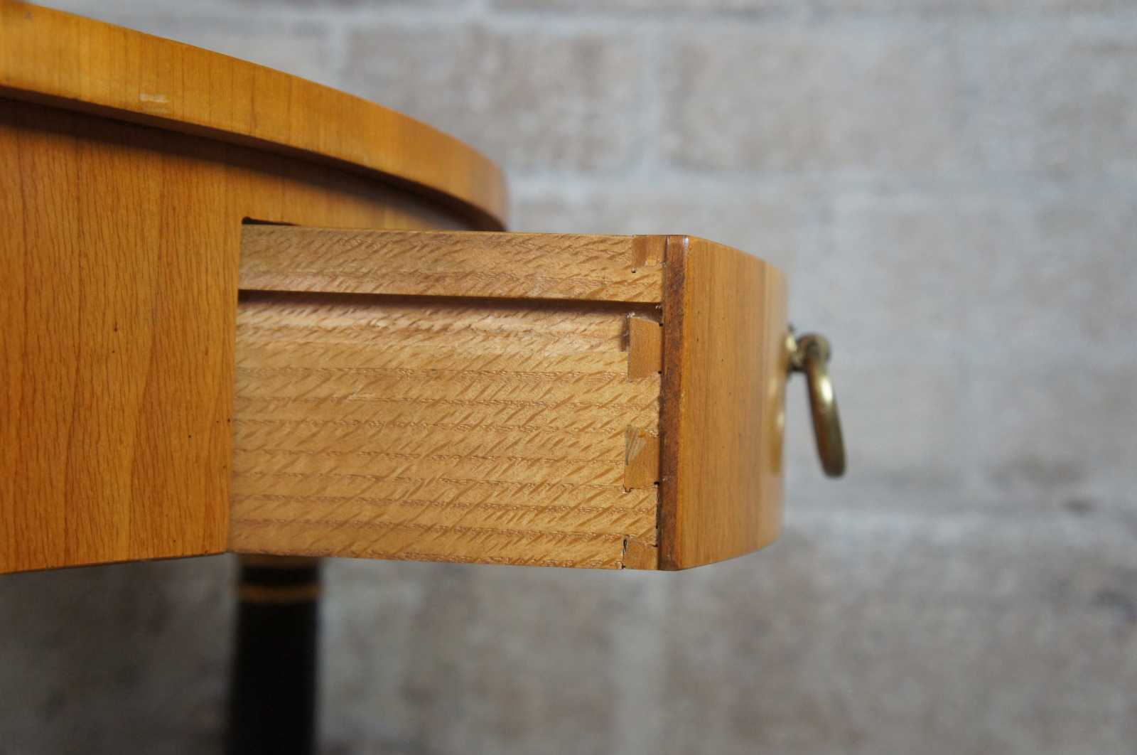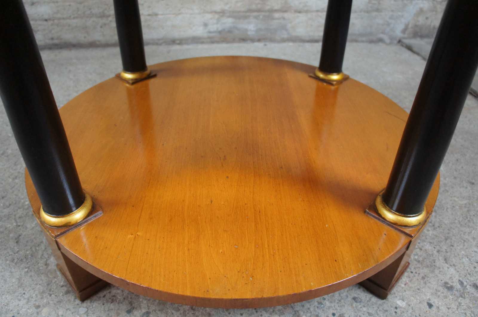 Circa 1960s Baker Furniture French Empire Fruitwood side table. Feature a round two tier design supported by ebonized columns with gold trim. Includes upper drawer with knocker pull.