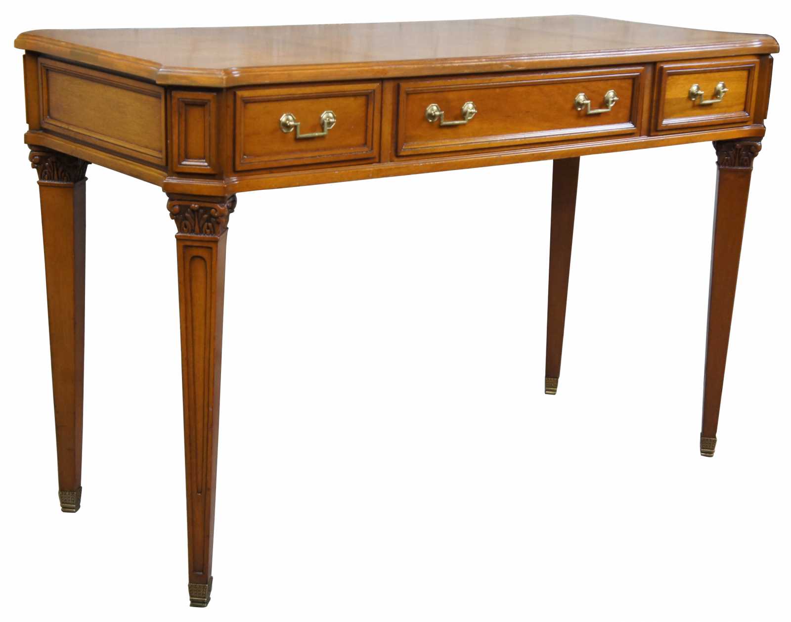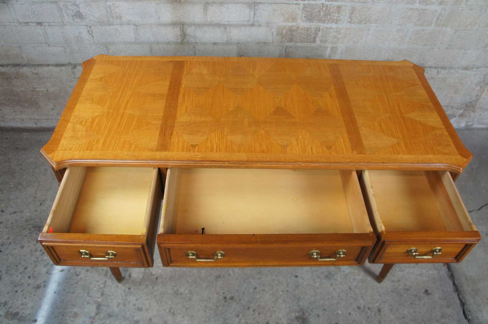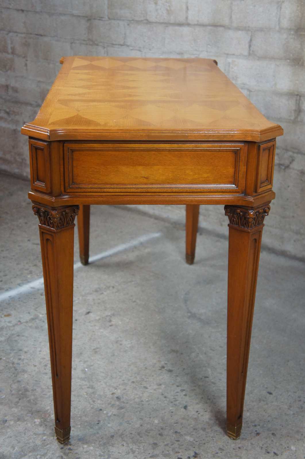 Circa 1960s Neoclassical inspired desk by Baker Furnireu. Made from walnut with a parquetry diamond designed top over three drawers and tapered corinthian carved legs leading to brass capped feet.