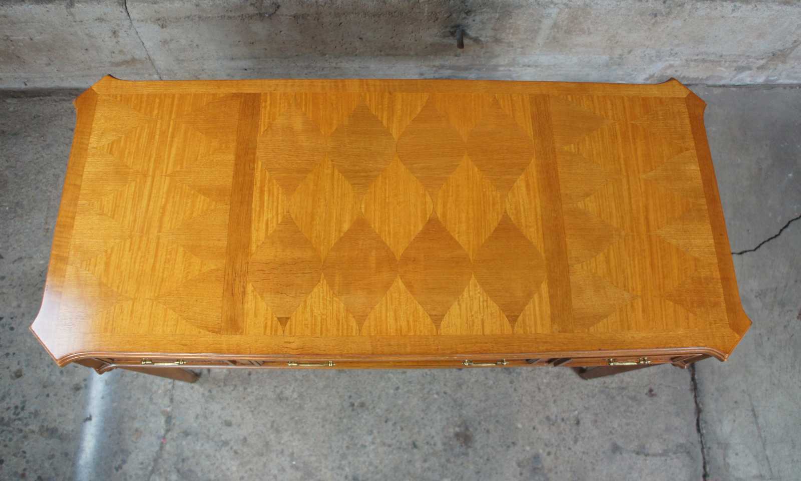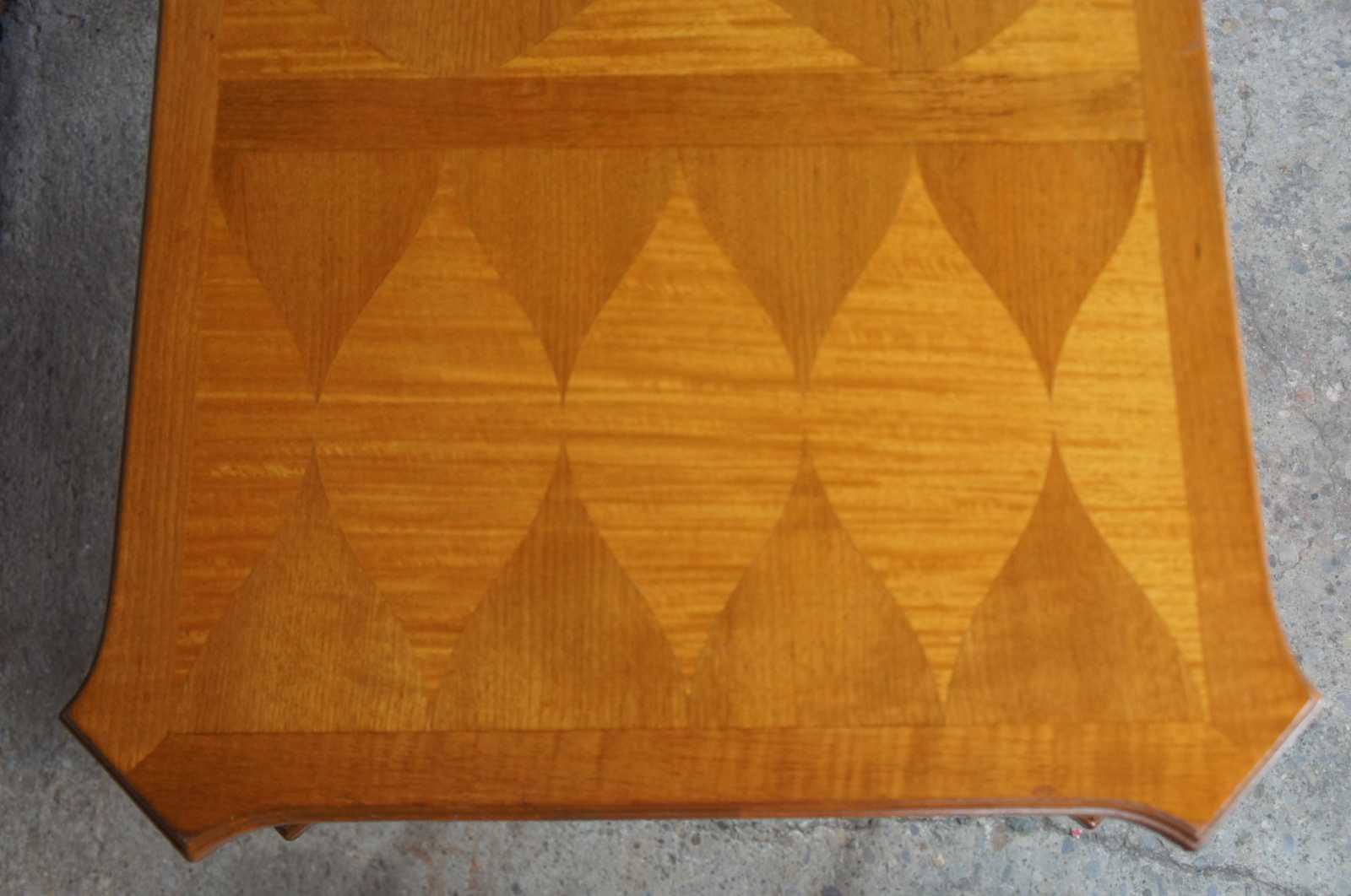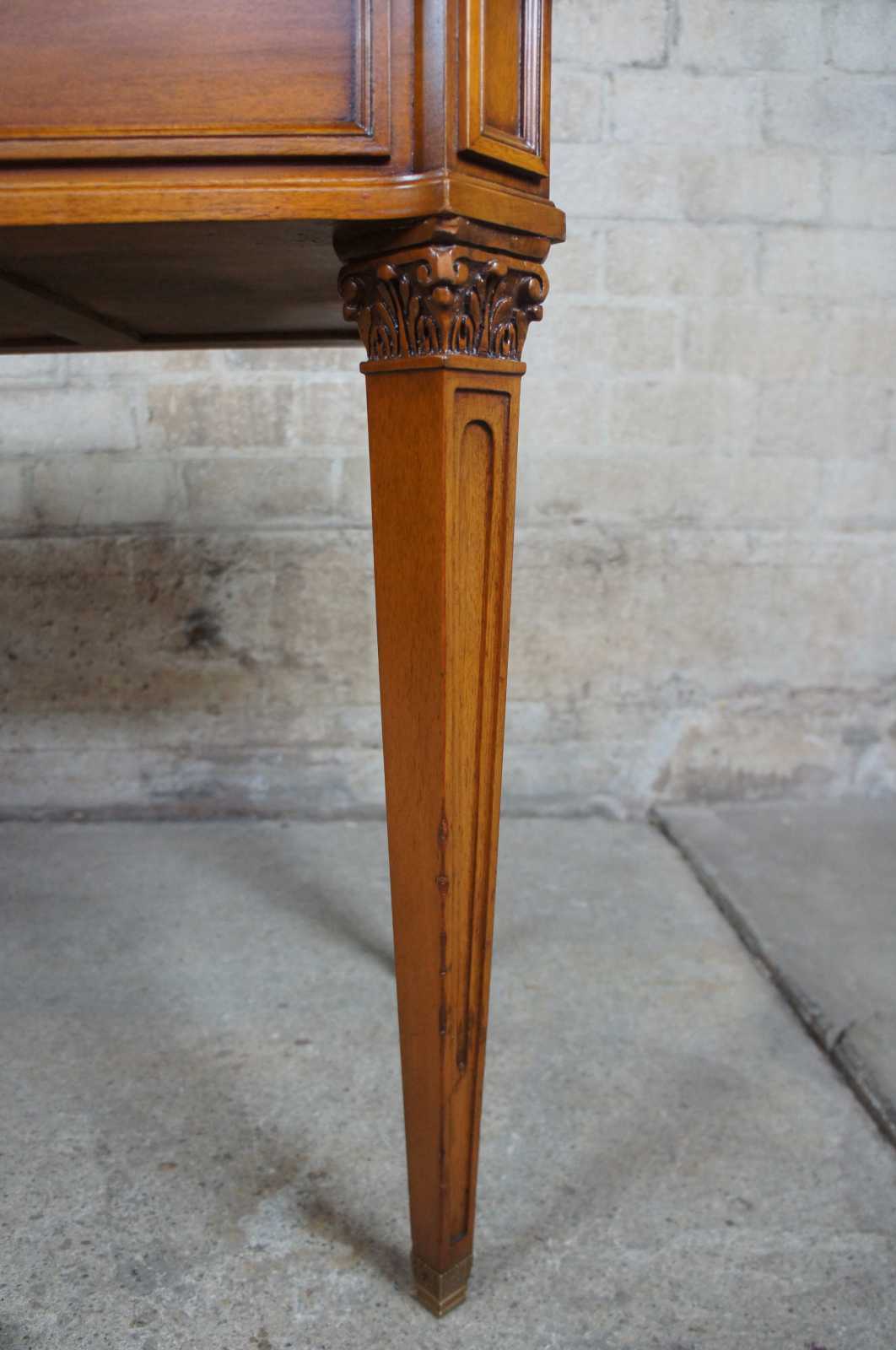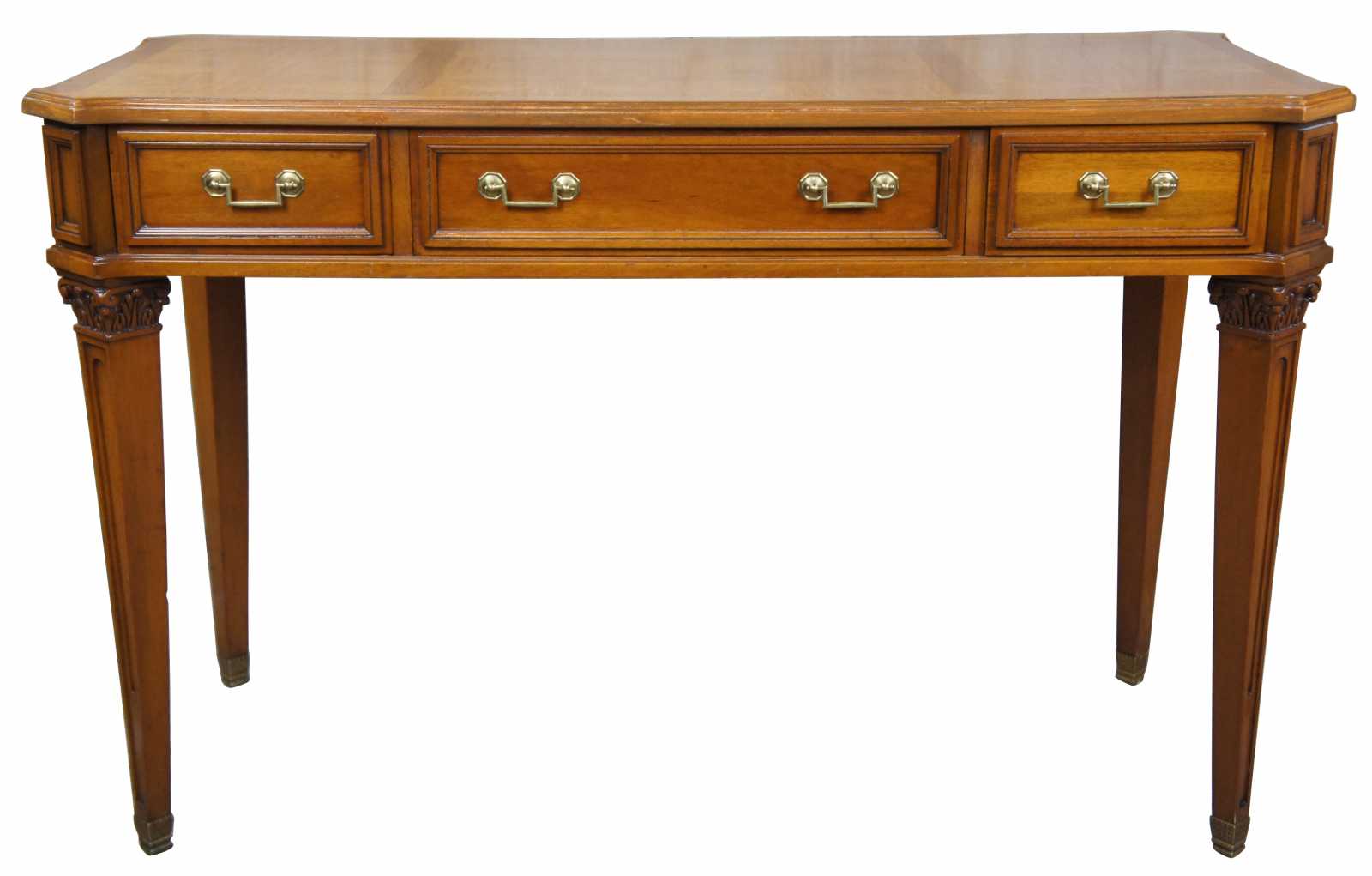 Circa 1960s Neoclassical inspired desk by Baker Furnireu. Made from walnut with a parquetry diamond designed top over three drawers and tapered corinthian carved legs leading to brass capped feet.