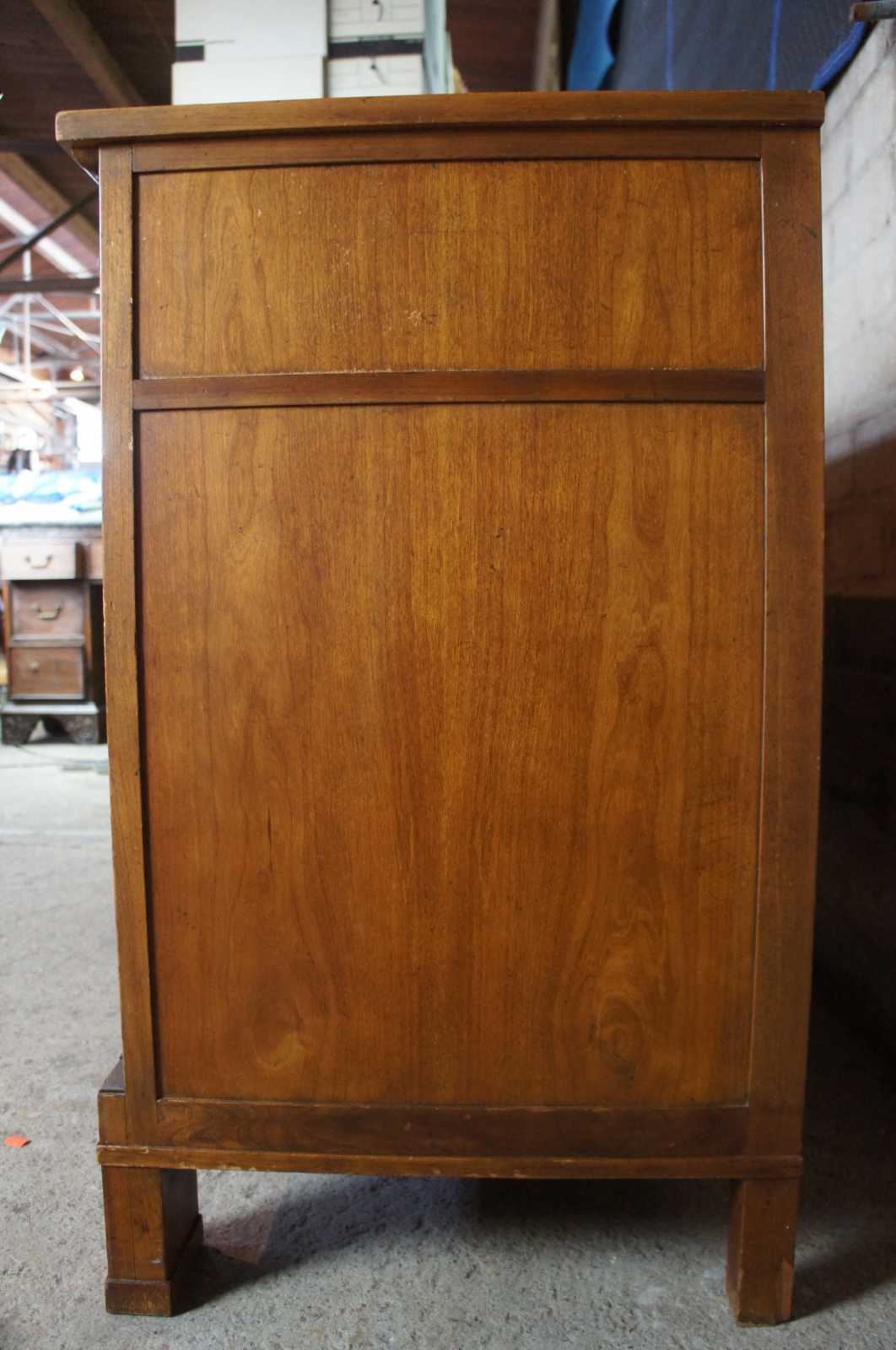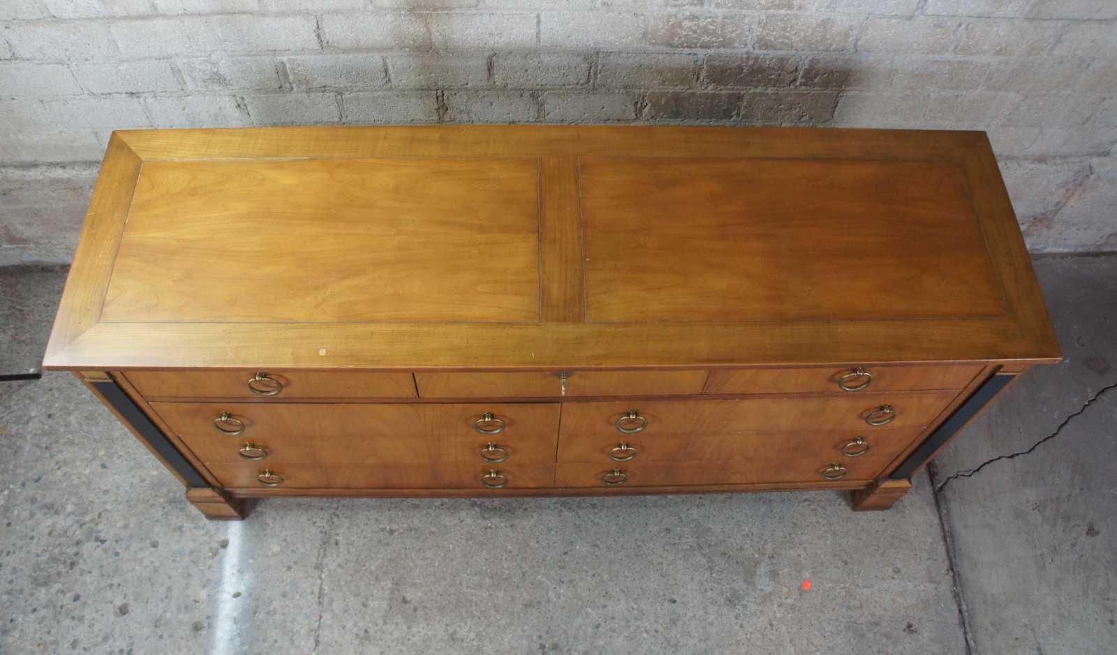 Circa 1960s Baker Furniture Neoclassical inspired chest of drawers. Made from Fruitwood with ebonized mounts along the outside, nine drawers and brass hardware.
