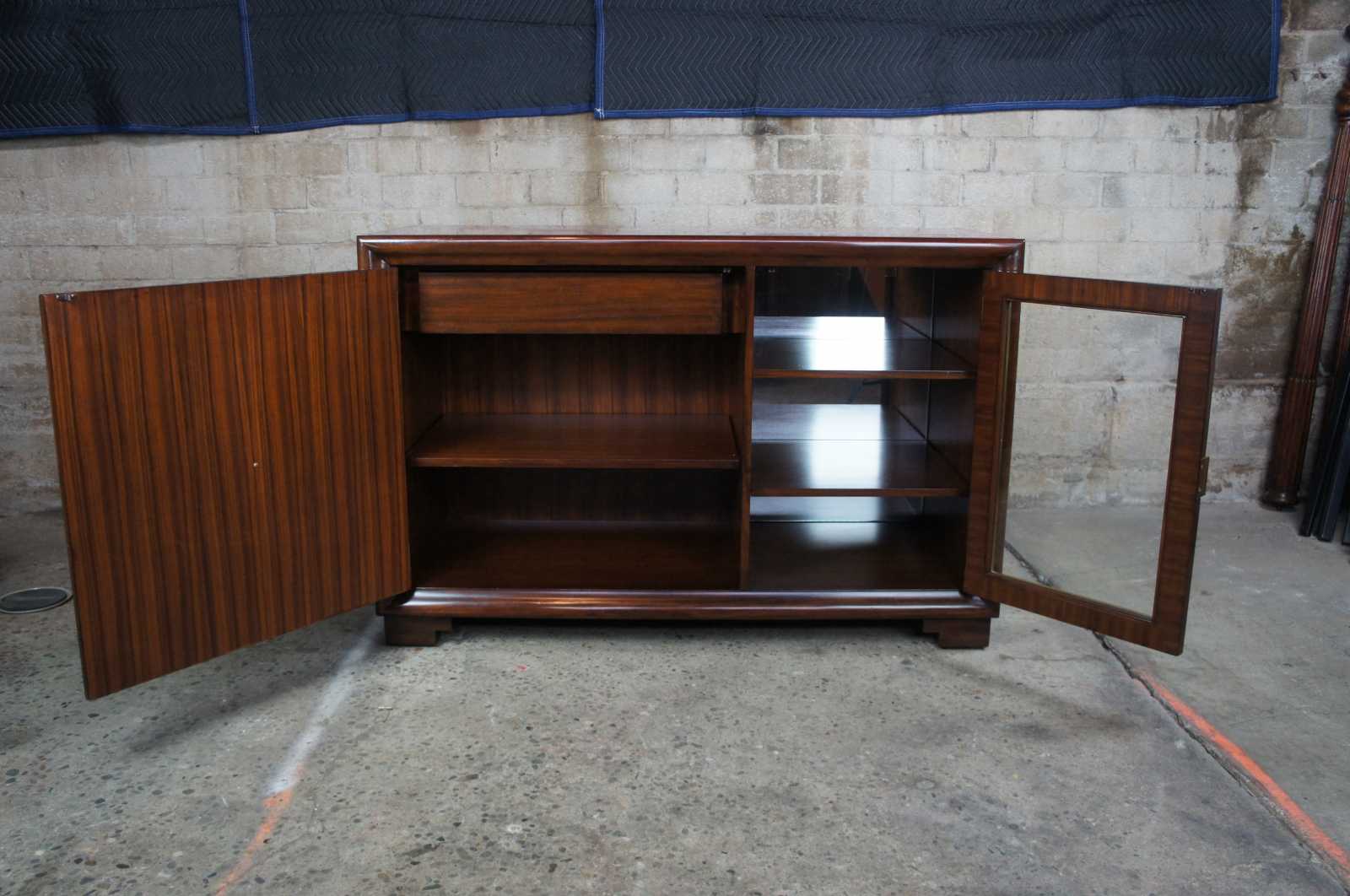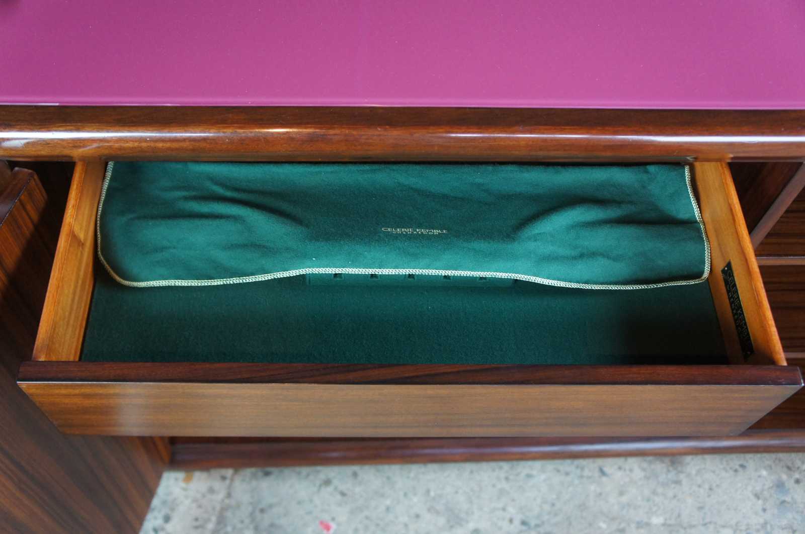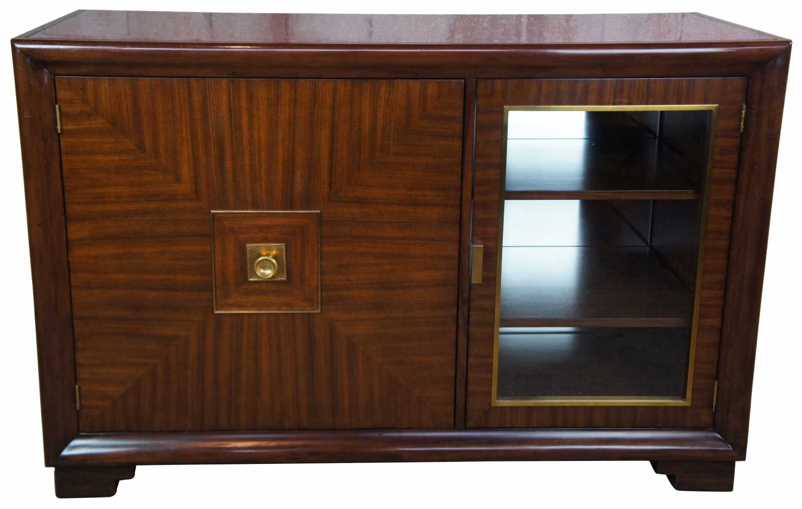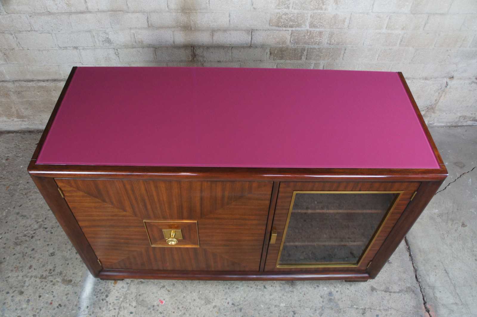 The Henredon Celerie Kemble Andrew Server features an asymmetric front divided into one large cabinet with drawers and a glass front. Made from rosewood veneers that add a geometric touch on the server front. The top is covered with a maroon glass (glass slides off for customization) surface for serving. Gold trim lines cabinet doors.Cabinet fronts have molded borders. First drawer has dividers for cutlery. Hardware is soft brass.. Celebrated interior designer Celerie Kemble has come to be recognized for her casual, elegant approach, and her equal dedication to both comfort and quality. Greatly inspired from a young age by her mother and partner in Kemble Interiors, Mimi Maddock McMakin, who instilled in her an appreciation and eye for antiques, quality construction, and interior décor, Celerie Kemble furnishings are representative of a lifetime engaged in home decoration, and a two-decade career in interior design. Celerie advocates for quality over expediency, reflected in her homeware collections that include furniture, lighting, and accessories. Her unique aesthetic and aptitude for elegant design have led to numerous significant brand collaborations, including Schumacher, Merida, and Arteriors, among others. Despite the broad range of products produced under Celerie Kemble’s label, quality and timeless elegance are immutable factors in every piece.