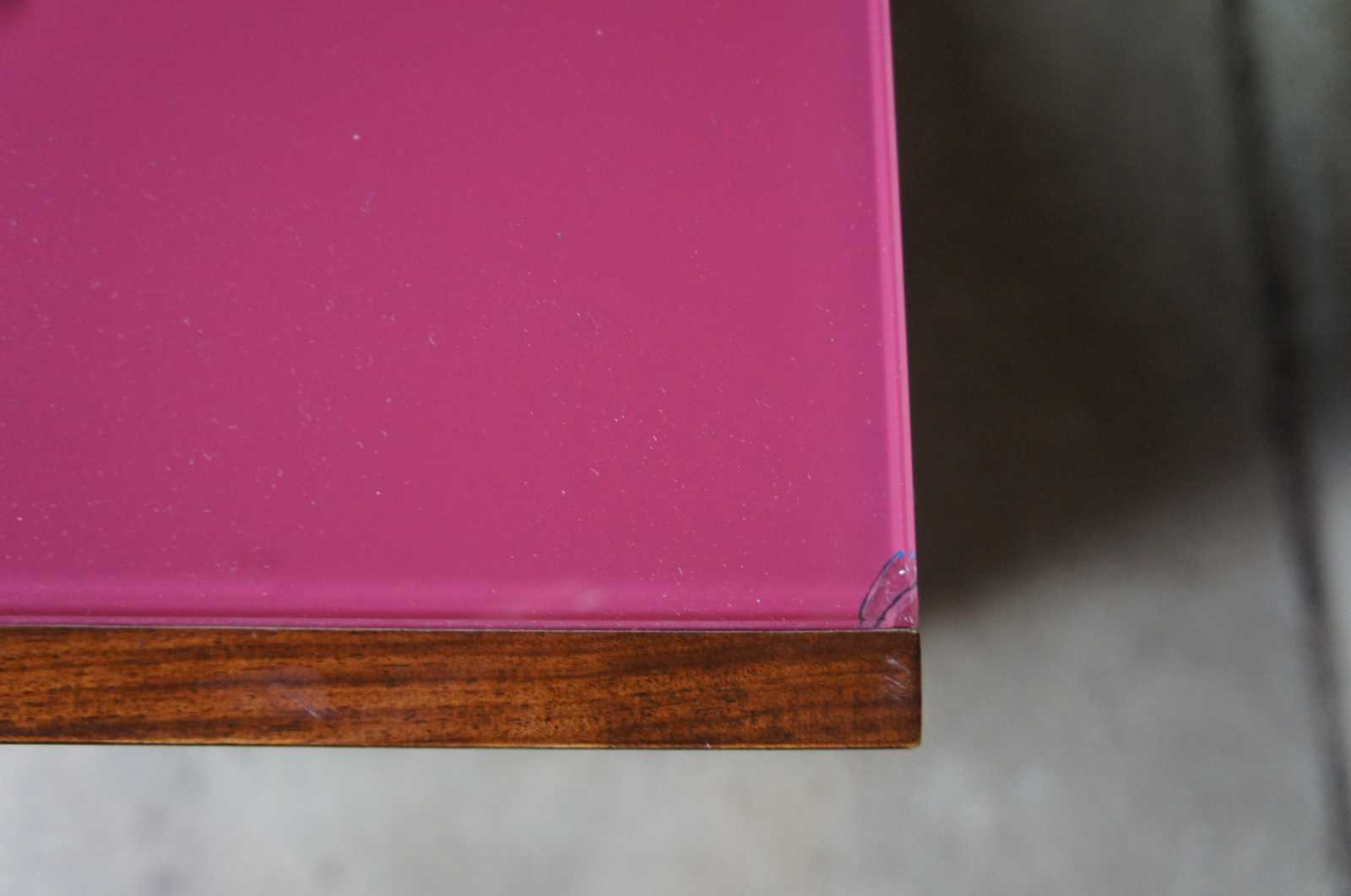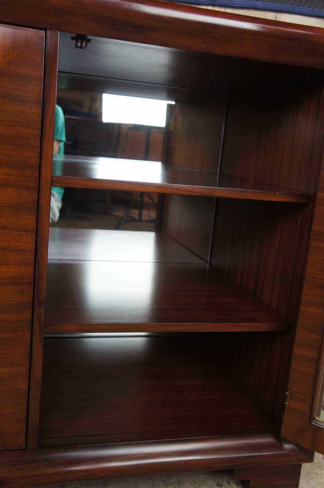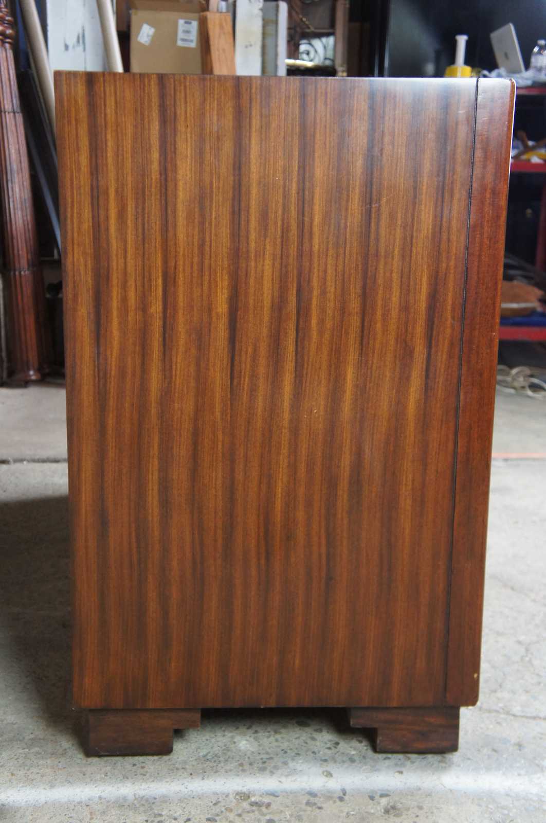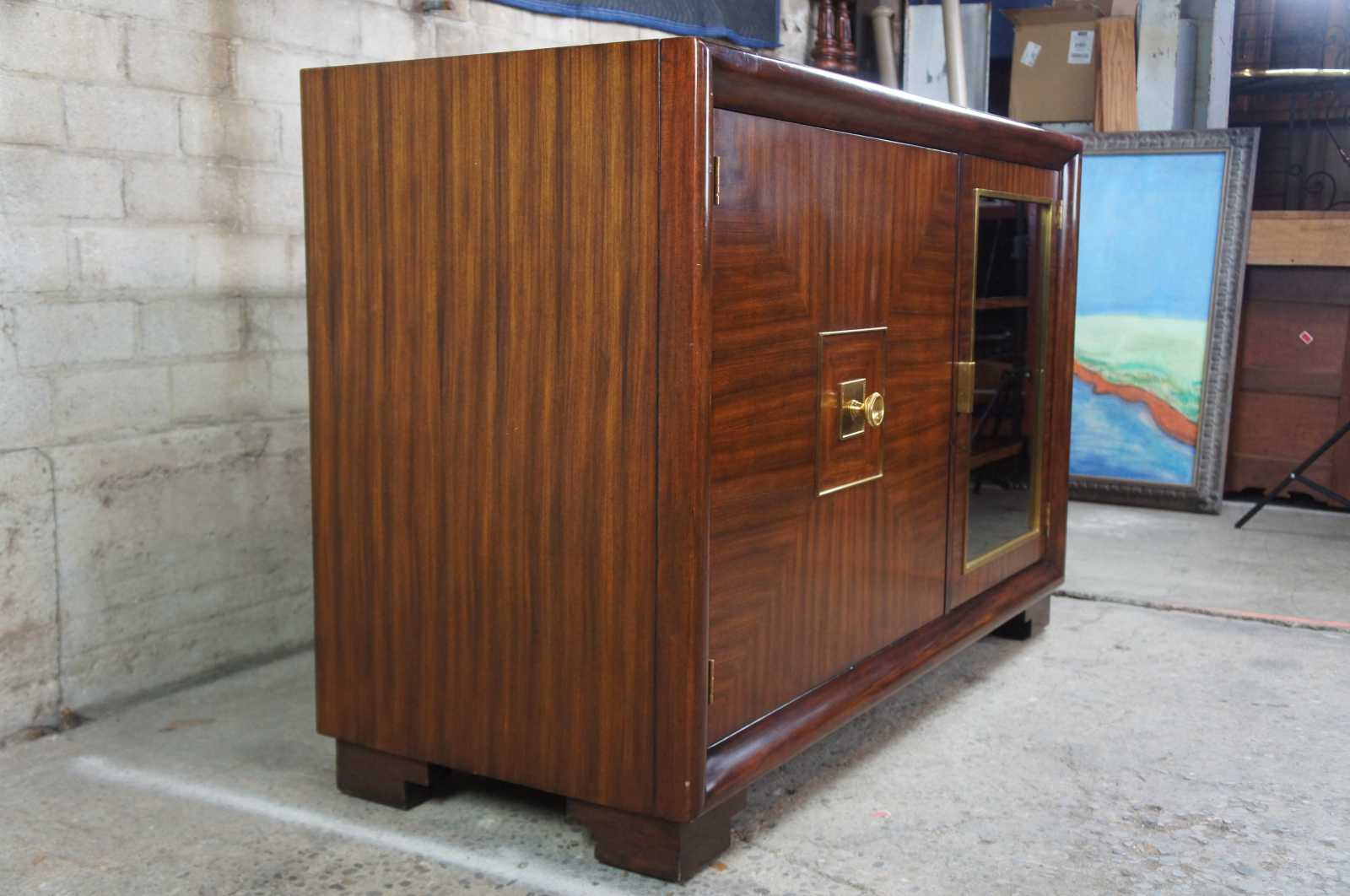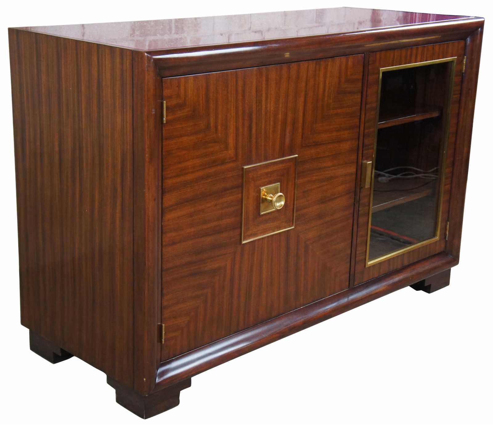 The Henredon Celerie Kemble Andrew Server features an asymmetric front divided into one large cabinet with drawers and a glass front. Made from rosewood veneers that add a geometric touch on the server front. The top is covered with a maroon glass (glass slides off for customization) surface for serving. Gold trim lines cabinet doors.Cabinet fronts have molded borders. First drawer has dividers for cutlery. Hardware is soft brass.. Celebrated interior designer Celerie Kemble has come to be recognized for her casual, elegant approach, and her equal dedication to both comfort and quality. Greatly inspired from a young age by her mother and partner in Kemble Interiors, Mimi Maddock McMakin, who instilled in her an appreciation and eye for antiques, quality construction, and interior décor, Celerie Kemble furnishings are representative of a lifetime engaged in home decoration, and a two-decade career in interior design. Celerie advocates for quality over expediency, reflected in her homeware collections that include furniture, lighting, and accessories. Her unique aesthetic and aptitude for elegant design have led to numerous significant brand collaborations, including Schumacher, Merida, and Arteriors, among others. Despite the broad range of products produced under Celerie Kemble’s label, quality and timeless elegance are immutable factors in every piece.